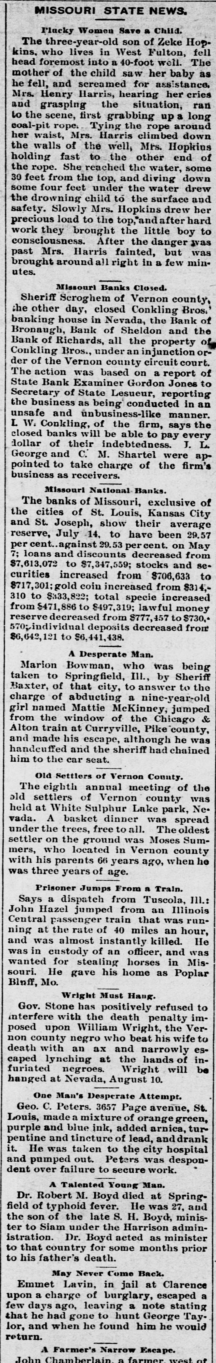MISSOURI STATE NEWS. Flacky Women Save a Child. three-year-old son of Zeke Hope fell The who lives in West Fulton, The head kins. foremost into a 40-foot well. mother of the child saw her baby as fell, and screamed for assistance. cries he Mrs. Henry Harris, hearing her ran and grasping the situation, to the scene, first grabbing up a long rope. Tying the rope around down coal-pit waist, Mrs. Harris climbed her of the well, Mrs. Hopkins fast to the other She reached the holding the walls water, end some of from the top, and four feet under the the some feet rope. diving water down the child to the Mrs. Hopkins load to the to safety. precious drowning Slowly top,andafter surface drew boy drew hard and her work they brought the little consciousness. After the danger was was Mrs. Harris fainted, but minutes. past brought around all right in a few Missouri Banks Closed. Sheriff Seroghem of Vernon county, other day, closed Conkling Bros. house in Nevada, the of banking the the and Bank Bank of Sheldon of Richards, all the of Bros., under an Bronaugh, Conkling Bank injunction or- property court. der of the Vernon county circuit of The action was based on a report Examiner Gordon Jones to of State Lesueur, as being an State the Secretary business Bank conducted reporting in and unbusiness-like manner. of the firm, says the L closed unsafe W. Conkling, J. banks will be able to pay every L. dollar of their indebtedness. George and C. M. Shartel were appointed to take charge of the firm's business as receivers. Missouri National Banks. The banks of Missouri, exclusive of the cities of St. Louis, Kansas City and St. Joseph, show their average reserve, July 14, to have been 29.57 against 29.53 percent. on May loans and discounts decreased from $7,613,072 7: to $7,347,559; stocks and securities increased from $706,633 to $717,301; coin increased from $314,310 to $333,822; total specie increased from $471,886 to $497,319; lawful money reserve decreased from $777, 457 to $730, 570;individual deposits decreased from $6,642,121 to $6,441,438. A Desperate Man. Marion Bowman, who was being taken to Springfield, Ill., by Sheriff the Baxter, of that city, to answer to charge of abducting a nine-year-old girl named Mattie McKinney, jumped & from the window of the Chicago Alton train at Curryville, Pike county, and made his escape, although he was handcuffed and the sheriff had chained him to the car seat. Old Settlers of Vernon County. The eighth annual meeting of the old settlers of Vernon county was held at White Sulphur Lake park, Ne. vada. A basket dinner was spread the trees, free to all. The oldest on the ground was who located in settler mers, under Vernon Moses county Sum- he with his parents 66 years ago, when was three years of age. Prisoner Jumps From a Train. Says a dispatch from Tuscola, Ill.: Hazel jumped from an Illinois train was Central John passenger that hour, running at the rate of 40 miles an and was almost instantly killed. He in of an was was custody officer, and in Miswanted for stealing horses souri. He gave his home as Poplar Bluff, Mo. Wright Must Hang. Gov. Stone has positively refused to interfere with the death penalty imWilliam Wright, non negro who beat to posed county upon his the wife Verdeath with an ax and narrowly in- escaped lynching at the hands of furiated negroes. Wright will be hanged at Nevada, August 10. One Man's Desperate Attempt. C. Peters. 3657 Page avenue, St. made a mixture of orange green, and blue ink, added Louis, Geo. arnica, tur and tincture of lead, and He was taken to the city purple it. pentine hospital drank and pumped out. Peters was despondent over failure to secure work. A Talented Young Man. Dr. Robert M. Boyd died at Springfield of typhoid fever. He was 27, and of the late S. H. Boyd, minisSiam under the Dr. Boyd acted as istration. ter the to son Harrison minister adminto that country for some months prior to his father's death. May Never Come Back. Emmet Lavin, in jail at Clarence a charge of burglary, escaped a few leaving a note that he had gone to hunt George upon days ago, stating would Taylor, and when he found him he return. A Farmer's Narrow Escape. Chamberlain a farmer west John