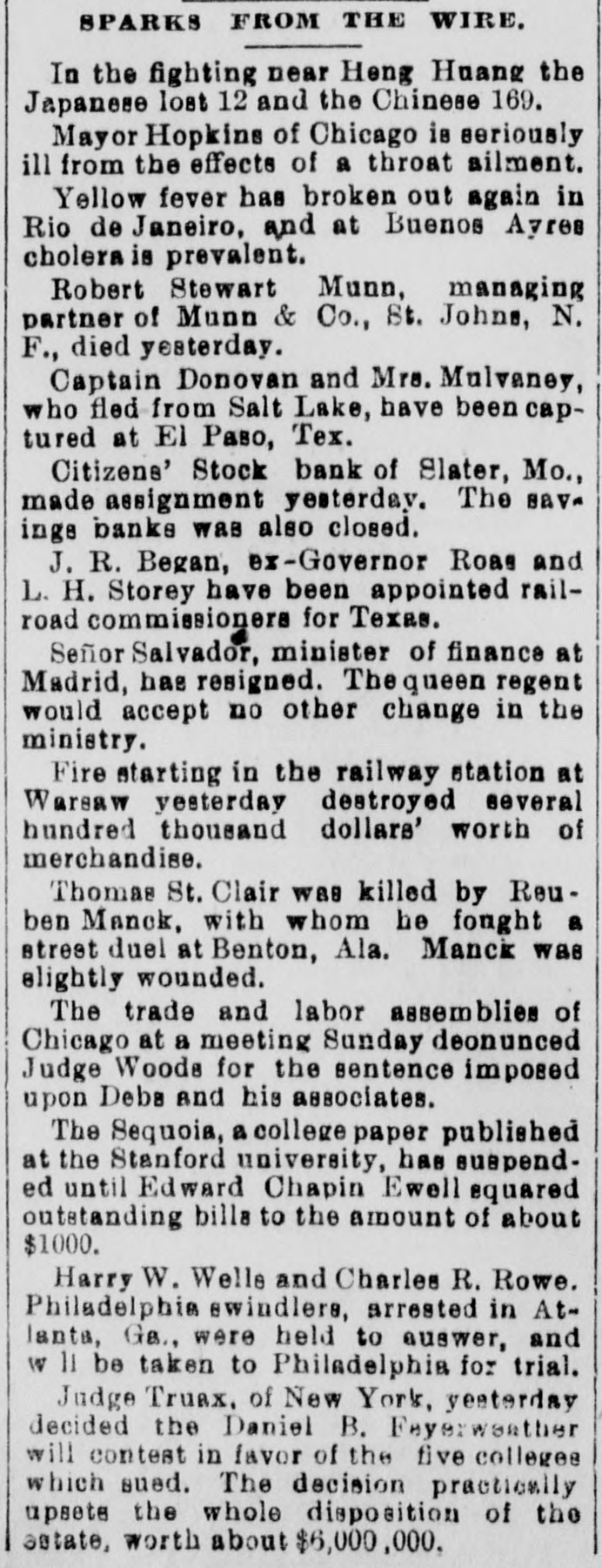 SPARKS FROM THE WIRE. In the fighting near Heng Huang the Japanese lost 12 and the Chinese 169. May or Hopkins of Chicago is seriously ill from the effects of a throat ailment. Yellow fever has broken out again in Rio de Janeiro, and at Buenos Ayree cholera is prevalent. Robert Stewart Munn, managing partner of Munn & Co., St. Johns, N. F., died yesterday. Captain Donovan and Mrs. Mulvaney, who fled from Salt Lake, have been captured at El Paso, Tex. Citizens' Stock bank of Slater, Mo., made assignment yesterday. The saya ings banks was also closed. J. R. Began, ex-Governor Roas and L. H. Storey have been appointed railroad commissioners for Texas. Señor Salvador, minister of finance at Madrid, has resigned. The queen regent would accept no other change in the ministry. Fire starting in the railway station at Warsaw yesterday destroyed several hundred thousand dollars' worth of merchandise. Thomas St. Clair was killed by Reuben Manck, with whom he fonght a street duel at Benton, Ala. Manck was elightly wounded. The trade and labor assemblies of Chicago at a meeting Sunday deonunced Judge Woods for the sentence imposed upon Debs and his associates. The Sequoia, a college paper published at the Stanford university, has suspended until Edward Chapin Ewell squared outstanding billa to the amount of about $1000. Harry W. Welle and Charles R. Rowe. Philadelphia ewindlers, arrested in Atlanta, Ga., were held to auswer, and W 11 be taken to Philadelphia for trial. Judge Truax. of New York, yeaterday decided the Daniel B. Fayerwouther will contest in favor of the five collegee which sued. The decision practically upsets the whole disposition of the estate, worth about $6,000,000.