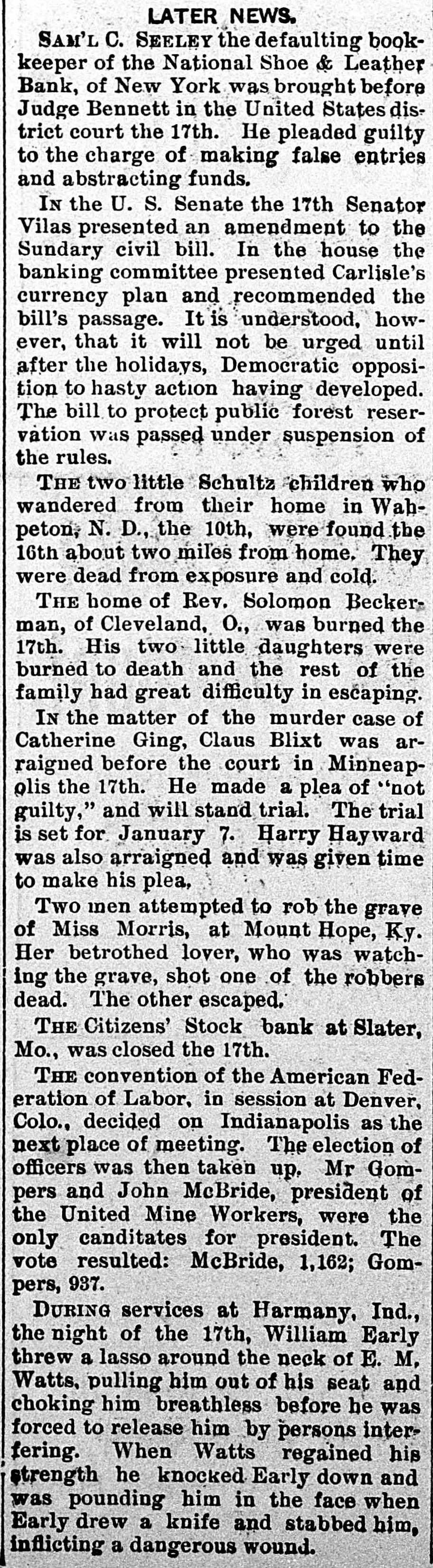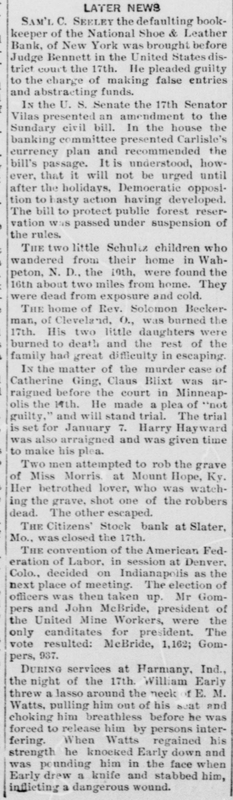 LATER NEWS. SAM'L C. SEELEY the defaulting bookkeeper of the National Shoe & Leather Bank, of New York was brought before Judge Bennett in the United States district court the 17th. He pleaded guilty to the charge of making false entries and abstracting funds. IN the U. S. Senate the 17th Senator Vilas presented an amendment to the Sundary civil bill. In the house the banking committee presented Carlisle's currency plan and recommended the bill's passage. It is understood, however, that it will not be urged until after the holidays, Democratic opposition to hasty action having developed. The bill to protect public forest reservation was passed under suspension of the rules. THE two little Schultz children who wandered from their home in Wahpeton, N. D., the 10th, were found the 16th about two miles from home. They were dead from exposure and cold. THE home of Rev. Solomon Beckerman, of Cleveland, O., was burned the 17th. His two little daughters were burned to death and the rest of the family had great difficulty in escaping. IN the matter of the murder case of Catherine Ging, Claus Blixt was arraigned before the court in Minneapolis the 17th. He made a plea of "not guilty," and will stand trial. The trial is set for January 7. Harry Hayward was also arraigned and was given time to make his plea, Two men attempted to rob the grave of Miss Morris, at Mount Hope, Ky. Her betrothed lover, who was watching the grave, shot one of the robbers dead. The other escaped, THE Citizens' Stock bank at Slater, Mo., was closed the 17th. THE convention of the American Federation of Labor, in session at Denver, Colo., decided on Indianapolis as the next place of meeting. The election of officers was then taken up. Mr Gompers and John McBride, president of the United Mine Workers, were the only canditates for president. The vote resulted: McBride, 1,162; Gompers, 937. DURING services at Harmany, Ind., the night of the 17th, William Early threw a lasso around the neck of E. M, Watts, pulling him out of his seat and choking him breathless before he was forced to release him by persons interfering. When Watts regained his strength he knocked Early down and was pounding him in the face when Early drew a knife and stabbed him, inflicting a dangerous wound.