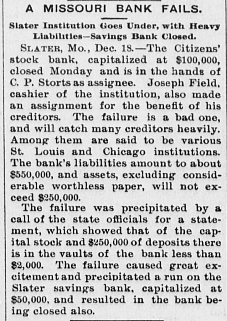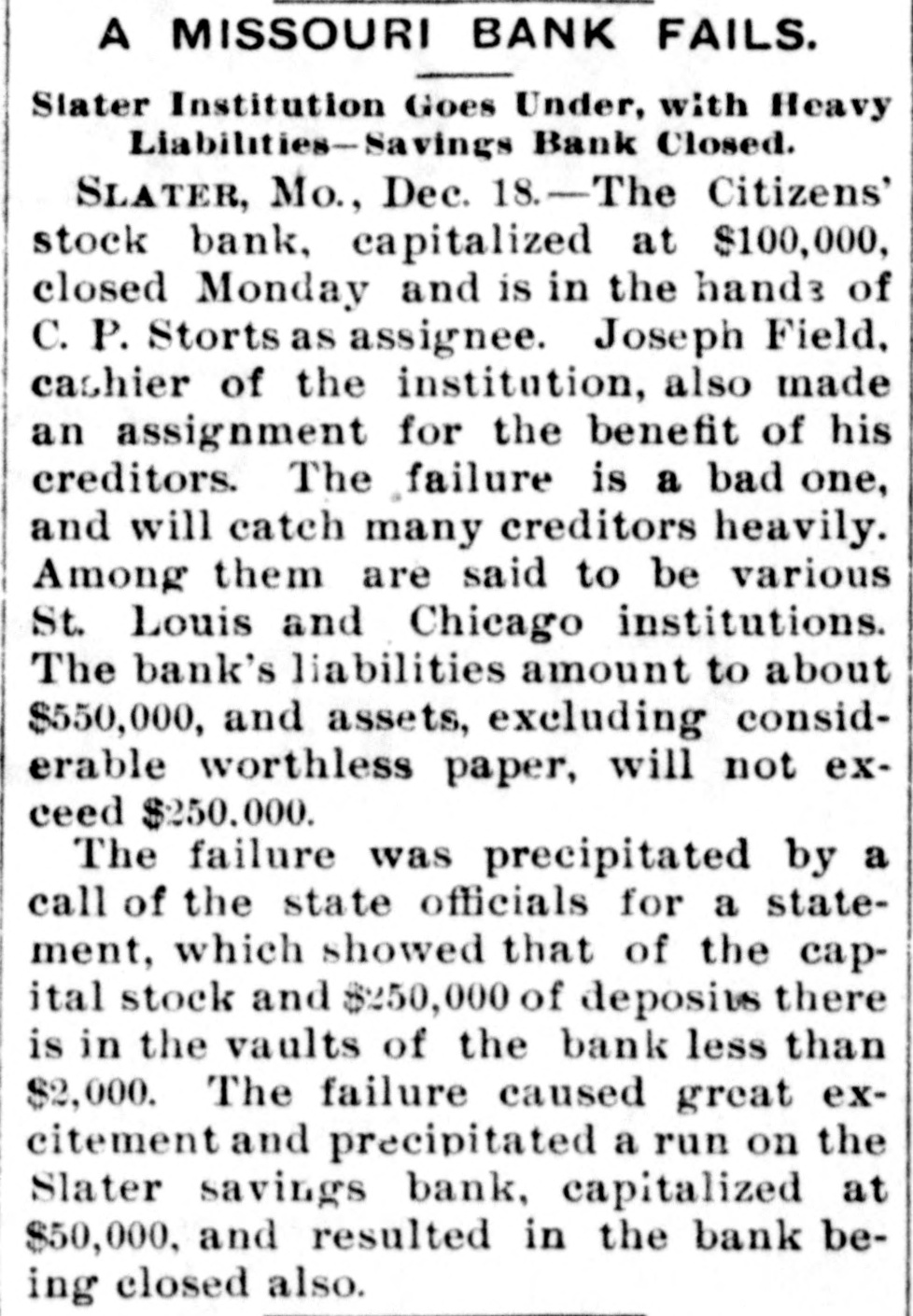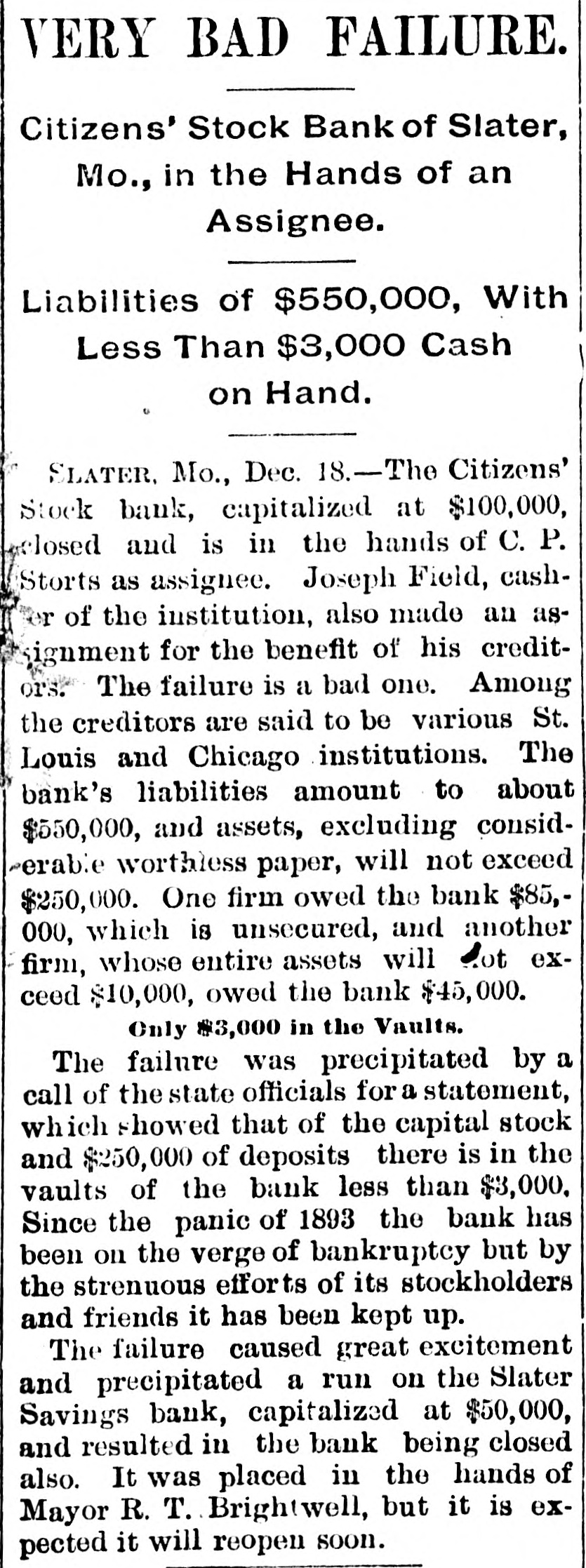 VERY BAD FAILURE. Citizens' Stock Bank of Slater, Mo., in the Hands of an Assignee. Liabilities of $550,000, With Less Than $3,000 Cash on Hand. SLATER, Mo., Dec. 18.-The Citizens' Stock bank, capitalized at $100,000, losed and is in the hands of C.P. Storts as assignee. Joseph Field, cashfor of the institution, also made an asignment for the benefit of his creditors. The failure is a bad one. Among the creditors are said to be various St. Louis and Chicago institutions. The bank's liabilities amount to about $550,000, and assets, excluding considerable worthless paper, will not exceed $250,000. One firm owed the bank $85,000, which is unsecured, and another firm, whose entire assets will dot exceed $10,000, owed the bank $45,000. Only $3,000 in the Vaults. The failure was precipitated by a call of the state officials for a statement, which showed that of the capital stock and $250,000 of deposits there is in the vaults of the bank less than $3,000. Since the panic of 1893 the bank has been on the verge of bankruptcy but by the strenuous efforts of its stockholders and friends it has been kept up. The failure caused great excitement and precipitated a run on the Slater Savings bank, capitalized at $50,000, and resulted in the bank being closed also. It was placed in the hands of Mayor R. T. Brightwell, but it is expected it will reopen soon.