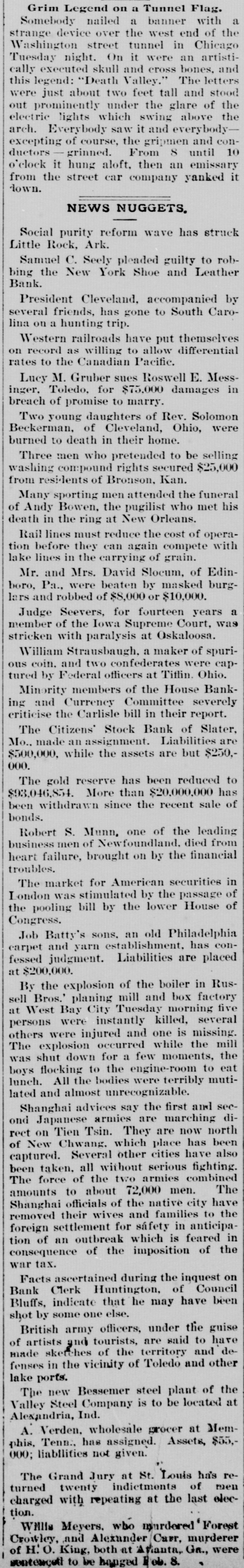 # Grim Legend on a Tunnel Flag. Somebody nailed a banner with a strange device over the west end of the Washington street tunnel in Chicago Tuesday night. On it were an artistically executed skull and cross bones, and this legend: "Death Valley." The letters were just about two feet tall and stood out prominently under the glare of the electric lights which swing above the arch. Everybody saw it and everybody-excepting of course, the gripmen and conductors grinned. From S until 10 o'clock it hung aloft, then an emissary from the street car company yanked it down. # NEWS NUGGETS, Social purity reform wave has struck Little Rock, Ark. Samuel C. Seely pleaded guilty to robbing the New York Shoe and Leather Bank. President Cleveland, accompanied by several friends, has gone to South Carolina on a hunting trip. Western railroads have put themselves on record as willing to allow differential rates to the Canadian Pacific. Lucy M. Gruber sues Roswell E. Messinger, Toledo, for $75,000 damages in breach of promise to marry. Two young daughters of Rev. Solomon Beckerman, of Cleveland, Ohio, were burned to death in their home. Three men who pretended to be selling washing compound rights secured $25,000 from residents of Bronson, Kan. Many sporting men attended the funeral of Andy Bowen, the pugilist who met his death in the ring at New Orleans. Rail lines must reduce the cost of operation before they can again compete with lake lines in the carrying of grain. Mr. and Mrs. David Slocum, of Edinboro, Pa., were beaten by masked burglars and robbed of $8,000 or $10,000. Judge Seevers, for fourteen years a member of the Iowa Supreme Court, was stricken with paralysis at Oskaloosa. William Strausbaugh, a maker of spurious coin, and two confederates were captured by Federal officers at Tiffin. Ohio. Minority members of the House Banking and Currency Committee severely criticise the Carlisle bill in their report. The Citizens' Stock Bank of Slater, Mo., made an assignment. Liabilities are $500,000, while the assets are but $250,000. The gold reserve has been reduced to $93,046,854. More than $20,000,000 has been withdrawn since the recent sale of bonds. Robert S. Munn, one of the leading business men of Newfoundland, died from heart failure, brought on by the financial troubles. The market for American securities in London was stimulated by the passage of the pooling bill by the lower House of Congress. Job Batty's sons, an old Philadelphia carpet and yarn establishment, has confessed judgment. Liabilities are placed at $200,000. By the explosion of the boiler in Russell Bros.' planing mill and box factory at West Bay City Tuesday morning five persons were instantly killed, several others were injured and one is missing. The explosion occurred while the mill was shut down for a few moments, the boys flocking to the engine-room to eat lunch. All the bodies were terribly mutilated and almost unrecognizable. Shanghai advices say the first and second Japanese armies are marching direct on Tien Tsin. They are now north of New Chwang, which place has been captured. Several other cities have also been taken, all without serious fighting. The force of the two armies combined amounts to about 72,000 men. The Shanghai officials of the native city have removed their wives and families to the foreign settlement for safety in anticipation of an outbreak which is feared in consequence of the imposition of the war tax. Facts ascertained during the inquest on Bank Clerk Huntington, of Council Bluffs, indicate that he may have been shot by some one else. British army officers, under the guise of artists and tourists, are said to have made sketches of the territory and defenses in the vicinity of Toledo and other lake ports. The new Bessemer steel plant of the Valley Steel Company is to be located at Alexandria, Ind. A. Verden, wholesale grocer at Memphis, Tenn., has assigned. Assets, $55,000; liabilities not given. The Grand Jury at St. Louis has returned twenty indictments of men charged with repeating at the last election. Willis Meyers, who murdered Forest Crowley, and Alexander Carr, murderer of H. O. King, both at Avianta, Ga., were sentenceti to be hanged Feb. 8.