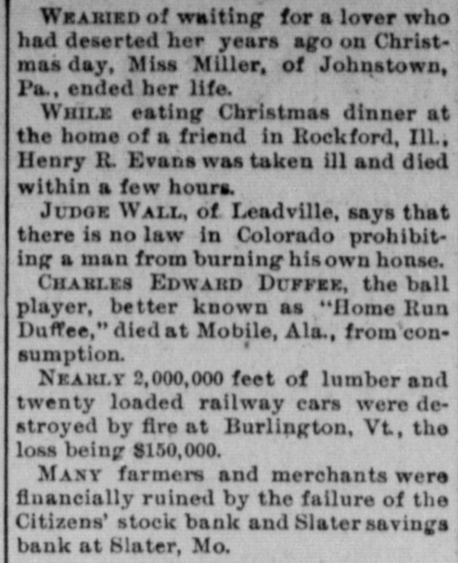 WEARIED of waiting for a lover who had deserted her years ago on Christmas day, Miss Miller, of Johnstown, Pa., ended her life. WHILE eating Christmas dinner at the home of a friend in Rockford, Ill., Henry R. Evans was taken ill and died within a few hours. JUDGE WALL, of Leadville, says that there is no law in Colorado prohibiting a man from burning hisown honse. CHARLES EDWARD DUFFEE, the ball player, better known as "Home Run Duffee," died at Mobile, Ala., from consumption. NEARLY 2,000,000 feet of lumber and twenty loaded railway cars were destroyed by fire at Burlington, Vt., the loss being $150,000. MANY farmers and merchants were financially ruined by the failure of the Citizens' stock bank and Slater savings bank at Slater, Mo.