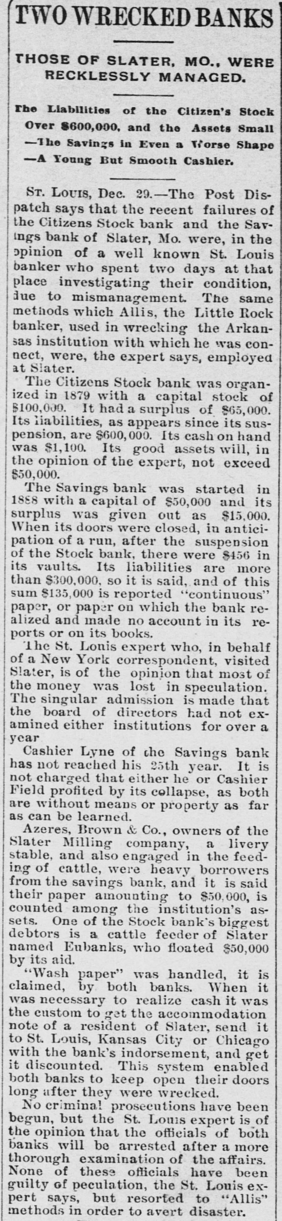 TWO WRECKED BANKS THOSE OF SLATER, MO., WERE RECKLESSLY MANAGED. The Liabilities of the Citizen's Stock Over $600,000. and the Assets Small -The Savings in Even a Tiorse Shape -A Young But Smooth Cashier. ST. LOUIS, Dec. 29.-The Post Dispatch says that the recent failures of the Citizens Stock bank and the Savings bank of Slater, Mo. were, in the opinion of a well known St. Louis banker who spent two days at that place investigating their condition, due to mismanagement. The same methods which Allis, the Little Rock banker, used in wrecking the Arkansas institution with which he was connect, were, the expert says, employed at Slater. The Citizens Stock bank was organized in 1879 with a capital stock of $100,000. It had a surplus of $65,000. Its liabilities, as appears since its suspension, are $600,000. Its cash on hand was $1,100. Its good assets will, in the opinion of the expert, not exceed $50,000. The Savings bank was started in 1888 with a capital of $50,000 and its surplus was given out as $15,000. When its doors were closed, in anticipation of a run, after the suspension of the Stock bank, there were $456 in its vaults. Its liabilities are more than $300,000, so it is said, and of this sum $135,000 is reported "continuous" paper, or paper on which the bank realized and made no account in its reports or on its books. The St. Lonis expert who, in behalf of a New York correspondent, visited Slater, is of the opinion that most of the money was lost in speculation. The singular admission is made that the board of directors had not examined either institutions for over a year Cashier Lyne of the Savings bank has not reached his 25th year. It is not charged that either he or Cashier Field profited by its collapse, as both are without means or property as far as can be learned. Azeres, Brown & Co., owners of the Slater Milling company, a livery stable, and also engaged in the feeding of cattle, were heavy borrowers from the savings bank, and it is said their paper amounting to $50,000, is counted among the institution's assets. One of the Stock bank's biggest debtors is a cattle feeder of Slater named Eubanks, who floated $50,000 by its aid. "Wash paper" was handled, it is claimed, by both banks. When it was necessary to realize cash it was the custom to get the accommodation note of a resident of Slater, send it to St. Louis, Kansas City or Chicago with the bank's indorsement, and get it discounted. This system enabled both banks to keep open their doors long after they were wrecked. No criminal prosecutions have been begun, but the St. Louis expert is of the opinion that the officials of both banks will be arrested after a more thorough examination of the affairs. None of these officials have been guilty of peculation, the St. Louis expert says, but resorted to "Allis" methods in order to avert disaster.