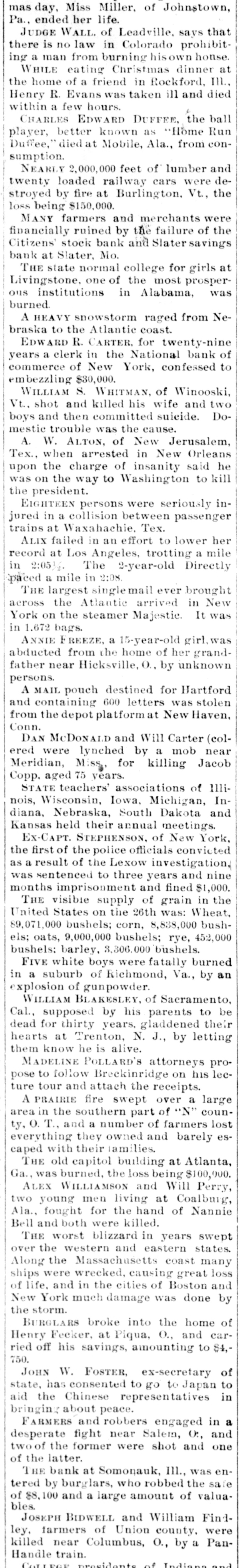 NEARLY 2,000,000 feet of lumber and twenty loaded railway cars were destroyed by fire at Burlington. Vt., the loss being $150,000. MANY farmers and merchants were financially ruined by the failure of the Citizens' stock bank and Slater savings bank at Slater, Mo. THE state normal college for girls at Livingstone, one of the most prosperous institutions in Alabama, was burned. A HEAVY snowstorm raged from Nebraska to the Atlantic coast. EDWARD R. CARTER. for twenty-nine years a clerk in the National bank of commerce of New York, confessed to embezzling $30,000. WILLIAM S. WHITMAN, of Winooski, Vt., shot and killed his wife and two boys and then committed suicide. Domestic trouble was the cause. A. W. ALTON, of New Jerusalem, Tex., when arrested in New Orleans upon the charge of insanity said he was on the way to Washington to kill the president. EIGHTEEN persons were seriously injured in a collision between passenger trains at Waxahachie. Tex. ALIX failed in an effort to lower her record at Los Angeles, trotting a mile in 2:05 1/2. The 2-year-old Directly paced a mile in 2:08. THE largest singlemail ever brought across the Atlantic arrived in New York on the steamer Majestic. It was in 1.672 bags. ANNIE FREEZE, a 15-year-old girl, was abducted from the home of her grandfather near Hicksville, O., by unknown persons. A MAIL pouch destined for Hartford and containing 600 letters was stolen from the depot platformat New Haven, Conn. DAN McDoNALD and Will Carter (colered were lynched by a mob near Meridian, Miss, for killing Jacob Copp. aged 75 years. STATE teachers' associations of 111inois, Wisconsin, Iowa, Michigan, Indiana, Nebraska, South Dakota and Kansas held their annual meetings. Ex-CAPT. STEPHENSON, of New York, the first of the police officials convicted as a result of the Lexow investigation, was sentenced to three years and nine months imprisonment and fined $1,000. THE visible supply of grain in the United States on the 26th was: Wheat, 89,071,000 bushels; corn, 8,838,000 bushels; oats, 9,000,000 bushels; rye, 452,000 bushels: barley, 3,306,000 bushels. FIVE white boys were fatally burned in a suburb of Richmond, Va., by an explosion of gunpowder. WILLIAM BLAKESLEY, of Sacramento, Cal., supposed by his parents to be dead for thirty years, gladdened their hearts at Trenton, N. J., by letting them know he is alive. MADELINE POLLARD'S attorneys propose to follow Breckinridge on his lecture tour and attach the receipts. A PRAIRIE fire swept over a large area in the southern part of "N" county, O. T., and a number of farmers lost everything they owned and barely escaped with their tamilies. THE old capitol building at Atlanta, Ga., was burned, the loss being $100,000. ALEX WILLIAMSON and Will Perry, two young men living at Coalburg, Ala., fought for the hand of Nannie Bell and both were killed. THE worst blizzard in years swept over the western and eastern states. Along the Massachusetts coast many ships were wrecked, causing great loss of life, and in the cities of Boston and New York much damage was done by the storm. BURGLARS broke into the home of Henry Fecker, at Piqua, O., and carried off his savings, amounting to $4,750. JOHN W. FOSTER, ex-secretary of state, has consented to go to Japan to aid the Chinese representatives in bringing about peace. FARMERS and robbers engaged in a desperate fight near Salem, O:, and two of the former were shot and one of the latter. THE bank at Somonauk, III., was entered by burglars, who robbed the safe of $8 100 and a large amount of valua-