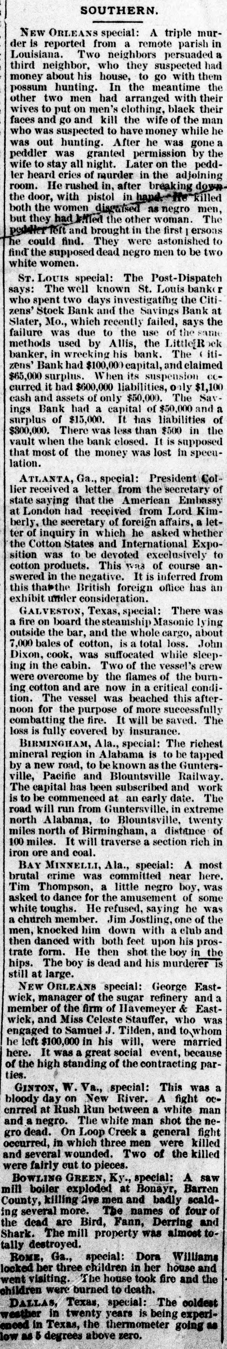 SOUTHERN. NEW ORLEANS special: A triple murder is reported from a remote parish in Louisiana. Two neighbors persuaded a third neighbor, who they suspected had money about his house, to go with them possum hunting. In the meantime the other two men had arranged with their wives to put on men's clothing, black their faces and go and kill the wife of the man who was suspected to have money while he was out hunting. After he was gone a peddler was granted permission by the wife to stay all night. Later on the peddler heard cries of murder in the adjoining room. He rushed in, after breaking down. the door, with pistol in hand He killed both the women discuised as negro men, but they had kiffed the other woman. The peddlict left and brought in the first ersons he could find. They were astonished to find the supposed dead negro men to be two white women. Sr. LOUIS special: The Post-Dispatch says: The well known St. Louis bank r who spent two days investigating the Citizens' Stock Bank and the Savings Bank at Slater, Mo., which recently failed, says the failure was due to the use of the same methods used by Allis, the Little[R ock banker. in wreeking his bank. The ' itizens' Bank had $100,000 capital, and claimed $65,000 surplus. When its suspension CCcurred it had $600,000 liabilities, only $1,100 cash and assets of only $50,000. The Savings Bank had a capital of $50,000 and a surplus of $15,000. It has liabilities of $800,000. There was less than $500 in the vault when the bank closed. It is supposed that most of the money was lost in speculation. ATLANTA, Ga., special: President Collier received a letter from the secretary of state saying that the American Embassy at London had received from Lord Kimberly, the secretary of foreign affairs, a letter of inquiry in which he asked whether the Cotton States and International Exposition was to be devoted execlusively to cotton products. This was of course answered in the negative. It is inferred from this that the British foreign office has an exhibit under consideration. GALVESTON, Texas, special: There was a fire on board thesteamship Masonic lying outside the bar, and the whole cargo, about 7,000 bales of cotton, is a total loss. John Dixon, cook, was suffocated while sleeping in the cabin. Two of the vessel's crew were overcome by the flames of the burning cotton and are now in a critical condition. The vessel was beached this afternoon for the purpose of more successfully combatting the fire. It will be saved. The loss is fully covered by insurance. BIRMINGHAM, Ala., special: The richest mineral region in Alabama is to be tapped by a new road, to be known as the Guntersville, Pacific and Blountsville Railway. The capital has been subscribed and work is to be commenced at an early date. The road will run from Guntersville, in extreme north Alabama, to Blountsville, twenty miles north of Birmingham, a distance of 100 miles. It will traverse a section rich in iron ore and coal. BAY MINNELLI, Ala., special: A most brutal crime was committed near here. Tim Thompson, a little negro boy, was asked to dance for the amusement of some white toughs. He refused, saying he was a church member. Jim Jostling, one of the men, knocked him down with a club and then danced with both feet upon his prostrate form. He then shot the boy in the hips. The boy is dead and his murderer is still at large. NEW ORLEANS special: George Eastwick, manager of the sugar refinery and a member of the firm of Havemeyer & Eastwick, and Miss Celeste Stauffer, who was engaged to Samuel J. Tilden, and to whom he left $100,000 in his will, were married here. It was a great social event, because of the high standing of the contracting parties. GINTON, W. Va., special: This was a bloody day on New River. A fight ocenrred at Rush Run between a white man and a negro. The white man shot the negro dead. On Loop Creek a general fight occurred, in which three men were killed and several wounded. Two of the killed were fairly cut to pieces. BOWLING GREEN, Ky., special: A saw mill boiler exploded at Bonayr, Barren County, killing live men and badly scalding several more. The names of four of the dead are Bird, Fann, Derring and Shark. The mill property was almost totally destroyed. ROME, Ga., special: Dora Williams locked her three children in her house and went visiting. The house took fire and the children were burned to death. DALLAS, Texas, special: The coldest weather in twenty years is being experienced in Texas, the thermometer going as low as 5 degrees above zero.