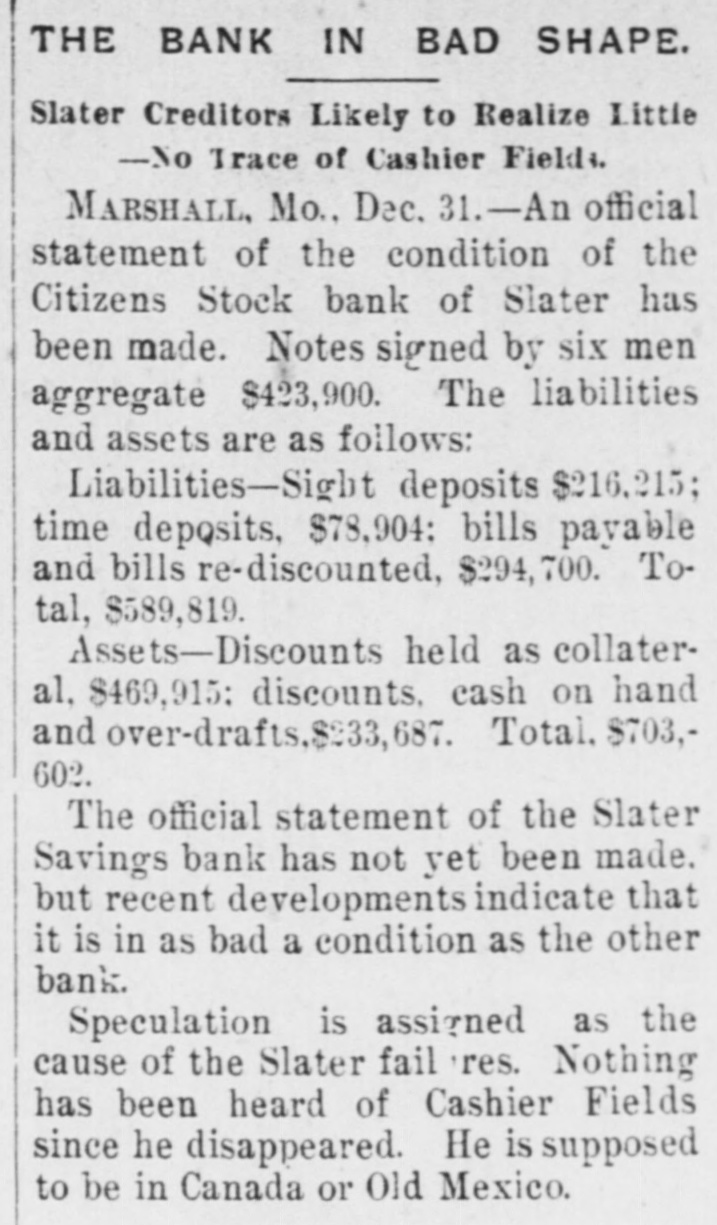 THE BANK IN BAD SHAPE. Slater Creditors Likely to Realize Little -No Trace of Cashier Fields. MARSHALL, Mo., Dec. 31.-An official statement of the condition of the Citizens Stock bank of Slater has been made. Notes signed by six men aggregate $423,900. The liabilities and assets are as follows: Liabilities-Sight deposits $216,215; time deposits, $78,904: bills payable and bills re-discounted, $294,700. Total, $589,819. Assets-Discounts held as collateral, $469,915: discounts. cash on hand and over-drafts,$233,687. Total. $703,602. The official statement of the Slater Savings bank has not yet been made. but recent developments indicate that it is in as bad a condition as the other bank. Speculation is assigned as the cause of the Slater fail 'res. Nothing has been heard of Cashier Fields since he disappeared. He is supposed to be in Canada or Old Mexico.