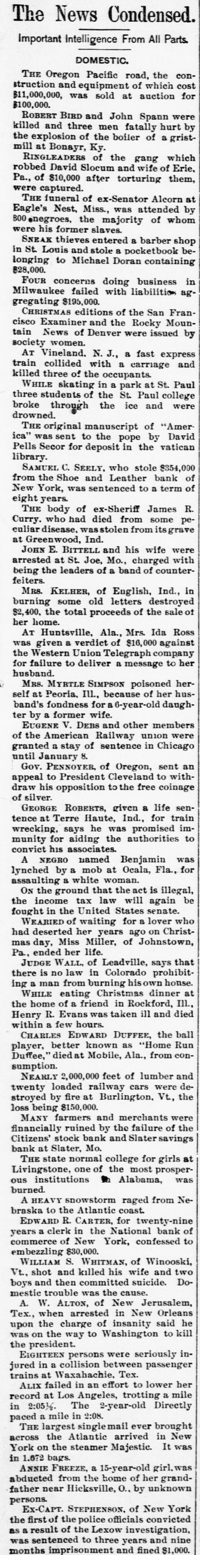 The News Condensed. Important Intelligence From All Parts. DOMESTIC. THE Oregon Pacific road, the construction and equipment of which cost $11,000,000, was sold at auction for $100,000. ROBERT BIRD and John Spann were killed and three men fatally hurt by the explosion of the boiler of a gristmill at Bonayr, Ky. RINGLEADERS of the gang which robbed David Slocum and wife of Erie, Pa., of $10,000 after torturing them, were captured. THE funeral of ex-Senator Alcorn at Eagle's Nest, Miss., was attended by 800 enegroes, the majority of whom were his former slaves. SNEAK thieves entered a barber shop in St. Louis and stole a pocketbook belonging to Michael Doran containing $28,000. FOUR concerns doing business in Milwaukee failed with liabilities aggregating $195,000. CHRISTMAS editions of the San Francisco Examiner and the Rocky Mountain News of Denver were issued by society women. AT Vineland. N. J., a fast express train collided with a carriage and killed three of the occupants WHILE skating in a park at St. Paul three students of the St. Paul college broke through the ice and were drowned. THE original manuscript of "America" was sent to the pope by David Pells Secor for deposit in the vatican library. SAMUEL C. SEELY, who stole $354,000 from the Shoe and Leather bank of New York, was sentenced to a term of eight years. THE body of ex-Sheriff James R. Curry. who had died from some peculiar disease, wasstolen from grave at Greenwood, Ind. JOHN E. BITTELL and his wife were arrested at St. Joe, Mo., charged with being the leaders of a band of counterfeiters. MRS. KELHER, of English, Ind., in burning some old letters destroyed $2,400, the total proceeds of the sale of her home. AT Huntsville, Ala., Mrs. Ida Ross was given a verdict of $16,000 against the Western Union Telegraph company for failure to deliver a message to her husband. MRS. MYRTLE SIMPSON poisoned herself at Peoria. Ill., because of her husband's fondness for a 6-year-old daughter by a former wife. EUGENE V. DEBS and other members of the American Railway union were granted a stay of sentence in Chicago until January 8. Gov. PENNOYER, of Oregon, sent an appeal to President Cleveland to withdraw his opposition to the free coinage of silver. GEORGE ROBERTS, given a life sentence at Terre Haute, Ind., for train wrecking, says he was promised immunity for aiding the authorities to convict his associates. A NEGRO named Benjamin was lynched by a mob at Ocala, Fla., for assaulting a white woman. ON the ground that the act is illegal, the income tax law will again be fought in the United States senate. WEARIED of waiting for a lover who had deserted her years ago on Christmas day, Miss Miller, of Johnstown, Pa., ended her life. JUDGE WALL, of Leadville, says that there is no law in Colorado prohibiting a man from burning hisown honse. WHILE eating Christmas dinner at the home of a friend in Rockford, Ill., Henry R. Evans was taken ill and died within a few hours. CHARLES EDWARD DUFFEE, the ball player, better known as "Home Run Duffee," diedat Mobile, Ala., from consumption. NEARLY 2,000,000 feet of lumber and twenty loaded railway cars were destroyed by fire at Burlington. Vt., the loss being $150,000. MANY farmers and merchants were financially ruined by the failure of the Citizens' stock bank and Slater savings bank at Slater, Mo. THE state normal college for girls at Livingstone, one of the most prosperous institutions Alabama, was burned. A HEAVY snowstorm raged from Nebraska to the Atlantic coast. EDWARD R. CARTER, for twenty-nine years a clerk in the National bank of commerce of New York, confessed to embezzling $30,000. WILLIAM S. WHITMAN, of Winooski, Vt., shot and killed his wife and two boys and then committed suicide. Domestic trouble was the cause. A. W. ALTON, of New Jerusalem, Tex., when arrested in New Orleans upon the charge of insanity said he was on the way to Washington to kill the president. EIGHTEEN persons were seriously injured in a collision between passenger trains at Waxahachie. Tex. ALIX failed in an effort to lower her record at Los Angeles, trotting a mile in 2:051/2. The 2-year-old Directly paced a mile in 2:08. THE largest singlemail ever brought across the Atlantic arrived in New York on the steamer Majestic. It was in 1.672 bags. ANNIE FREEZE, a 15-year-old girl.was abducted from the home of her grandfather near Hicksville, O., by unknown persons. Ex-CAPT. STEPHENSON, of New York