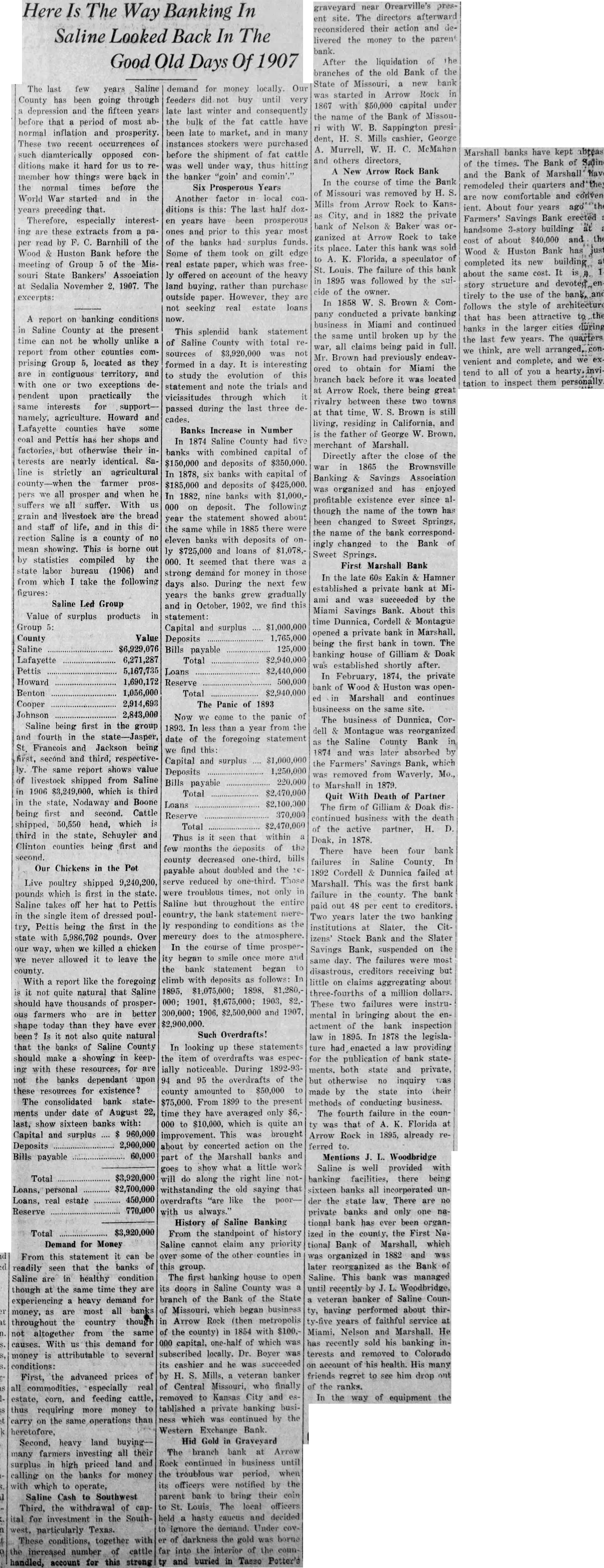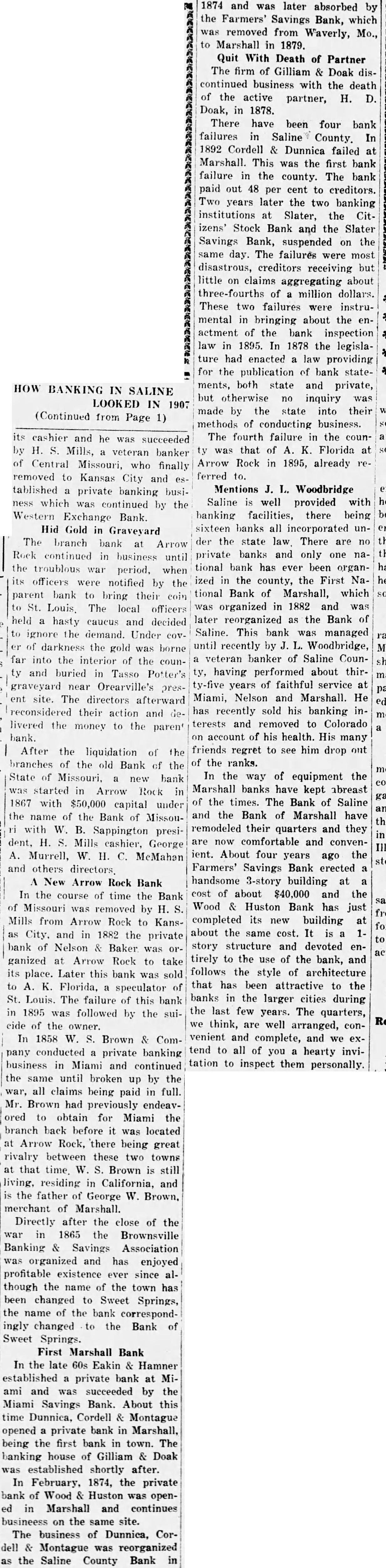 ments, both state and private, HOW BANKING IN SALINE but otherwise no inquiry was LOOKED IN 1907 (Continued from Page 1) its cashier and he was succeeded The fourth failure in the counby H. S. Mills, a veteran banker ty was that of A. K. Florida at of Central Missouri, who finally Arrow Rock in 1895, already referred to. removed to Kansas City and es. tablished a private banking busi- Mentions J. L. Woodbridge ness which was continued by the Saline is well provided with Western Exchange Bank. banking facilities, there being Hid Gold in Graveyard sixteen banks all incorporated un- The branch bank at Arrow Rock continued in business until the troublous war period, when its officers were notified by the parent bank to bring their coin to St. Louis, The local officers held a hasty caucus and decided to ignore the demand. Under cover of darkness the gold was borne far into the interior of the county and buried in Tasso Potter's graveyard near Orearville's present site. The directors afterward reconsidered their action and delivered the money to the paren' bank. After the liquidation of the branches of the old Bank of the State of Missouri, a new bank was started in Arrow Rock in 1867 with $50,000 capital under the name of the Bank of Missouri with W. B. Sappington president. H. S. Mills cashier, George A. Murrell, W. H. C. McMahan and others directors A New Arrow Rock Bank In the course of time the Bank of Missouri was removed by H. S. Mills from Arrow Rock to Kansas City, and in 1882 the private bank of Nelson & Baker was organized at Arrow Rock to take its place. Later this bank was sold to A. K. Florida, a speculator of St. Louis. The failure of this bank in 1895 was followed by the suicide of the owner. In 1858 W. S. Brown & Company conducted a private banking business in Miami and continued the same until broken up by the war, all claims being paid in full. Mr. Brown had previously endeavored to obtain for Miami the branch back before it was located at Arrow Rock, there being great rivalry between these two towns at that time. W. S. Brown is still living, residing in California, and is the father of George W. Brown, merchant of Marshall. Directly after the close of the war in 1865 the Brownsville Banking & Savings Association was organized and has enjoyed profitable existence ever since although the name of the town has been changed to Sweet Springs, the name of the bank correspondingly changed to the Bank of Sweet Springs. First Marshall Bank In the late 60s Eakin & Hamner established a private bank at Miami and was succeeded by the Miami Savings Bank. About this time Dunnica, Cordell & Montague opened a private bank in Marshall, being the first bank in town. The banking house of Gilliam & Doak was established shortly after. In February, 1874, the private bank of Wood & Huston was opened in Marshall and continues busineess on the same site. The business of Dunnica, Cordell & Montague was reorganized as the Saline County Bank in 1874 and was later absorbed by the Farmers' Savings Bank, which was removed from Waverly, Mo., to Marshall in 1879. Quit With Death of Partner The firm of Gilliam & Doak discontinued business with the death of the active partner, H. D. Doak, in 1878. There have been four bank failures in Saline County. In 1892 Cordell & Dunnica failed at Marshall. This was the first bank failure in the county. The bank paid out 48 per cent to creditors. Two years later the two banking institutions at Slater, the Citizens' Stock Bank and the Slater Savings Bank, suspended on the same day. The failures were most disastrous, creditors receiving but little on claims aggregating about three-fourths of a million dollars. These two failures were instrumental in bringing about the enactment of the bank inspection law in 1895. In 1878 the legislature had enacted a law providing for the publication of bank statemade by the state into their methods of conducting business. der the state law There are no private banks and only one national bank has ever been organized in the county, the First National Bank of Marshall, which was organized in 1882 and was later reorganized as the Bank of Saline. This bank was managed until recently by J. L. Woodbridge, a veteran banker of Saline County, having performed about thirty-five years of faithful service at Miami, Nelson and Marshall. He has recently sold his banking interests and removed to Colorado on account of his health. His many friends regret to see him drop out of the ranks. In the way of equipment the Marshall banks have kept abreast of the times. The Bank of Saline and the Bank of Marshall have remodeled their quarters and they are now comfortable and convenient. About four years ago the Farmers' Savings Bank erected a handsome 3-story building at a cost of about $40,000 and the Wood & Huston Bank has just completed its new building at about the same cost. It is a 1story structure and devoted entirely to the use of the bank, and follows the style of architecture that has been attractive to the banks in the larger cities during the last few years. The quarters, we think, are well arranged, convenient and complete, and we extend to all of you a hearty invitation to inspect them personally.