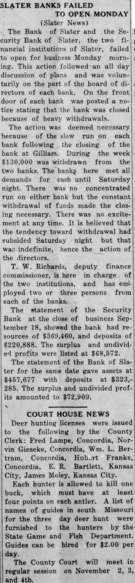 SLATER BANKS FAILED TO OPEN MONDAY (Slater News) The Bank of Slater and the Security Bank of Slater, the two financial institutions of Slater, failed to open for business Monday morning. This action followed-an all day discussion of plans and was voluntarily on the part of the board of directors of each bank. On the front door of each bank was posted a notice stating that the bank was closed because of heavy withdrawals. The action was deemed necessary because of the slow run on each bank following the closing of the bank at Gilliam. During the week $130,000 was withdrawn from the two banks. The banks here met all demands for cash until Saturday night. There was no concentrated run on either bank but the constant withdrawal of funds made the closing necessary. There was no excitement at any time. It is believed that the tendency toward withdrawal had subsided Saturday night but that was indefinite, hence the action of the directors. T. W. Richards, deputy finance commissioner, is here in charge of the two institutions, and has employed two or three persons from each of the banks. The statement of the Security Bank at the close of business September 18, showed the bank had resources of $369,460, and deposits of $220,888. The surplus and undivided profits were listed at $68,572. The statement of the Bank of Slater for the same date gave assets at $457,677 with deposits at $323,285. The surplus and undivided profits amounted to $72,909. COURT HOUSE NEWS Deer hunting licenses were issued to the following by the County Clerk: Fred Lampe, Concordia, Norvin Gieseke, Concordia, Wm. L. Bertram, Concordia, Hubert Franke, Concordia, E. R. Bartlett, Kansas City, James Moley, Kansas City. Each hunter is allowed to kill one buck, which must have at least four points on each antler. A list of names of guides in south Missouri for the three day deer hunt were furnished to the hunters by the State Game and Fish Department. Guides can be hired for $2.00 per day. The County Court will meet in regular session on November 2, 3, and 4th.