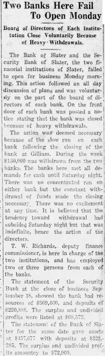 The Bank of Slater and the Security Bank of Slater ... failed to open for business Monday morning. On the front door of each bank was posted notice stating that the bank was closed because of heavy withdrawals.