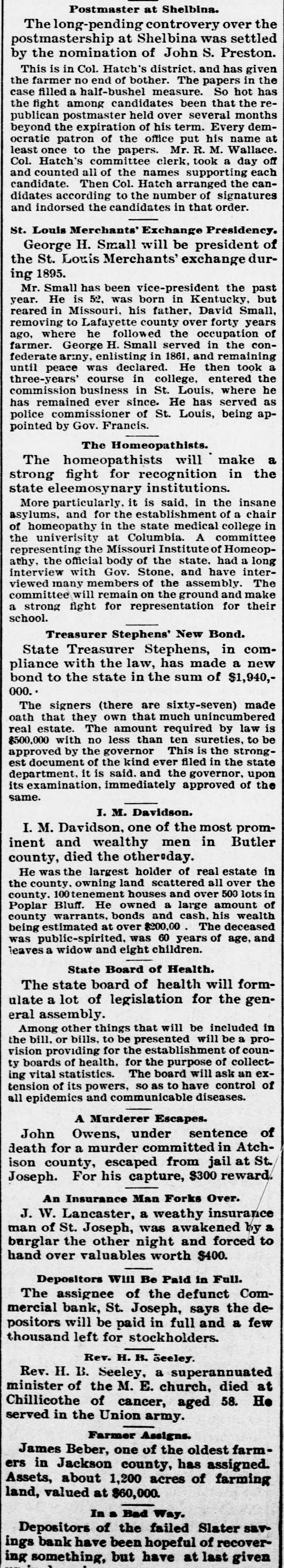 In the late 60s Eakin Hamner established private bank Miami and succeeded by the Miami Savings Bank. About this time Dunnica, Cordell Montague opened private bank being the first bank in town. The banking house of Gilliam Doak established shortly after. In February, 1874, the private bank of Huston was openMarshall and continues busineess on the same site. The business of Dunnica, Cordell Montague was reorganized the Saline County Bank 1874 and later absorbed the Farmers' Savings Bank, which removed from Marshall in 1879. Quit With Death of Partner The firm of Gilliam Doak continued business with the death the active partner, Doak. in There have been four bank failures in Saline County. In 1892 Cordell Dunnica failed at Marshall. This was the first bank failure in the county. The bank paid out 48 cent to creditors. Two years later the two banking institutions Slater. the Citizens' Stock Bank and the Slater Savings Bank, suspended on the day. The failures were most disastrous, creditors receiving but little claims aggregating about of million dollars. These two failures instrumental in bringing about the actment of the bank inspection 1895. In 1878 the legislaenacted law providing for the publication of bank stateboth state and private, otherwise inquiry made by the state into their methods of conducting business. The fourth failure the that Florida Arrow Rock 1895, already ferred