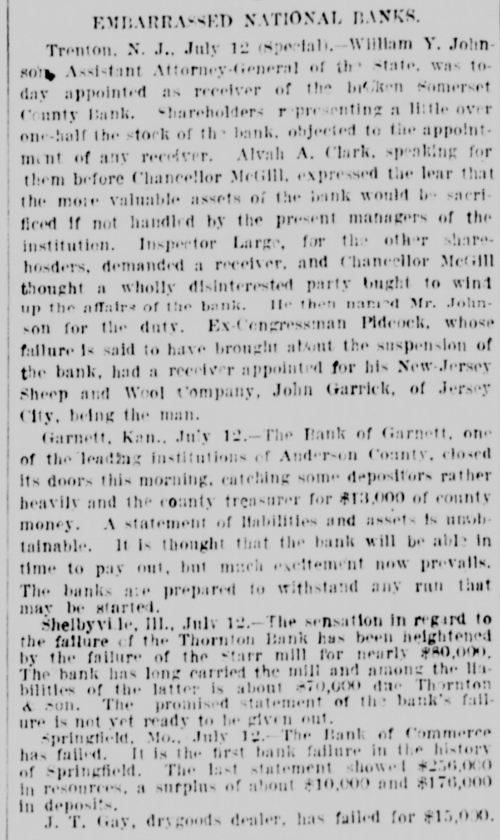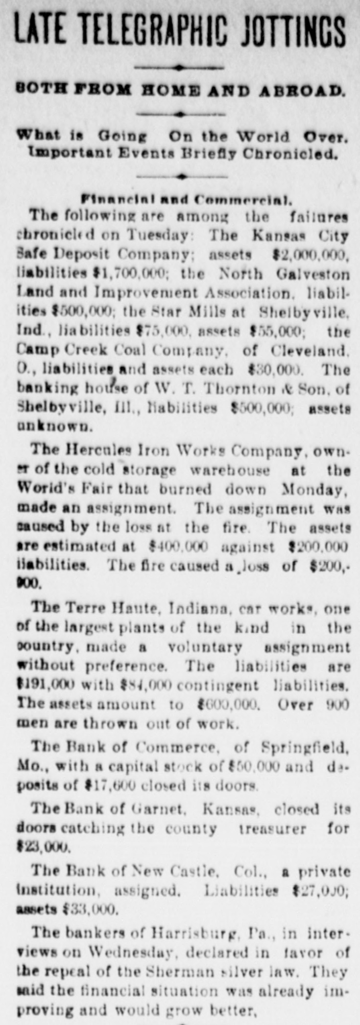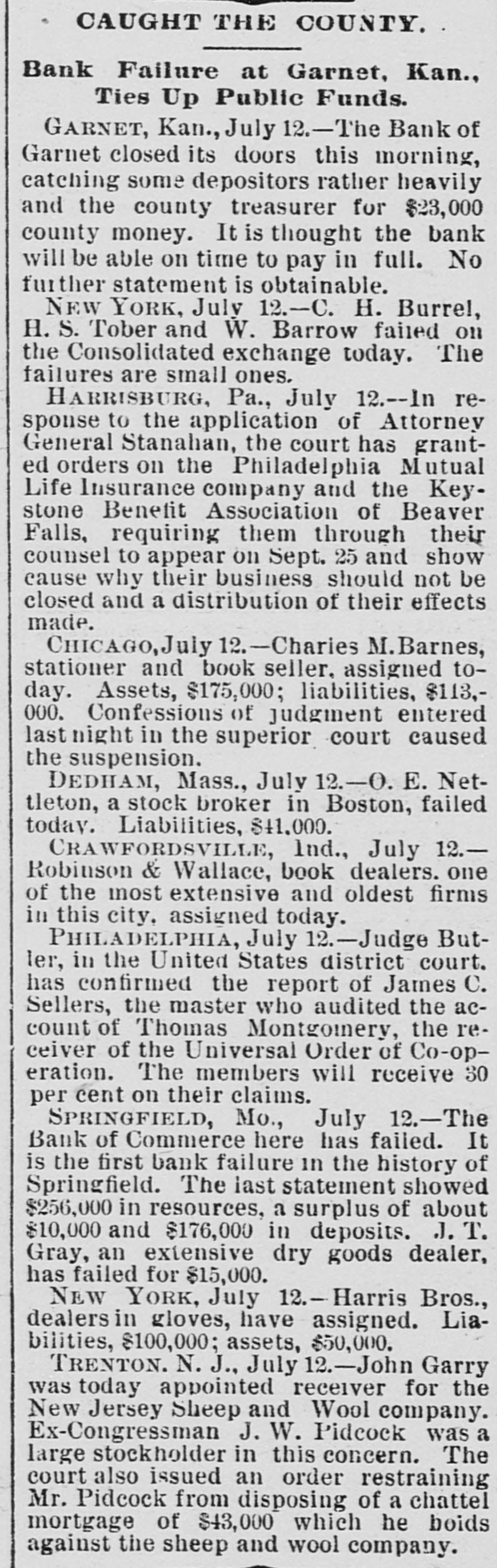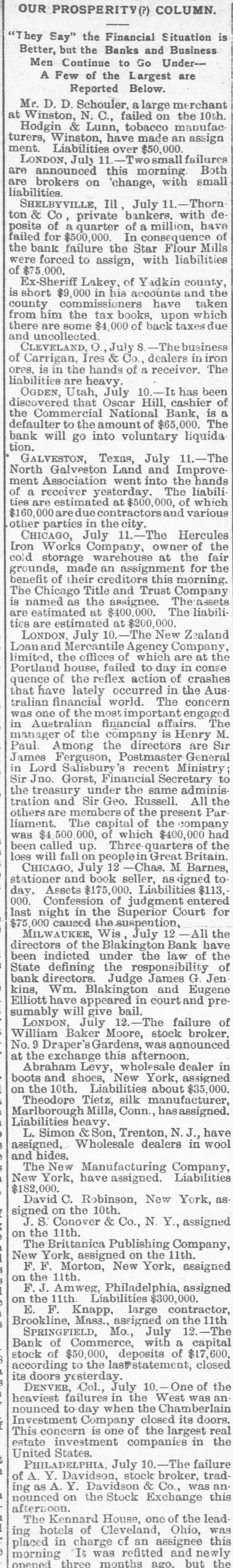 OUR PROSPERITY( is situation "They Say" the the Financial Banks and Under- Business A Better, but to Go are Men Continue of the Largest Few Reported Below. merchant a large the 10th. Mr. D. D. C., failed manufac Winston, Schouler, N. Lunn, made on an at tobacco assign Hodgin Winston, & have $50,000. turers, Liabilities over Twosmall failures Both on are ment. LONDON, announced July 11. this change, morning with small liabilities. are brokers Ill, bankers. July 11.-Thorn with de have SHELBYVILLE, & Co, private of a million, of ton posits of a quarter In Flour failed bank for $500,000 failure the Star with liabilities the were forced to assign, of $75.000. county, Lakey, of accounts Yadkin and taken the is short Ex-Sheriff $9,000 commissioners in his have upon which some county from him the tax $4, 000 books, of back taxes due and there incollected. are O. July S.-The dealers business in iron The of CLEVELAND Carrigan, the Ires hands & Co., of a receiver. ores, liabilities OGDEN, is in are Utah, heavy. Oscar July 10. Hill, It Bank, cashier has been is of a defaulter to the into voluntary the bank discovered Commercial will go that amount National of $65,000. 11.-The liquida The tion. GALVESTON, Texas, Land July and Improve. hands Galveston went into the liabili ment North receiver Association yesterdooo, 000, The of various which of ties a are estimated contractors at and $160,000 are due in the city. Hercules other CHICAGO, parties July 11.-The owner of fair the Iron storage Works Company, warehouse at the for the cold made an assignment this Title grounds, benefit of their creditors and Trust The assets Company estimated at at $200,000. are ties is The named Chicago estimated as the $400,000. assignee. The New The Zealand liabiliLoan and LONDON. are Mercantile July offices 10. of Agency which Company, are in conse at the limited, Portland quence have of the house, the lately reflex failed occurred action to The day in of the concern crashes Aus that world. engaged tralian financial of the most important affairs. The M. was Australian one financial company is Henry in of the directors are Among Postmaster Hinistry James manager Paul. Ferguson, the 's recent General Sir to in Lord Jno. Salisbury Gorst, Financial the same Secretary adminis- the and of the are The capital of $400,0 000 the tration others Sir treasury members Sir under Geo. which Russell. the present company All Par had liament. $4,500,000, of Three quarters of the was been called fall up. on peoplein Great M Britain. Barnes, loss CHICAGO, will July 12 seller, Chas. signed $113, to $175,000. stationer and book Liabilities entered day. Confession Assets of Superior judgment Court for 000. last night in the suspention. caused 12 MILWAUKEE, Bank the of the under the law of $75,000 directors the Wis Blakington July All of have the been indicted the responsibility G. Jen State directors. defining Judge James and Eugene Elliott have bail. kins, bank Wm. appeared Blakington in court and presumably will give 12. The failure broker, of William LONDON, 'Baker July Gardens, Moore, was stock announced 9 Draper's afternoon. the wholesale Abraham New York, at No. and exchange shoes, Levy, this about dealer assigned $35,000. in boots the 10th. Liabilities silk manufacturer, Marlborough on Theodore Tietz, Mills, Conn., has assigned. Liabilities heavy. &Son, Trenton, N.J., in have wool and hides. assigned. L. Simon Wholesale dealers Manufacturing Company, Liabilities New The York, New have assigned. $182,000. David C. Robinson, New York, as signed J.S. on Conover the 10th. & Co., N. Y., assigned on the Brittanica 11th. Publishing 11th. Company, New The F. F. York, Morton, assigned New on York, the assigned on the 11th. Amweg, Philadelphia, assigned F.J. the 11th. Liabilities $300,000. contractor, on Brookline, E. F. Knapp, Mass., assigned large July on the 12 11th The SPRINGFIELD, Mo., with a capital Bank of $50,000, Commerce, deposits of $17,600, closed stock of to the last statement, its doors Col., July 10. One failures in the according DENVER, yesterday. West was an. Chamberlain of the heaviest to day when the its doors. nounced Company closed real is one of the in This concern investment companies United Investment estate States. largest failure the PHILADELPHIA, July 10. broker, -The tradof A. Y. Davidson, stock & Co., was aning as A. on the Stock House, one of afternoon. nounced Kennard Y. Davidson Exchange Ohio, the lead- was this The hotels of Cleveland, this placed ing in charge of refitted an assignee and newly opened morning three It was months ago, but the