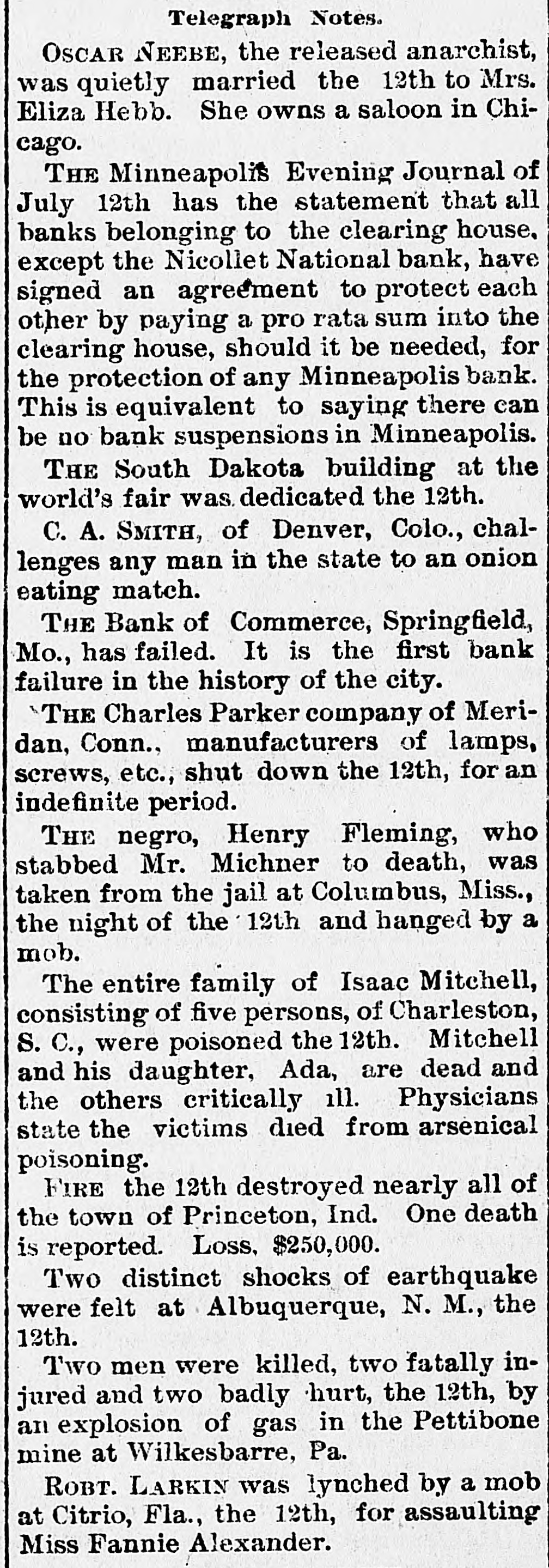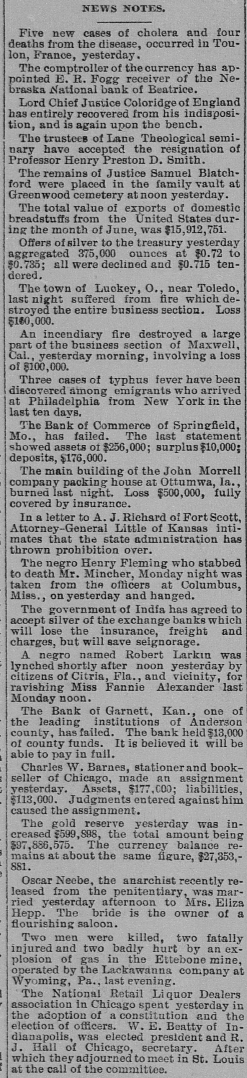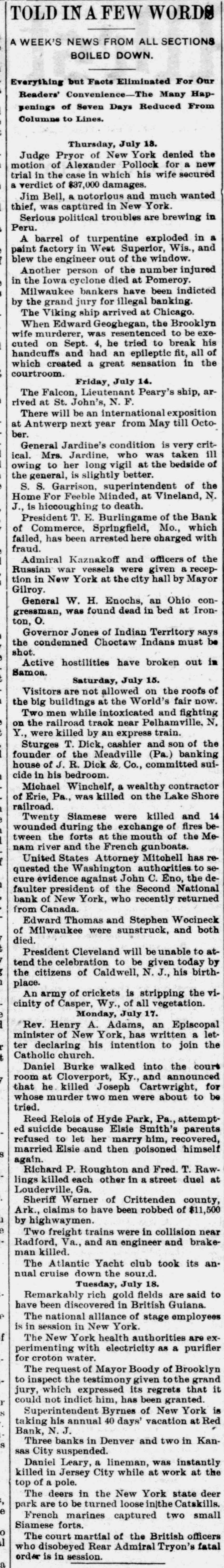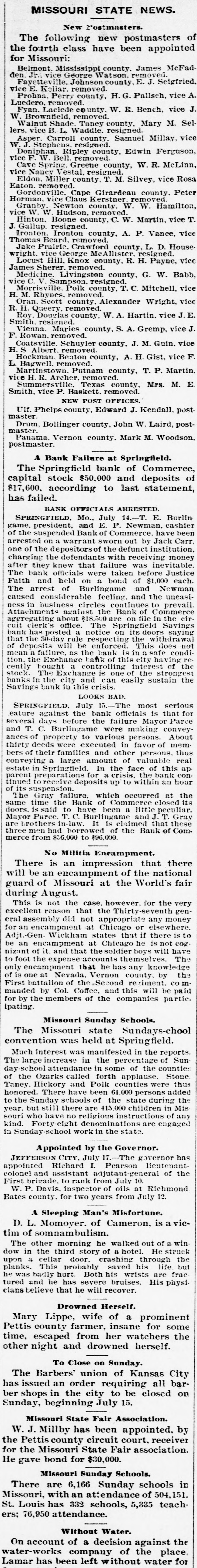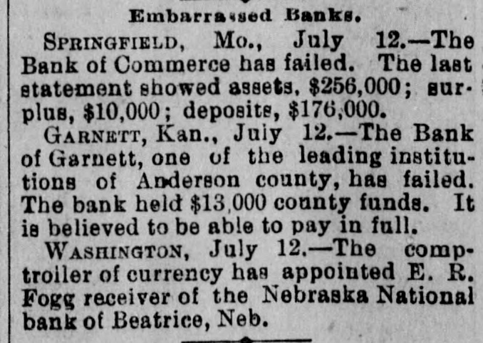 OUR PROSPERITY( is situation "They Say" the the Financial Banks and Under- Business A Better, but to Go are Men Continue of the Largest Few Reported Below. merchant a large the 10th. Mr. D. D. C., failed manufac Winston, Schouler, N. Lunn, made on an at tobacco assign Hodgin Winston, & have $50,000. turers, Liabilities over Twosmall failures Both on are ment. LONDON, announced July 11. this change, morning with small liabilities. are brokers Ill, bankers. July 11.-Thorn with de have SHELBYVILLE, & Co, private of a million, of ton posits of a quarter In Flour failed bank for $500,000 failure the Star with liabilities the were forced to assign, of $75.000. county, Lakey, of accounts Yadkin and taken the is short Ex-Sheriff $9,000 commissioners in his have upon which some county from him the tax $4, 000 books, of back taxes due and there incollected. are O. July S.-The dealers business in iron The of CLEVELAND Carrigan, the Ires hands & Co., of a receiver. ores, liabilities OGDEN, is in are Utah, heavy. Oscar July 10. Hill, It Bank, cashier has been is of a defaulter to the into voluntary the bank discovered Commercial will go that amount National of $65,000. 11.-The liquida The tion. GALVESTON, Texas, Land July and Improve. hands Galveston went into the liabili ment North receiver Association yesterdooo, 000, The of various which of ties a are estimated contractors at and $160,000 are due in the city. Hercules other CHICAGO, parties July 11.-The owner of fair the Iron storage Works Company, warehouse at the for the cold made an assignment this Title grounds, benefit of their creditors and Trust The assets Company estimated at at $200,000. are ties is The named Chicago estimated as the $400,000. assignee. The New The Zealand liabiliLoan and LONDON. are Mercantile July offices 10. of Agency which Company, are in conse at the limited, Portland quence have of the house, the lately reflex failed occurred action to The day in of the concern crashes Aus that world. engaged tralian financial of the most important affairs. The M. was Australian one financial company is Henry in of the directors are Among Postmaster Hinistry James manager Paul. Ferguson, the 's recent General Sir to in Lord Jno. Salisbury Gorst, Financial the same Secretary adminis- the and of the are The capital of $400,0 000 the tration others Sir treasury members Sir under Geo. which Russell. the present company All Par had liament. $4,500,000, of Three quarters of the was been called fall up. on peoplein Great M Britain. Barnes, loss CHICAGO, will July 12 seller, Chas. signed $113, to $175,000. stationer and book Liabilities entered day. Confession Assets of Superior judgment Court for 000. last night in the suspention. caused 12 MILWAUKEE, Bank the of the under the law of $75,000 directors the Wis Blakington July All of have the been indicted the responsibility G. Jen State directors. defining Judge James and Eugene Elliott have bail. kins, bank Wm. appeared Blakington in court and presumably will give 12. The failure broker, of William LONDON, 'Baker July Gardens, Moore, was stock announced 9 Draper's afternoon. the wholesale Abraham New York, at No. and exchange shoes, Levy, this about dealer assigned $35,000. in boots the 10th. Liabilities silk manufacturer, Marlborough on Theodore Tietz, Mills, Conn., has assigned. Liabilities heavy. &Son, Trenton, N.J., in have wool and hides. assigned. L. Simon Wholesale dealers Manufacturing Company, Liabilities New The York, New have assigned. $182,000. David C. Robinson, New York, as signed J.S. on Conover the 10th. & Co., N. Y., assigned on the Brittanica 11th. Publishing 11th. Company, New The F. F. York, Morton, assigned New on York, the assigned on the 11th. Amweg, Philadelphia, assigned F.J. the 11th. Liabilities $300,000. contractor, on Brookline, E. F. Knapp, Mass., assigned large July on the 12 11th The SPRINGFIELD, Mo., with a capital Bank of $50,000, Commerce, deposits of $17,600, closed stock of to the last statement, its doors Col., July 10. One failures in the according DENVER, yesterday. West was an. Chamberlain of the heaviest to day when the its doors. nounced Company closed real is one of the in This concern investment companies United Investment estate States. largest failure the PHILADELPHIA, July 10. broker, -The tradof A. Y. Davidson, stock & Co., was aning as A. on the Stock House, one of afternoon. nounced Kennard Y. Davidson Exchange Ohio, the lead- was this The hotels of Cleveland, this placed ing in charge of refitted an assignee and newly opened morning three It was months ago, but the