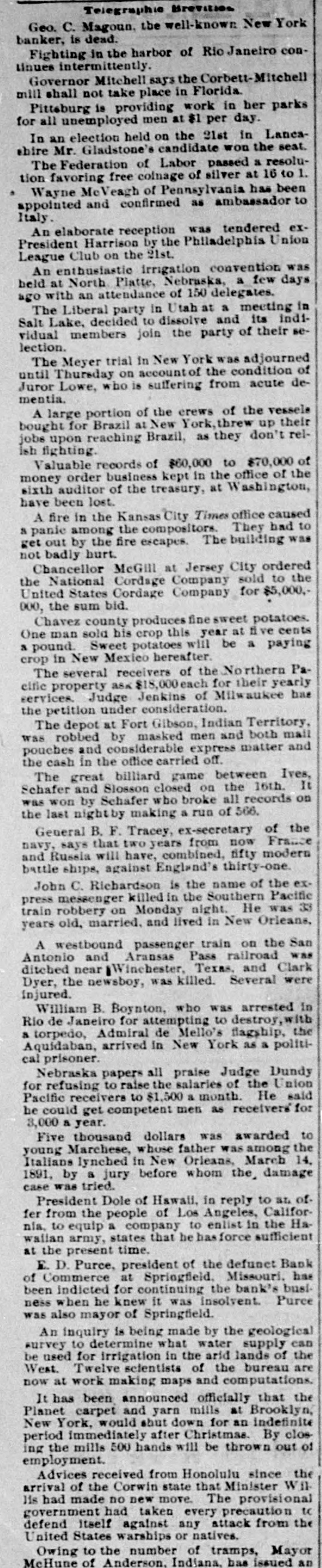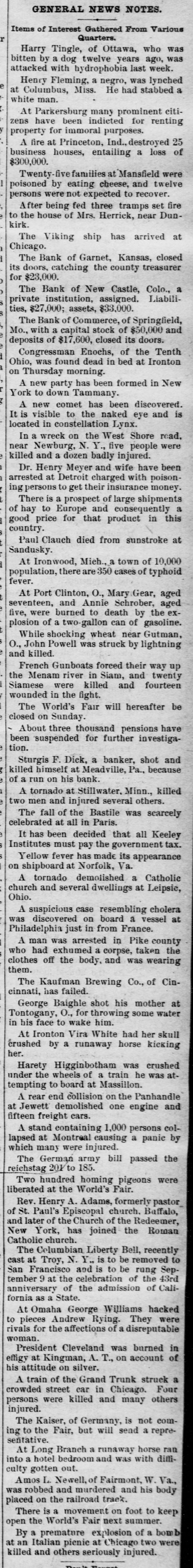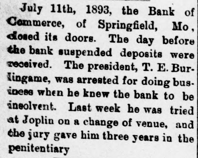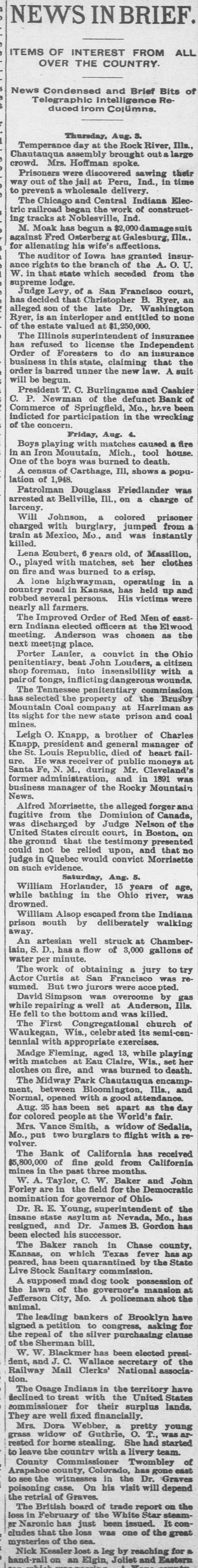 OUR PROSPERITY( is situation "They Say" the the Financial Banks and Under- Business A Better, but to Go are Men Continue of the Largest Few Reported Below. merchant a large the 10th. Mr. D. D. C., failed manufac Winston, Schouler, N. Lunn, made on an at tobacco assign Hodgin Winston, & have $50,000. turers, Liabilities over Twosmall failures Both on are ment. LONDON, announced July 11. this change, morning with small liabilities. are brokers Ill, bankers. July 11.-Thorn with de have SHELBYVILLE, & Co, private of a million, of ton posits of a quarter In Flour failed bank for $500,000 failure the Star with liabilities the were forced to assign, of $75.000. county, Lakey, of accounts Yadkin and taken the is short Ex-Sheriff $9,000 commissioners in his have upon which some county from him the tax $4, 000 books, of back taxes due and there incollected. are O. July S.-The dealers business in iron The of CLEVELAND Carrigan, the Ires hands & Co., of a receiver. ores, liabilities OGDEN, is in are Utah, heavy. Oscar July 10. Hill, It Bank, cashier has been is of a defaulter to the into voluntary the bank discovered Commercial will go that amount National of $65,000. 11.-The liquida The tion. GALVESTON, Texas, Land July and Improve. hands Galveston went into the liabili ment North receiver Association yesterdooo, 000, The of various which of ties a are estimated contractors at and $160,000 are due in the city. Hercules other CHICAGO, parties July 11.-The owner of fair the Iron storage Works Company, warehouse at the for the cold made an assignment this Title grounds, benefit of their creditors and Trust The assets Company estimated at at $200,000. are ties is The named Chicago estimated as the $400,000. assignee. The New The Zealand liabiliLoan and LONDON. are Mercantile July offices 10. of Agency which Company, are in conse at the limited, Portland quence have of the house, the lately reflex failed occurred action to The day in of the concern crashes Aus that world. engaged tralian financial of the most important affairs. The M. was Australian one financial company is Henry in of the directors are Among Postmaster Hinistry James manager Paul. Ferguson, the 's recent General Sir to in Lord Jno. Salisbury Gorst, Financial the same Secretary adminis- the and of the are The capital of $400,0 000 the tration others Sir treasury members Sir under Geo. which Russell. the present company All Par had liament. $4,500,000, of Three quarters of the was been called fall up. on peoplein Great M Britain. Barnes, loss CHICAGO, will July 12 seller, Chas. signed $113, to $175,000. stationer and book Liabilities entered day. Confession Assets of Superior judgment Court for 000. last night in the suspention. caused 12 MILWAUKEE, Bank the of the under the law of $75,000 directors the Wis Blakington July All of have the been indicted the responsibility G. Jen State directors. defining Judge James and Eugene Elliott have bail. kins, bank Wm. appeared Blakington in court and presumably will give 12. The failure broker, of William LONDON, 'Baker July Gardens, Moore, was stock announced 9 Draper's afternoon. the wholesale Abraham New York, at No. and exchange shoes, Levy, this about dealer assigned $35,000. in boots the 10th. Liabilities silk manufacturer, Marlborough on Theodore Tietz, Mills, Conn., has assigned. Liabilities heavy. &Son, Trenton, N.J., in have wool and hides. assigned. L. Simon Wholesale dealers Manufacturing Company, Liabilities New The York, New have assigned. $182,000. David C. Robinson, New York, as signed J.S. on Conover the 10th. & Co., N. Y., assigned on the Brittanica 11th. Publishing 11th. Company, New The F. F. York, Morton, assigned New on York, the assigned on the 11th. Amweg, Philadelphia, assigned F.J. the 11th. Liabilities $300,000. contractor, on Brookline, E. F. Knapp, Mass., assigned large July on the 12 11th The SPRINGFIELD, Mo., with a capital Bank of $50,000, Commerce, deposits of $17,600, closed stock of to the last statement, its doors Col., July 10. One failures in the according DENVER, yesterday. West was an. Chamberlain of the heaviest to day when the its doors. nounced Company closed real is one of the in This concern investment companies United Investment estate States. largest failure the PHILADELPHIA, July 10. broker, -The tradof A. Y. Davidson, stock & Co., was aning as A. on the Stock House, one of afternoon. nounced Kennard Y. Davidson Exchange Ohio, the lead- was this The hotels of Cleveland, this placed ing in charge of refitted an assignee and newly opened morning three It was months ago, but the
