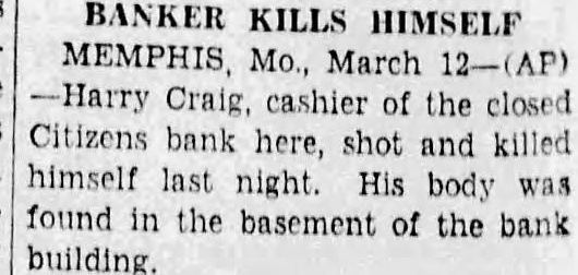 Article (Springfield Leader and Press, 1932-03-12) reports the bank was already closed and the cashier Craig committed suicide in the bank basement. No mention of a prior run; closure appears permanent. Cause of suspension not specified in the article. Date of suicide inferred as 1932-03-11 (last night relative to publication date).