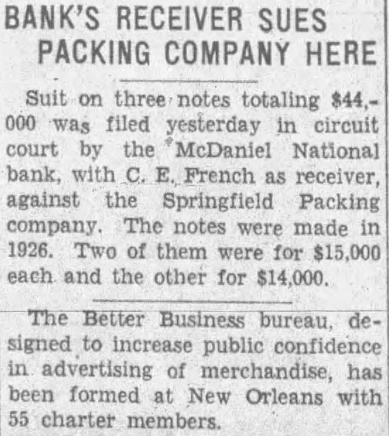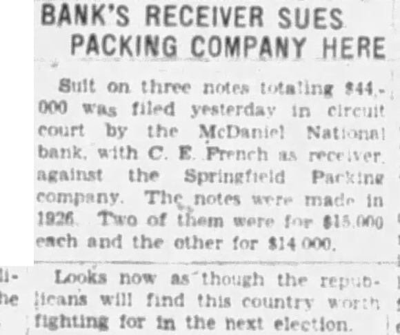 Suit on three notes totaling $44.000 was filed yesterday in circuit court by the McDaniel National bank, with C. E. French as receiver, against the Springfield Packing company. The notes were made in 1926. Two of them were for $15,000 each and the other for $14,000.