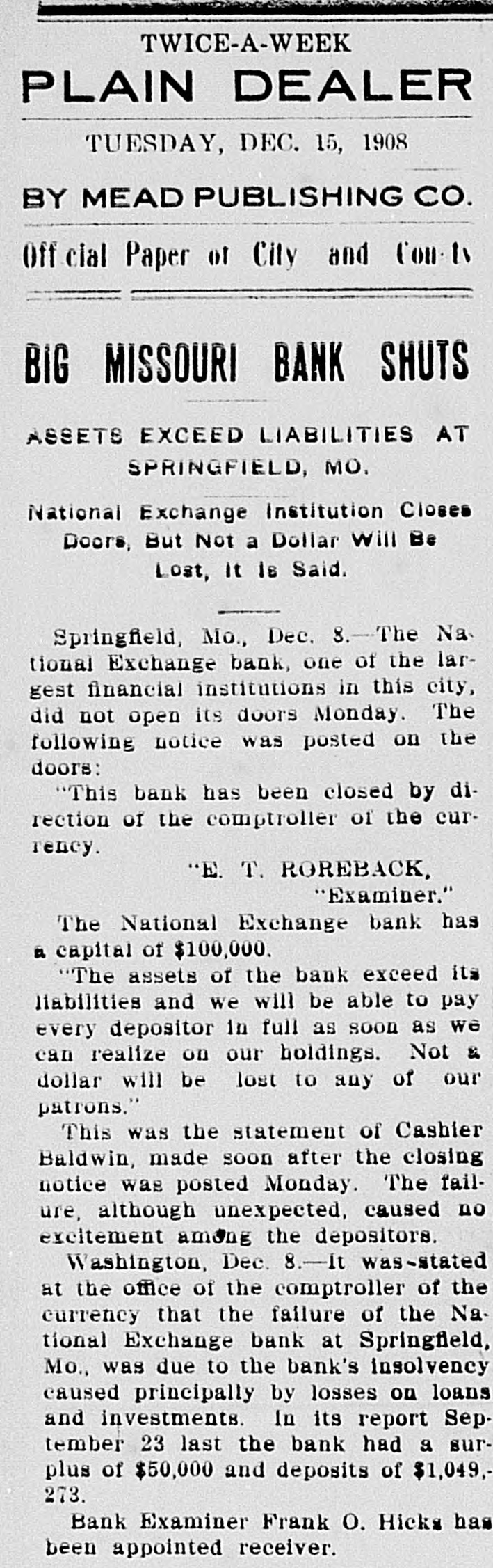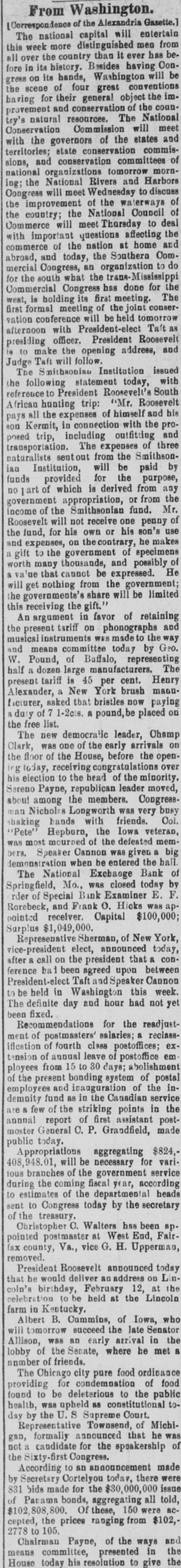 From Washington. [Correspondence of the Alexandria Gasette. The national capital will entertain this week more distinguished men from all over the country than it ever has be fore in its bistory. Besides having Con gress on its hands, Washington will be the scene of four great conventions having for their general object the im provement and conservation of the coun try's natural resources. The Nationa Conservation Commission will mee with the governors of the states and territories; state conservation commis sions, and conservation committees o national organizations tomorrow morn ing; the National Rivers and Harbor Congress will meet Wednesday to discus the improvement of the waterways 0 the country; the National Council 0 Commerce will meet Thursday to dea with important questions affecting the commerce of the nation at home and abroad, and today, the Southern Com mercial Congress, an organization to do for the south what the trans-Mississipp Commercial Congress has done for the west, is holding its first meeting. The first formal meeting of the joint conser vation conference will be held tomorrow afternoon with President-elect Taft as presiding officer. President Roosevel is to make the opening address, and Judge Taft will follow. The Smithsoniau Institution issued the following statement today, with reference to President Roosevelt's South African hunting trip: "Mr. Roosevel pays all the expenses of himself and hi son Kermit, in connection with the pro posed trip, including outfiting and transportation. The expenses of three naturalists sentout from the Smithson ian Institution, will be paid by funds provided for the purpose no part of which is derived from any government appropriation, or from the income of the Smithsonian fund. Mr. Roosevelt will not receive one penny o the fund, for his own or his son's use and expenses, on the contrary, he make a gift to the government of specimen worth many thousands, and possibly o & that cannot be expressed. H will get nothing from the government the governments's share will be limited this receiving the gift." An argument in favor of retaining the present tariff on phonographs and musical instruments was made to the way and means committee today by Geo W. Pound, of Buffalo, representio half a dozen large manufacturers. Th present tariff is 45 per cent. Henry Alexander, a New York brush manu facturer, asked that bristles now paying a duty of 7 1-2cts. a pound, be placed or the free list. The new democratic leader, Cham Clark, was one of the early arrivals or the floor of the House, before the open ing today, receiving congratulations ove his election to the head of the minority Sereno Payne, republican leader moved about among the members. Congress man Nicholss Longworth was very busy baking hands with friends. Col "Pete" Hepburn, the Iowa veteran was most mourned of the defeated mem bers. Speaker Cannon was given a big demonstration when be entered the ball The National Exchange Bank o Springfield, Mo., was closed today by rder of Special Bank Examiner E. F Rorebeck, and Frank o. Hicks was ap nointed receiver. Capital $100,000 Surplus $1,049,000. Represenative Sherman, of New York vice-president elect, announced today after a call on the president that a con ference bai been agreed upon between President-elect Taft and Speaker Cannot to be held in Washington this week The definite day and hour had not ye been fixed. Recommendations for the readjust ment of postmasters' salaries; a reclass iflection of fourth class postoffices; ex tension of annual leave of postoffice em ployees from 15 to 30 days; abolishmen of the present bonding system of posts employees and inauguration of the in demnity fund as in the Canadian servic are 8 few of the striking points in th annual report of first assistant post moster General C. P. Grandfield, made public today. Appropriations aggregating $824, 408,948.01, will be necessary for vari ious branches of the government servic during the coming fiscal year, according to estimates of the departmental head sent to Congress today by the secretary of the treasury. Christopher C. Walters has been ap pointed postmaster at West End, Fair fax county, Va., vice G. H. Upperman removed. President Roosevelt announced today that he would deliver an address on Lin coln's birthday, February 12, at th celebration to be held at the Lincoln farm in Kentucky. Albert B. Cummins, of Iowa, wh will tomorrow succeed the late Senato Allison, was an early arrival in th lobby of the Senate, where he met number of friends. The Chicago city pure food ordinanc providing for condemnation of food found to be deleterious to the publi health, was upheld as constitutional to day by the U. S Supreme Court. Representative Townsend, of Michi gan, formally announced that he wa not a candidate for the speakership 0 the Sixty-first Congress. According to an announcement made by Secretary Cortelyou today, there wer 831 bids made for the $80,000,000 issu of Parama bonds, aggregating all told $102 808 800, Of these, 150 were ac cepted, the prices ranging from $102,