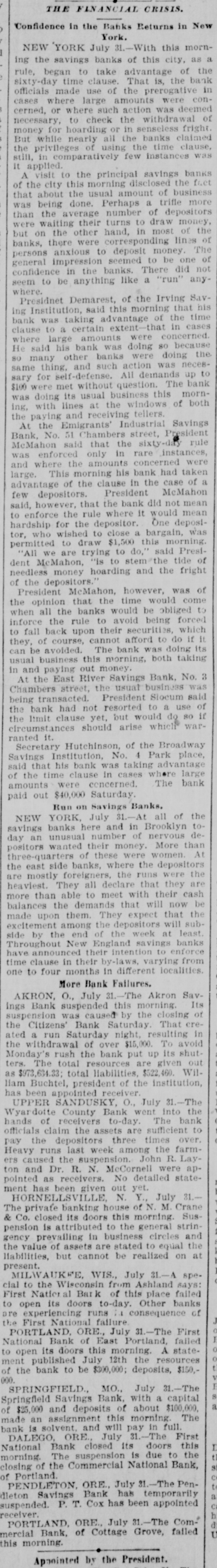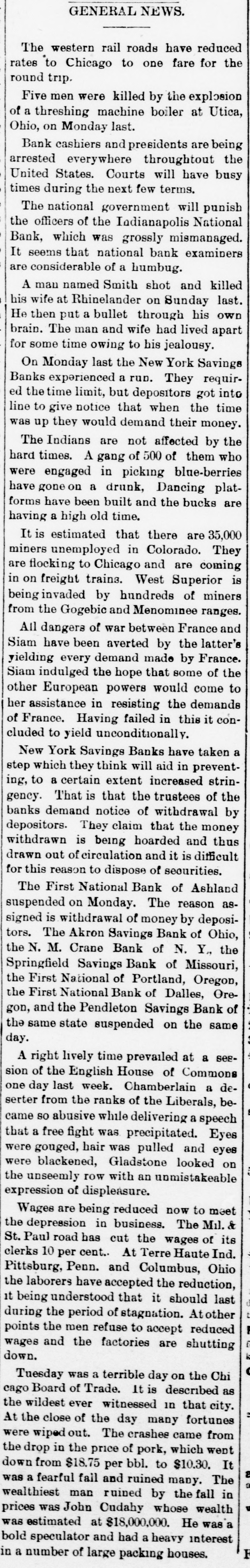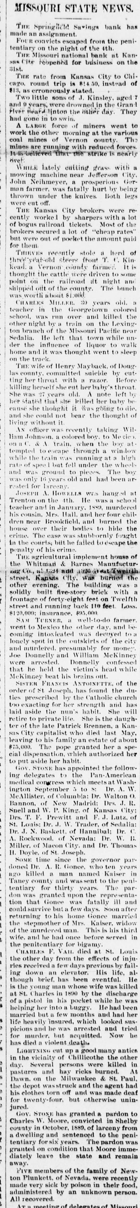 , MISSOURI STATE NEWS. , $ New Postmasters. The following new postmasters of the fourth class have been appointed for Missouri: I ) Belmont. Mississippi county. James McFadden. Jr.. vice George Watson. removed. Fayetteville. Johnson county E. J. Seigfried. , vice E. Kellar. removed Prohna, Perry county. H.G. Pallsch. vice A. Luedero, removed. Fyan. Laclede county. W. R. Bench. vice J. W. Brownfield removed. Walnut Shade. Taney county. Mary M. Sellers. vice B. L. Waddle. resigned. Asper. Carroll county. Samuel Millay, vice W.J. Stephens. resigned, Doniphan. Ripley county, Edwin Ferguson, vice F. W. Bell. removed. Cave Spring. Greene county, W. R. McLinn, vice Nancy Vestal. resigned. Eldon, Miller county. T. M. Silvey, vice Rosa Eaton. removed. Gordonville, Cape Girardeau county. Peter Horman. vice Claus Kerstner. removed. Grapby. Newton county W. W. Hamilton, vice W.W. Hudson, removed. Hinton. Boone county. C. W. Martin, vice T. J. Gallup. resigned. Ironton. Ironton county, A. P. Vance, vice Thomas Beard, removed Jake Prairie, Crawford county L D. House wright. GeorgeMcAllister. resigned. Locust Hill. Knox county, R. H. Payne, vice James Sherer. removed. Medicine. Livingston county. G. W. Babb, vice C. V. Sampson. resigned. Morrisville, Polk county. T. C. Mitchell, vice H. M. Rhynes. removed Oran. Scott county. Alexander Wright. vice R. H. Queery. removed. Roy. Douglas county. W. A. Hartin. vice J.E. Smith. resigned. Vienna. Maries county. S. A. Gremp. vice J. F. Rowan. removed. Coatsville. Schuyler county. J. M. Guin. vice H.S Albert. removed. Hockman Benton county, A. H. Gist. vice F. L Bagwell. removed. Martinstown. Putnam county. T.P. Martin, vice H. R. Archer. removed. Summersville, Texas county. Mrs. M. E. Smith. vice P. Baskett. removed NEW POST OFFICES. Ulf. Phelps county, Edward J. Kendall, postmaster. Drum. Bollinger county. John W. Laird, postmaster. Panama. Vernon county. Mark M. Woodson, postmaster. A Bank Failure at Springfield. The Springfield bank of Commerce, capital stock $50,000 and deposits of $17,600, according to last statement. has failed. BANK OFFICIALS ARRESTED. SPRINGFIELD, Mo., July 14.-T. E. Burlin game, president, and E. P. Newman, cashier of the suspended Bank of Commerce, have been arrested on a warrant sworn out by Jack Carr. one of the depositors of the defunct institution, charging the defendants with receiving money after they knew that failure was inevitable. The tank officials were taken before Justice Faith and held on a bond of $1,000 each. The arrest of Burlingame and Newman caused considerable feeling. and the uneasiness in business circles continues to prevail. Attachment against the Bank of Commerce aggregating about $18,500 are on file in the circuit clerk's office. The Springfield Savings bank has posted a notice on its-doors saying that the 30-day rule respecting the withdrawal of deposits will be enforced. This does not mean a failure. as the bank is in a safe condition. the Exchange bank of this city having recently bought a controlling interest of the stock. The Exchange is one of the strongest banks in the city and can easily sustain the Savings bank in this erisis. LOOKS BAD. SPRINGFIELD. July 15.-The most serious feature against the bank officials is that for several days before the failure Mayor Parce and T. C. Burlingame were making conveyances of property to various persons. About thirty deeds were executed in favor of members of their families and other persons, thus conveying a large amount of valuable real estate in Springfield. In the face of this apparent preparations for a crisis. the bank continyed to receive deposits up to within an hour of its suspension. The Gray failure, which occurred at the same time the Bank of Commerce closed its doors, is said to have been little peculiar. Mayor Parce. T. C. Burlingame and J.T. Gray are brothers-in-law. It is claimed that these three men had borrowed of the Bank of Com merce from 856,000 to $96,000.