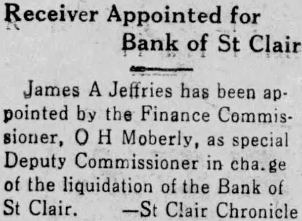 Receiver Appointed for Bank of St Clair James A Jeffries has been appointed by the Finance Commissioner, O H Moberly, as special Deputy Commissioner in charge of the liquidation of the Bank of St Clair. -St Clair Chronicle