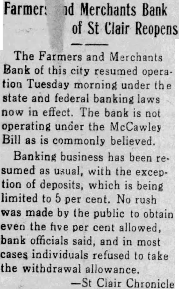 St. Clair Bank Reopen After Brief Suspension Mr. and Mrs. Graf were in St. Clair, Mo., Wednesday evening where Mr. Graf presided and spoke mass meeting of stockholders and depositors of the Farmers & Merchants Bank of St. Clair in lin County. The bank suspended business last week because of heavy withdrawals. There are two banks in St. Clair, one of them having closed few weeks ago. It is expected to consolidate the two banks. The & Bank of St. Clair is in healthy condition and no waiver of any percentage of deposits is asked. It is expected to reopen the bank as soon as the depositors have agreed to restriction of withdrawals. Fully sixty per cent of the depositors have signed the restriction agreement and it is pected to reopen the bank within few days.