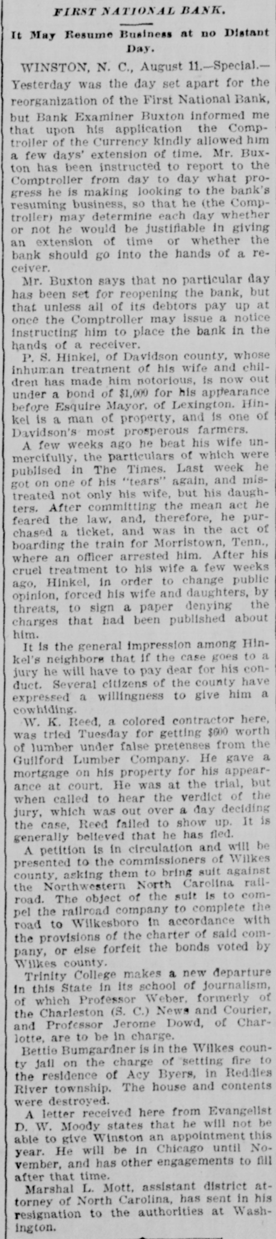 FIRST NATIONAL BANK. It May Resume Business at no Distant Day. WINSTON, N. C., August 11.-Special.Yesterday was the day set apart for the reorganization of the First National Bank, but Bank Examiner Buxton informed me that upon his application the Comptroller of the Currency kindly allowed him a few days' extension of time. Mr. Buxton has been instructed to report to the Comptroller from day to day what progress he is making looking to the bank's resuming business, so that he (the Comptroller) may determine each day whether or not he would be justifiable in giving an extension of time or whether the bank should go into the hands of a receiver. Mr. Buxton says that no particular day has been set for reopening the bank, but that unless all of its debtors pay up at once the Comptroller may issue a notice instructing him to place the bank in the hands of a receiver. P. S. Hinkel, of Davidson county, whose inhuman treatment of his wife and children has made him notorious, is now out under a bond of $1,000 for his appearance before Esquire Mayor, of Lexington. Hinkel is a man of property, and is one of Davidson's most prosperous farmers. A few weeks ago he beat his wife unmercifully, the particulars of which were publised in The Times. Last week he got on one of his "tears" again, and mistreated not only his wife, but his daughters. After committing the mean act he feared the law, and, therefore, he purchased a ticket, and was in the act of boarding the train for Morristown, Tenn., where an officer arrested him. After his cruel treatment to his wife a few weeks ago, Hinkel, in order to change public opinion, forced his wife and daughters, by threats, to sign a paper denying the charges that had been published about him. It is the general impression among Hinkel's neighbors that if the case goes to a jury he will have to pay dear for his conduct. Several citizens of the county have expressed a willingness to give him a cowhiding. W. K. Reed, a colored contractor here, was tried Tuesday for getting $600 worth of lumber under false pretenses from the Guilford Lumber Company. He gave a mortgage on his property for his appearance at court. He was at the trial, but when called to hear the verdict of the jury, which was out over a day deciding the case, Reed failed to show up. It is generally believed that he has fled. A petition is in circulation and will be presented to the commissioners of Wilkes county, asking them to bring suit against the Northwestern North Carolina railroad. The object of the suit Is to compel the railroad company to complete the road to Wilkesboro in accordance with the provisions of the charter of said company, or else forfeit the bonds voted by Wilkes county. Trinity College makes a new departure in this State in its school of journalism, of which Professor Weber, formerly of the Charleston (S. C.) News and Courier, and Professor Jerome Dowd, of Charlotte, are to be in charge. Bettie Bumgardner is in the Wilkes county Jall on the charge of setting fire to the residence of Acy Byers, in Reddies River township. The house and contents were destroyed. A letter received here from Evangelist D. W. Moody states that he will not be able to give Winston an appointment this year. He will be in Chicago until November, and has other engagements to fill after that time. Marshal L. Mott, assistant district attorney of North Carolina, has sent in his resignation to the authorities at Washington.