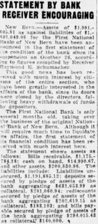 The last bank to go under is the first National Bank of Winston. The public statements say, that their liabilities are only $25,000, while their assets are about $400,000. Unless this Bank is an exception to the rule, (and we have some hope that it is) the fact will develop to be that the depositors will get about 50 ets. on the dollar. We have been struck very forcibly, with nearly all of these Bank failures, with the fact that they would never have been able to pay dollar for dollar, if there had been no financial panic; that they were rotten and bound to break sooner or later, and that they simply took this convenient time to break, while breaking was fashionable, and and they could have some excuse. It will not do for the people to trust, or for the country to depend on such a rotten financial system any longer. The whole thing needs renovating and re-ertablishing on the principle of Jacksoman Democracy.