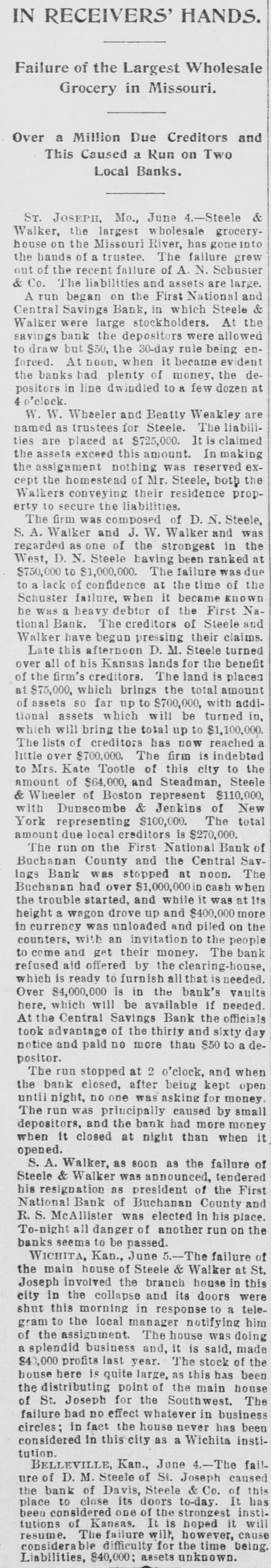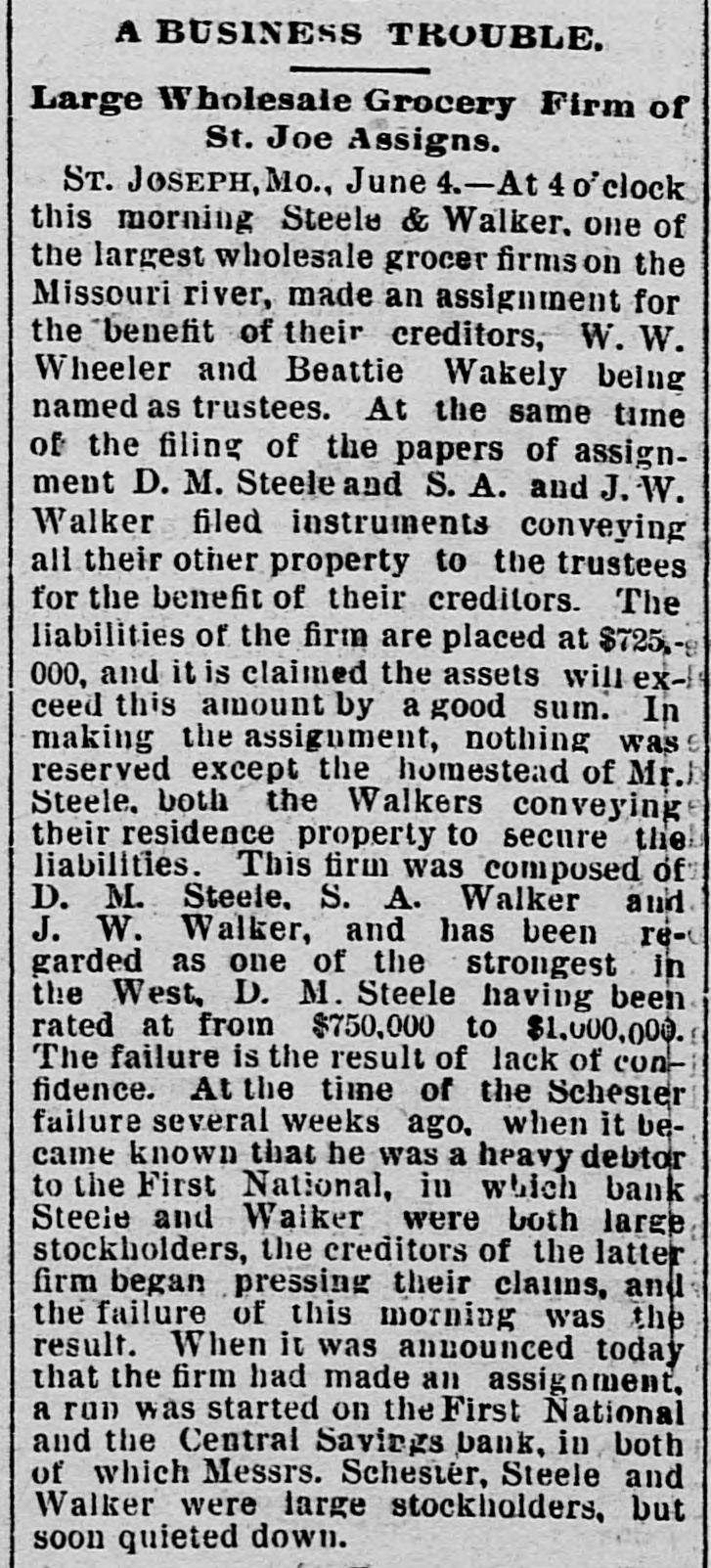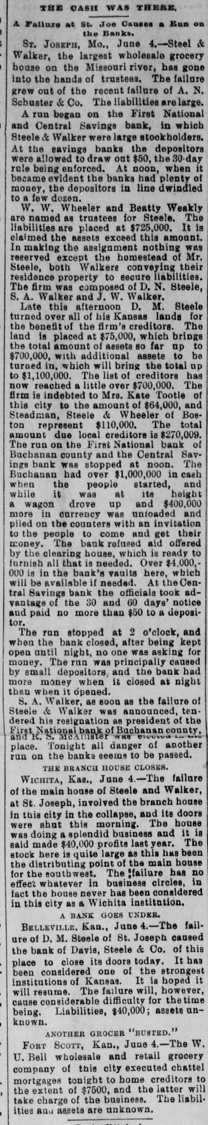 A BIG FAILURE. The Largest Mercantile House in St. Joseph, Mo., Goes Under-A Run on the Banks St. Joseph, Mo., June 4.-Steel & Walker, the largest wholesale grocery house on the Missouri river, has gone into the hands of a trustee. The failure grew out of the recent failure of A. N. Schuster & Co. The liabilities and assets are large, but are not yet known. Great crowds are around the First National and Central Savings banks, both of which were largely owned by men interested in the Schuster and Steel & Walker failures. Both banks are holding time deposits. The liabilities of the firm are placed at $725,000 and it is claimed the assets will exceed this amount by a good sam. In making the assignment nothing was reserved except the homestead of Mr. Steel, both the Walkers conveying their residence property to secure the liabilities. The firm was composed of D. M. Steel, .A. Walker and J. W. Walker and has been regarded as one of the strongest in the west, D. M. Steel having been rated at from $750,000 to $1,000,000. THE BANKS BEING PRESSED. The failure is the result of lack of confidence. At the time of the Steele failure several weeks ago when it became known that he was a heavy debtor to the First National bank in which bank Steele & Walker were both large holders, the creditors of the latter firm began pressing their claims and the failure of this morning was the result. When it was announced to-day that the firm had made an assignment a run commenced on the First National and Central Savings banks, in both of which Steele & Walker were large stockholders. Considerable excitement was caused by the run and thousands of dollars were drawn out shortly after the opening hour. In the case of the Savings bank the depositor was allowed to draw out only $50, the thirty day rule being enforced on all checks for a larger amount. At noon when it became known that the banks had plenty of money the crowds of depositors dwindled to a few dozen, whereas before this time the line extended far out into the street. It is claimed that both banks will pull through, and it is hardly likely that the run will extend to any other bank or last longer than to-day. A BRANCH HOUSE SUSPENDS. Wichita, Kas.-Steele & Walker's branch house at this place closed to-day on account of the failure of the St. Joseph house.