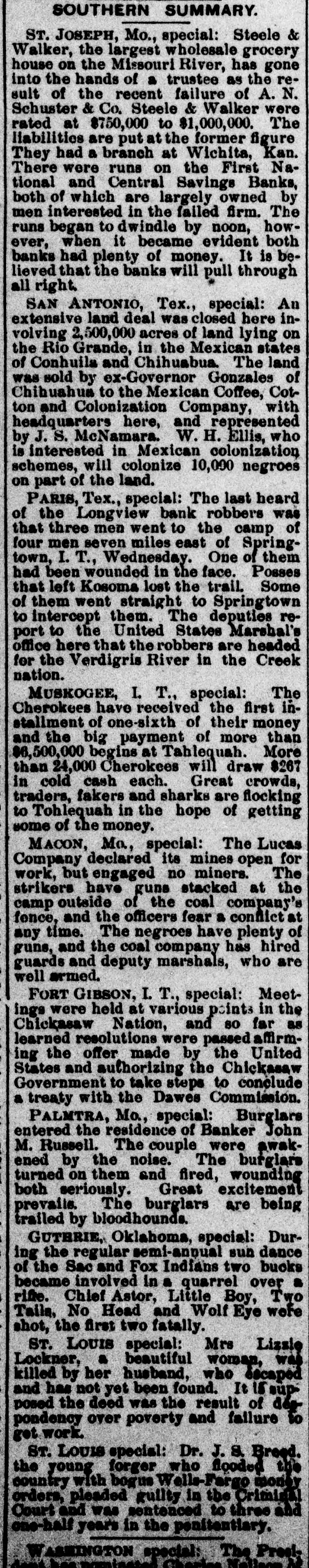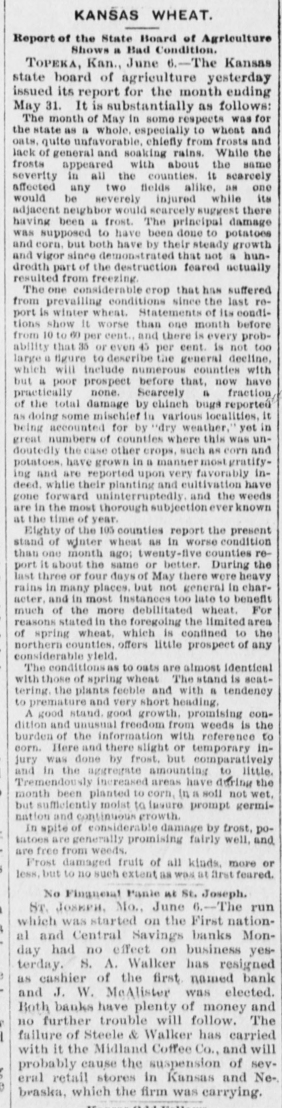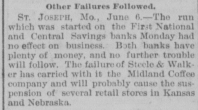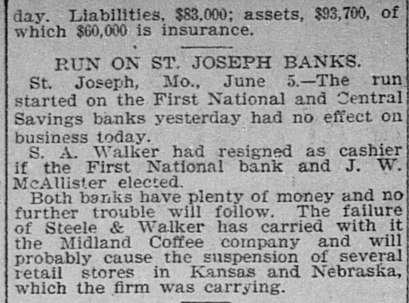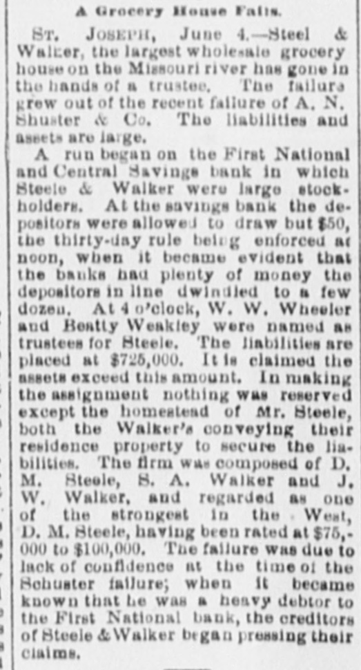 A BIG FAILURE. The Largest Mercantile House in St. Joseph, Mo., Goes Under-A Run on the Banks St. Joseph, Mo., June 4.-Steel & Walker, the largest wholesale grocery house on the Missouri river, has gone into the hands of a trustee. The failure grew out of the recent failure of A. N. Schuster & Co. The liabilities and assets are large, but are not yet known. Great crowds are around the First National and Central Savings banks, both of which were largely owned by men interested in the Schuster and Steel & Walker failures. Both banks are holding time deposits. The liabilities of the firm are placed at $725,000 and it is claimed the assets will exceed this amount by a good sam. In making the assignment nothing was reserved except the homestead of Mr. Steel, both the Walkers conveying their residence property to secure the liabilities. The firm was composed of D. M. Steel, .A. Walker and J. W. Walker and has been regarded as one of the strongest in the west, D. M. Steel having been rated at from $750,000 to $1,000,000. THE BANKS BEING PRESSED. The failure is the result of lack of confidence. At the time of the Steele failure several weeks ago when it became known that he was a heavy debtor to the First National bank in which bank Steele & Walker were both large holders, the creditors of the latter firm began pressing their claims and the failure of this morning was the result. When it was announced to-day that the firm had made an assignment a run commenced on the First National and Central Savings banks, in both of which Steele & Walker were large stockholders. Considerable excitement was caused by the run and thousands of dollars were drawn out shortly after the opening hour. In the case of the Savings bank the depositor was allowed to draw out only $50, the thirty day rule being enforced on all checks for a larger amount. At noon when it became known that the banks had plenty of money the crowds of depositors dwindled to a few dozen, whereas before this time the line extended far out into the street. It is claimed that both banks will pull through, and it is hardly likely that the run will extend to any other bank or last longer than to-day. A BRANCH HOUSE SUSPENDS. Wichita, Kas.-Steele & Walker's branch house at this place closed to-day on account of the failure of the St. Joseph house.