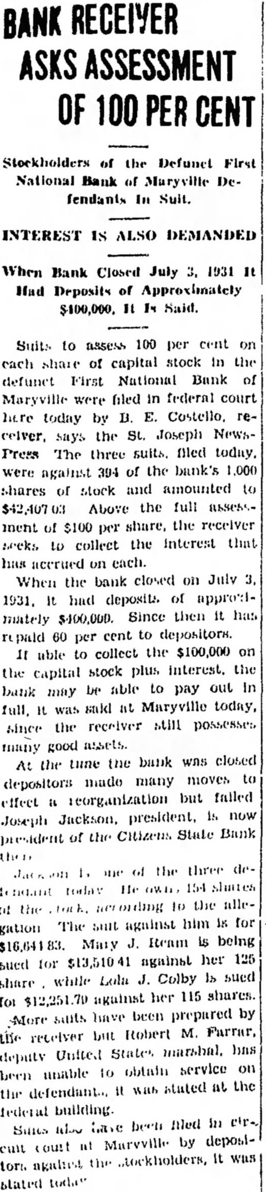 ASSESSMENT Stockholders of the Defunct First National Bank of fendants In Suit. INTEREST IS ALSO DEMANDED When Bank Closed July 1931 Had Deposits of Suits to assess 100 per cent on share of capital stock in the each defunct First National Bank of were filed in federal court today by the St. Joseph Newssays Press The three filed today. of the bank's against shares of stock and amounted to Above the full assessof share, the receiver ment $100 per collect the that seeks to has accrued on each. bank closed on July When the 1931, It had deposits. of approdSince then it has mately $400,000. repaid 60 per cent to depositors. able to collect the $100,000 on stock plus interest. the the capital able to pay out in bank be may today, full, receiver still possesses the good assets. many the bank was closed At the time moves to depositors made many but failed effect president, is now Joseph Citizens State Bank president of the the three 10 the him for The against gation is being Mary her 125 for against sued Colby sued share while shares. against for been prepared by have Robert M. receiver marshal. has United States deputy obtain service on been unable stated at the the federal building. in been by cuit