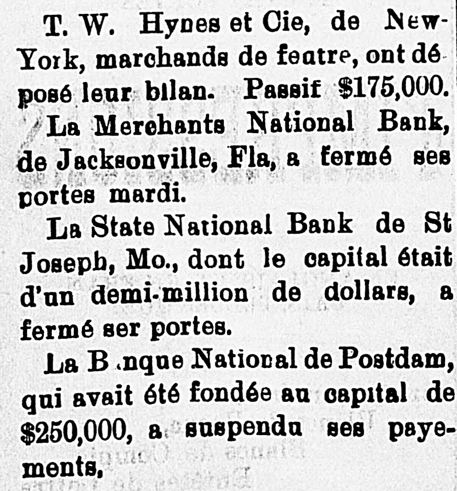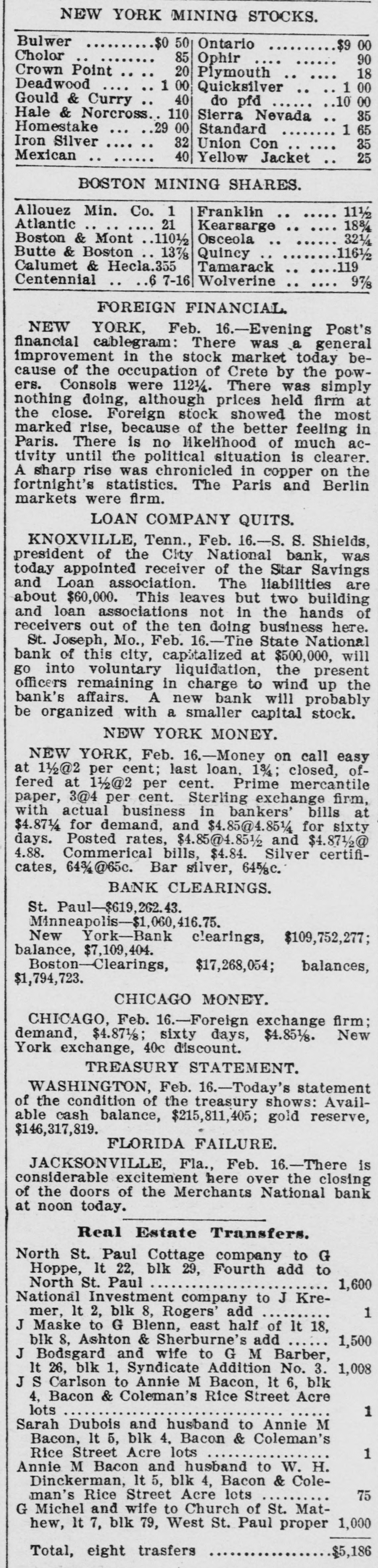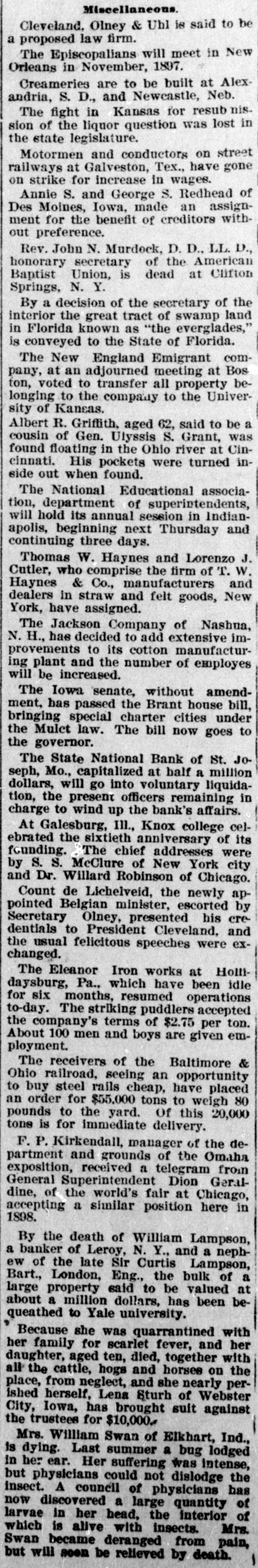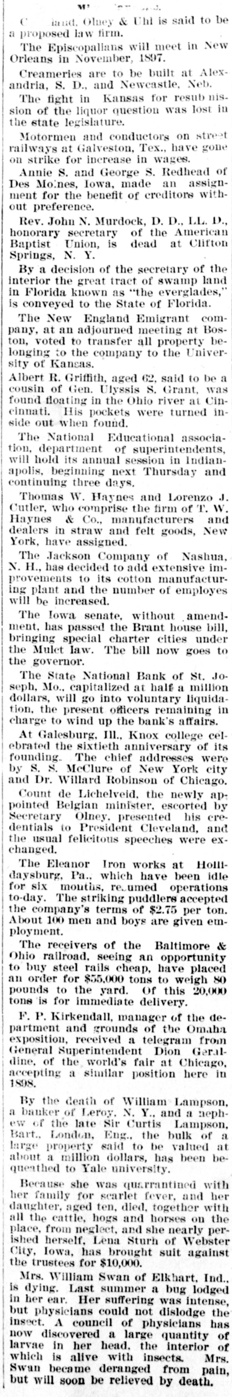 FROM ALL QUARTERS. NEWS COMPRESSED FOR THOSE WHO WANT IT THAT WAY. Nothing of Importance Has Been Allowed to Escape, and Everyone May Find Something In Which He Is Interested In Some Way or Other. Friday. was The destroyed Webster by block fire. of Gloucester, Mass., Otto Slough of South Bend, Ind., died from a ruptured blood vessel. Thomas Willis, murderer of his infant child, was banged at Wilmington, Del. The Rhodes Morton general merchandise store of Ronceverte, W. Va., has assigned. The Missouri legislature has appropriated $1,800 to erect a monument over the grave of Mo. Daniel Boone, buried in Warren county, Ex-State Treasurer J. S. Bartley of Nein bráska has a deficit of $500,000 staring him failed. the face. He helped state banks which George D. Cochrane of Toledo has wedded the Miss Grace Warner of St. Paul against waiting wishes three of years. her millionaire father after In order to entertain Ohio people during the inauguration the Ohio Republican association G street, Washington. has opened headquarters at 1227 prices. Dun's review notes a general increase in Thursday. Major General Robinson died at Binghamton, N. Y., aged 80. Ed Flanagan escaped from a lynching mob at Decatur, Ala. In a prize fight in Cincinnati Benny Coleman was killed by William Wright. The Spanish officials have agreed to release General Sanguilly immediatey. The International Association of Ticket Agents will meet in San Autonio, Tex., March 10. A death watch has been placed on murderers ton Jackson and Walling in the Coving(Ky.) jain. A. W. Davis and wife were mistaken for government agents at Hamburg, Ky., and roughly handled. The Populint legislators of Kansas have admitted their error and agreed to conduct affairs legally hereafter. The Transvaal government has demanded $3,389,940 material damages for the Jameson raid and $5,000,000 "smart money. A band of Spanlards who had been sent dren out by Weyler to murder women and chilThree was almost annihilated by insurgents. Texas hundred armed frontlersmen from and and Colorado with a cargo of arms Cuba, ammunition have sailed from Dallas to Wednesday. at John Shouls, Walker Ind. shot and killed Marion Tow The strike at the Spring HIII (N. S.) coal mines has been settled. The State National bank of St. Joseph, Mo., has gone into voluntary liquidation. The Kansas senate passed a resolution treaty. protesting against the general arbitration II Herr Wegner, editor of The Deutsche e Tages Zeiturg, Berlin, has been sentenced to two months' imprisonment. General Weyler has pronounced the death sentence on all who refuse spathsa bank bills at their face value. T. W. Hypes & Company, manufacturers of straw a felt goods, New York, have assigned, assets. V. val liabilities largely exceeding is The Cuban insurgents made a dash into a Spanish camp, killing over 100 of the pressors and putting the balance to disor- opof derly flight. r Jesse Harrison was shot and killed at Whitesburg, Tenn., by J. A. Cost who objected to Harrison's attention to Lena Sykes, Cox's servant girl. Tuesday. Three feet of snow feel at Tacoma, Wash. Senor Lazerda was shot at Moro Castle at sunrise. The Idaho legislature Is considering a bill to permit prizefighting. Osmond Walter Jeffs was arrested at is Liverpool for embezzling $10,000. Greece declares she will not be intimite dated by the so-called powers of Europe. of The staamer Rhode Island is three weeks overdue at Providence and it is feared she is lost. Cubans captured a "tyrant" train, secured h guards. $600,000 in silver and killed ten guerilla E The government has seized the steámer as Bermuda at Philadelphia on suspicion that she might go to Cuba. O. Eugene P. Speer, chief clerk of a divisio of in the treasury department, stabbed Will he liam Callow in Washington. John Johnson, the skater and cyclist, is lying dangerously III at Brantford, Ont., with congestion of the lungs. io Jacob F. Shaeffer's distillery at Lancaster, Pa., has been seized for the nonpayment of about $45,000 taxes due. ts Kinonska, a prominent Japanese lawyer ur has and a member of the Japanese parliament, come to America to study the laws regulating transportation. g Monday. Archbishop Grace died at St. Paul. President Nick Young has finished his is schedule for games for next season. -4 Otis O. Smith, cashier of the Georgia Se curity company, confessed to embezzlement & Isaac Smith, the Pike county murderer, nd recently pardoned, has written a book of his life. in Two girls were dismissed from Wesleyan college at Macon, because of their passion for playing with fire. ce Senator Sherman denounced as a lie the ry New York Journal interview, quoting him as favoring war with Spain. 11 The officials of the Burlington route will ne make no reduced rate to Carson, Nev., on an account of the prizefight, regarding the event as beneath their notice. Saturday. An entire block, valued at $225,000, was uburned in Grand Forks, N. D. ed French warships bombarded a village on W, Tahoa island and subdued the natives. rMrs. Mary Sketon, wealthy divorced woman of Chicago, suicided in New York. John Kelley Sargent, the oldest Mason Mass. the United States, is dead at Merrimac, in ce James Chadwell and family were drowned rlevee. near Middleboro, Ky., by the breaking of at id Germany and Austria are the only Athens. which favor the blockading of the port powers of Students of Harvard refused to attend nchapel preach. to hear a Roman Catholic priest by A baby girl weighing eight and P. half re, pounds Harrison. was born to ex President and Mrs. The king of Korea has left the Russian legation, where he has been ever since he murdered the queen. of A Norfolk and Western express train the into a washout and was wrecked, seriously rar ce: injuring several employes. It is announced from Washington that the too present administration will take no action hit In the murder of Dr. Ruiz In Cuba. in The royal family of Greece have appeal ed to the royal family