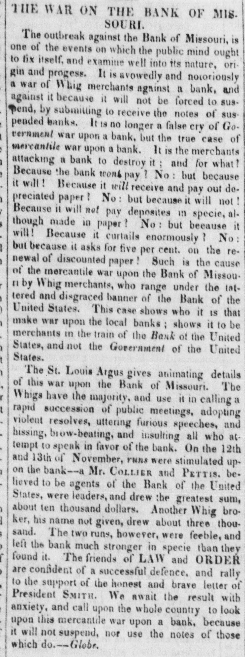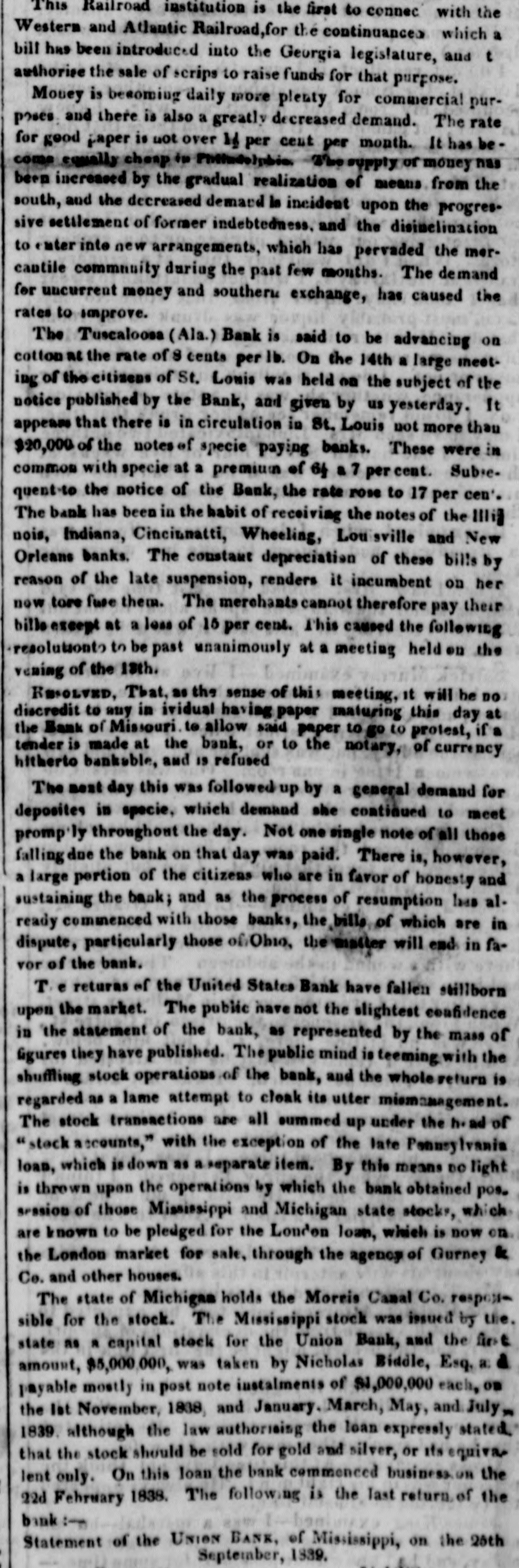 to the Secretary of the Commonwealth, to declare, by proclamation, the names of the respective persons duly elected in each district; and he shall, AS SOON AS CONVENIENTLY may be thereafter, transmit the said returns SO made to him, to the House of Representatives in the Congress of the United States."--U. S. Gazette. Bank Excitement in St. Louis.-We learn from the Missouri Republican of No. vember 14, that great excitement existed in the city of St. Louis during the whole of the preceding day, in consequence of a certain resolution published by the direc. tors of the Bank of Missouri on the 12th, that no but specie or the bills of specie-paying currency banks falling would due be the received bank.- in payment of notes at One or two public meetings had been held. and a correspondence had taken place beand the in conwere entertween sequence the of bank which of rosolutions merchants, indignation ed into expressive great at the conduct of the bank, and of a determination to resist it even to the extent of stopping payment on all notes held by the bank, unless payment should be received, as heretofore, in notes usually current in that part of the country. Our latest account is from the St. Louis Bulletin of November 15, which says The excitement prevailing here at present in regard to the movement of the bank is immense. Business, in a manner, is suspended, and the all engrossing theme is the conduct of the bank."--Nat. Intel. Messrs. Strange, Gab'l Holmes and oth. ers, speak of Bank Stock owners, and Bank Officers as usurers and speculators," vet the one is a Director of the Bank of Cape Fear, and the other is a Director and is, or was, Bank they.--Wilmington Advertiser. Good out of Evil.-There are five States in choice to has been gress which the improperly have of Senators of deferred. the five Con- We shall now 4 susviz: one the pended Senators, probably in each of States of New York, Michigan, Virginia and Delaware, while the Locos must be content with one from Pennsylvania.-N. Y. Whig. Important.-The Baltimore Chronicle of yesterday contained the following paragraph. We regret to learn that three gentle. of this men city, occupying arrested respectable and held positions in society, were to bail on Saturday, upon a charge of be. ing concerned in fitting out vessels designed to be employed in the Slave Trade. Look out for more Murrel men.-A few days since, two gentlemen in a carriage, into the neighborhood of Joseph in sold to Spurgen, came a Negro Esq. Mr. Davidson Jacob County, Yokely, and for $600. Mr. Yokely paid them in two horses, and $100 in cash-after which left the negro seemed well new they pleased neighborhood. with his The home until Saturday night last, when he decamp. ed, and has not been heard of since. The is, the was negro presumption whole designed from circumstances, by the his that and men, to swindle Mr. Yokely out of property. After the men left, he was seen to have $100 bill, and some specie. Mr. is said to be an Yokely, a honest, hard-work- to ing man, but not SO well qualified judge between a Murrel man and an honest man. It would be well for some of our honest farmers and tradesmen to be more on the alert towards strangers trafficking through the in stolen country, negroes Carolinian. and other property.-Western What is wanting," said Napoleon, that the youth of France be well educated? MOTHERS!" replied Madame Campan- This reply struck the Emperor.Here," said he, ' 18 a system of educa tioninone word! Be it your care to train up mothers who shall know how to educate their children.--AIME MARTIN. Great Pigeon Shooting.-Mr. Henry Keats shot last week, at eighteen shots, 784 pigeons. This is the greatest shooting we ever heard of, and we question whether it has ever been or can be beaten. The place at which he shot them was on a sand-