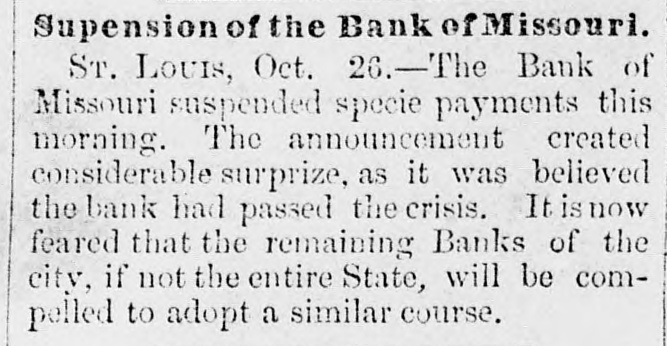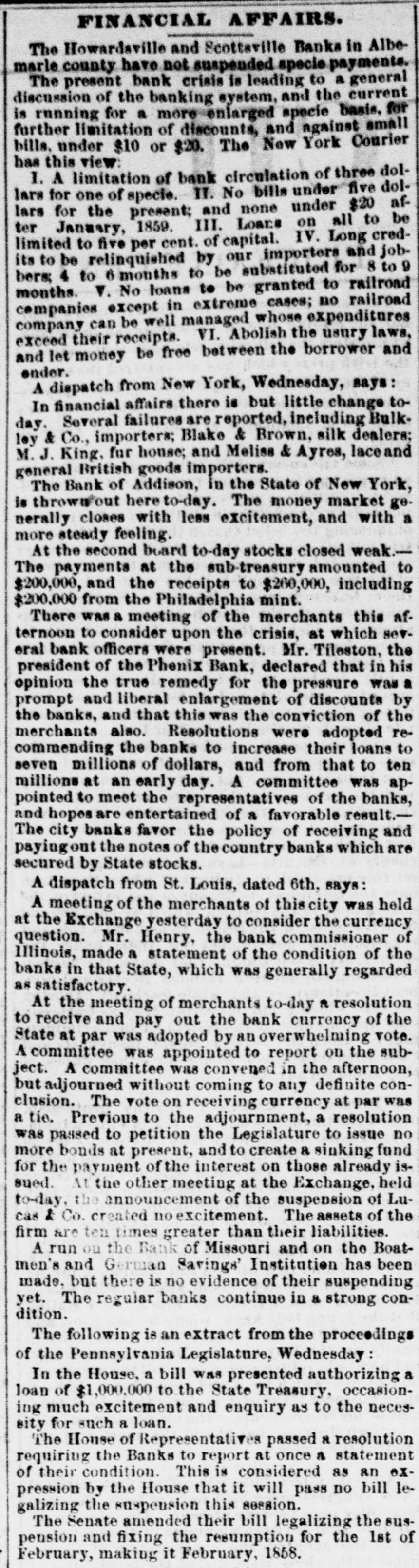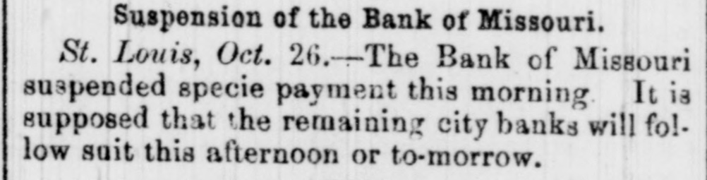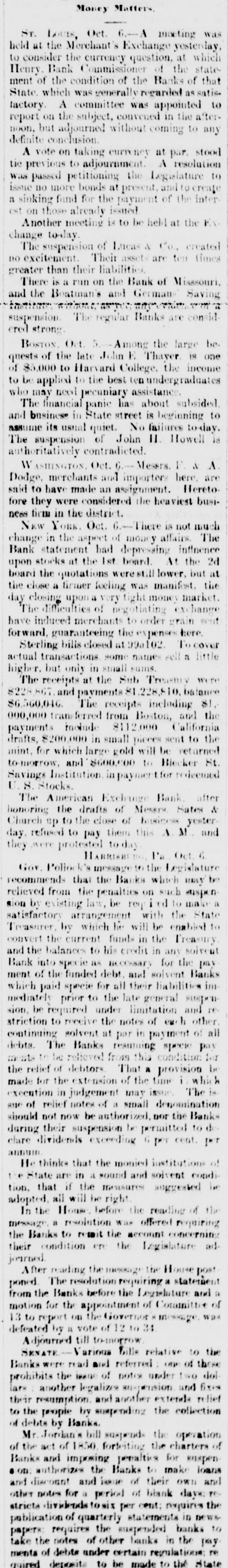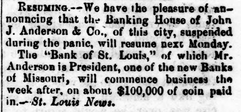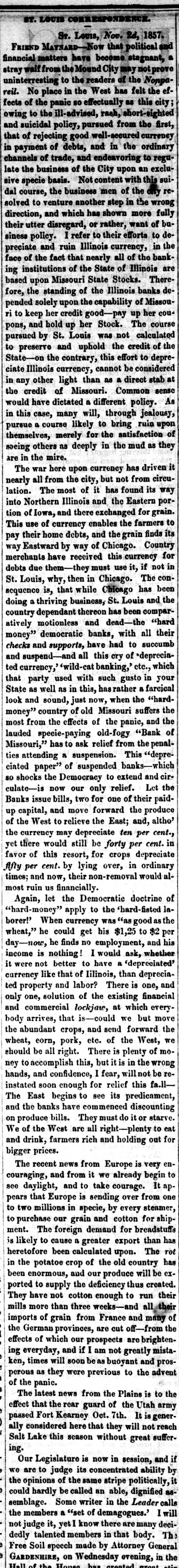 ST. LOUIS CORRESPONDENCE. Sr. LOUIS, Nov. 2d, 1857. FRIEND MAYNARD-NOW that political and financial matters have become stagnant, a stray waif from the Mound City may not prove uninterresting to the readers of the Nonpareil. No place in the West has felt the effects of the panic so effectually as this city owing to the ill-advised, rash, short-sighted and suicidal policy, pursued from the first, that of rejecting good well-secured currency in payment of debts, and in the ordinary channels of trade, and endeavoring to regulate the business of the City upon an exclusive specie basis. Not content with this suidal course, the business men of the city resolved to venture another step in the wrong direction, and which has shown more fully their utter disregard, or rather, want of business policy. I refer to their efforts to depreciate and ruin Illinois currency, in the face of the fact that nearly all of the banking institutions of the State of Illinois are based upon Missouri State Stocks. Therefore, the standing of the Illinois banks depended solely upon the capability of Missouri to keep her credit good-pay up her cou+ pons, and hold up her Stock. The course pursued by St. Louis was not calculated to preserve and uphold the credit of the State-on the contrary, this effort to depreciate Illinois currency, cannot be considered in any other light than as a direct stab at the credit of Missouri. Common sense would have dictated a different policy. As in this case, many will, through jealousy, pursue a course likely to bring ruin upon themselves, merely for the satisfaction of seeing others as deeply in the mud as they are in the mire. The war here upon currency has driven it nearly all from the city, but not from circulation. The most of it has found its way into Northern Illinois and the Eastern portion of Iowa, and there exchanged for grain. This use of currency enables the farmers to pay their home debts, and the grain finds its way Eastward by way of Chicago. Country merchants have received this currency for debts due them-they must use it, if not in St. Louis, why, then in Chicago. The consequence is, that while Chicago has been doing a thriving business, St. Louis and the country dependant thereon has been comparatively motionless and dead-the "hard money" democratic banks, with all their checks and supports, have had to succumb and suspend-and all this cry of depreciated currency,' 'wild-cat banking,' etc., which that party used with such gusto in your State as well as in this, hasrather a farcical look and sound, just now, when the "hardmoney" country of old Missouri suffers the most from the effects of the panic, and the lauded specie-paying old-fogy "Bank of Missouri," has to ask relief from the penalties attending a suspension. This "depreciated paper" of suspended banks-which so shocks the Democracy to extend and circulate-is now our only relief. Let the Banks issue bills, two for one of their paidup capital, and move forward the produce of the West to relieve the East; and, altho' the currency may depreciate ten per cent., yet there would still be forty per cent. in favor of this resort, for crops depreciate fifty per cent. by lying over, in ordinary times; and now, their non-removal would almost ruin us financially. Again, let the Democratic doctrine of "hard-money" apply to the 'hard-fisted laborer!' When currency was "as good as the wheat," he could get his $1,25 to $2 per day-now, he finds no employment, and his income is nothing! I would ask, whether it were not better to have a depreciated' currency like that of Iilinois, than depreciated property and labor? There is one, and only one, solution of the existing financial and commercial lockjaw, at which everybody arrives, that is-could we but move the abundant crops, and send forward the wheat, eorn, pork, etc. of the West, we should be all right. There is plenty of money to accomplish this, but it is in the wrong hands, and confidence, I fear, will not be reinstated soon enough for relief this fa.llThe East begins to see its predicament, and the banks have commenced discounting on produce bills. They must do it or starve. We of the West are all right-plenty to eat and drink, farmers rich and holding out for bigger prices. The recent news from Europe is very encouraging, and from it we already begin to see daylight, and to take courage. It appears that Europe is sending over from one to two millions in specie, by every steamer, to purchase our grain and cotton for shipment. The foreign demand for breadstuffs is likely to cause a greater export than has heretofore been calculated upon. The rot in the potatoe crop of the old country has been enormous, and our produce will be exported to supply the deficiency thus created. They have not cotton enough to run their mills more than three weeks-and all their imports of grain from France and many of the German provinces, are cut off-from the effects of which our prospects brightening everyday, and if I am not greatly mistaken, times will soon be as buoyant and prosperous as they were previous to the advent of the panic. The latest news from the Plains is to the effect that the rear guard of the Utah army passed Fort Kearney Oct. 7th. It is generally considered here that they will not reach Salt Lake this season without great suffering. Our Legislature is now in session, and if we are to judge its concentrated ability by the opinions of the same stripe politically, it could hardly be called an able, dignified as-