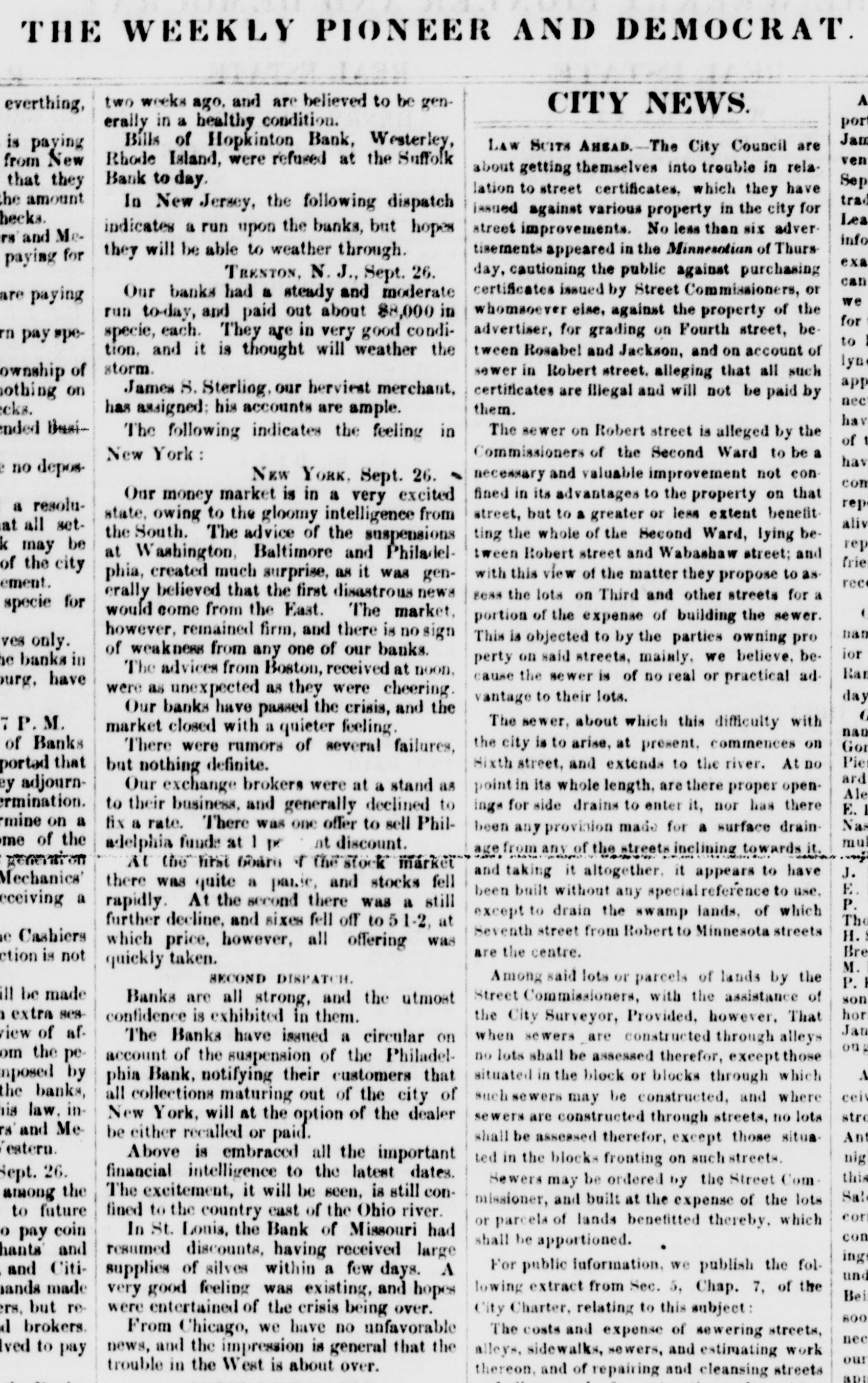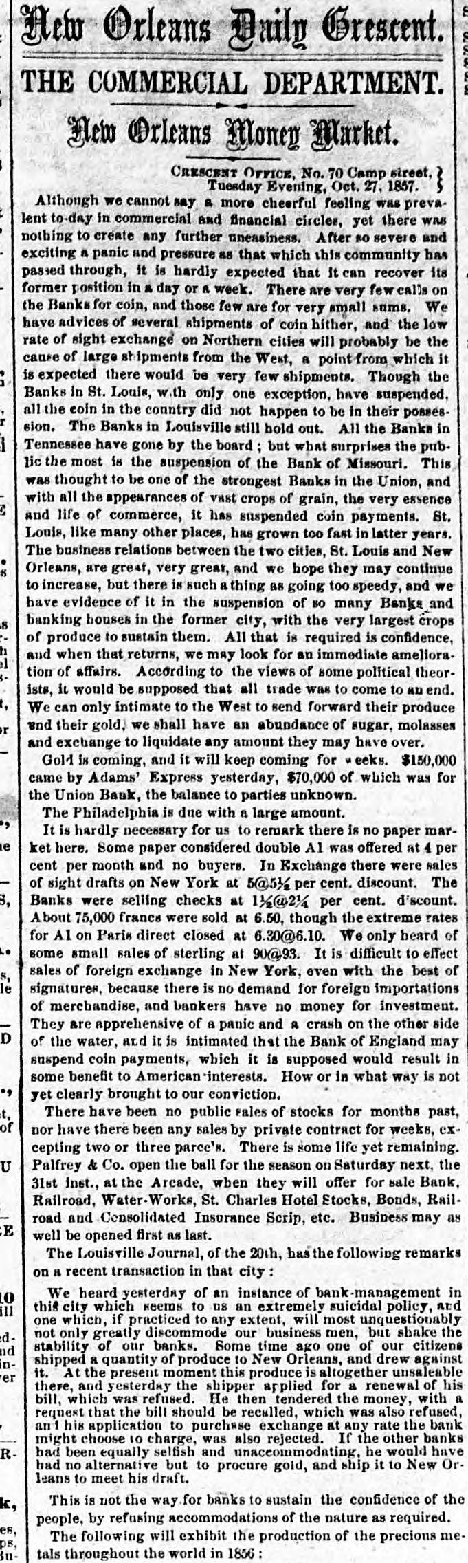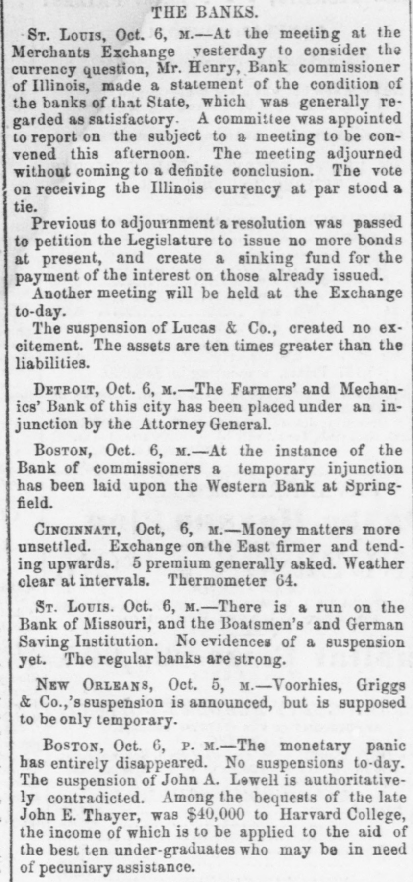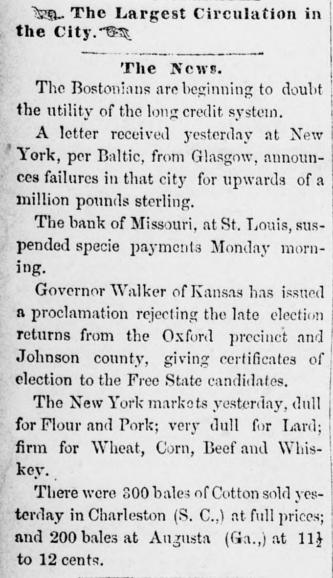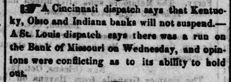 ST. LOUIS CORRESPONDENCE. Sr. LOUIS, Nov. 2d, 1857. FRIEND MAYNARD-NOW that political and financial matters have become stagnant, a stray waif from the Mound City may not prove uninterresting to the readers of the Nonpareil. No place in the West has felt the effects of the panic so effectually as this city owing to the ill-advised, rash, short-sighted and suicidal policy, pursued from the first, that of rejecting good well-secured currency in payment of debts, and in the ordinary channels of trade, and endeavoring to regulate the business of the City upon an exclusive specie basis. Not content with this suidal course, the business men of the city resolved to venture another step in the wrong direction, and which has shown more fully their utter disregard, or rather, want of business policy. I refer to their efforts to depreciate and ruin Illinois currency, in the face of the fact that nearly all of the banking institutions of the State of Illinois are based upon Missouri State Stocks. Therefore, the standing of the Illinois banks depended solely upon the capability of Missouri to keep her credit good-pay up her cou+ pons, and hold up her Stock. The course pursued by St. Louis was not calculated to preserve and uphold the credit of the State-on the contrary, this effort to depreciate Illinois currency, cannot be considered in any other light than as a direct stab at the credit of Missouri. Common sense would have dictated a different policy. As in this case, many will, through jealousy, pursue a course likely to bring ruin upon themselves, merely for the satisfaction of seeing others as deeply in the mud as they are in the mire. The war here upon currency has driven it nearly all from the city, but not from circulation. The most of it has found its way into Northern Illinois and the Eastern portion of Iowa, and there exchanged for grain. This use of currency enables the farmers to pay their home debts, and the grain finds its way Eastward by way of Chicago. Country merchants have received this currency for debts due them-they must use it, if not in St. Louis, why, then in Chicago. The consequence is, that while Chicago has been doing a thriving business, St. Louis and the country dependant thereon has been comparatively motionless and dead-the "hard money" democratic banks, with all their checks and supports, have had to succumb and suspend-and all this cry of depreciated currency,' 'wild-cat banking,' etc., which that party used with such gusto in your State as well as in this, hasrather a farcical look and sound, just now, when the "hardmoney" country of old Missouri suffers the most from the effects of the panic, and the lauded specie-paying old-fogy "Bank of Missouri," has to ask relief from the penalties attending a suspension. This "depreciated paper" of suspended banks-which so shocks the Democracy to extend and circulate-is now our only relief. Let the Banks issue bills, two for one of their paidup capital, and move forward the produce of the West to relieve the East; and, altho' the currency may depreciate ten per cent., yet there would still be forty per cent. in favor of this resort, for crops depreciate fifty per cent. by lying over, in ordinary times; and now, their non-removal would almost ruin us financially. Again, let the Democratic doctrine of "hard-money" apply to the 'hard-fisted laborer!' When currency was "as good as the wheat," he could get his $1,25 to $2 per day-now, he finds no employment, and his income is nothing! I would ask, whether it were not better to have a depreciated' currency like that of Iilinois, than depreciated property and labor? There is one, and only one, solution of the existing financial and commercial lockjaw, at which everybody arrives, that is-could we but move the abundant crops, and send forward the wheat, eorn, pork, etc. of the West, we should be all right. There is plenty of money to accomplish this, but it is in the wrong hands, and confidence, I fear, will not be reinstated soon enough for relief this fa.llThe East begins to see its predicament, and the banks have commenced discounting on produce bills. They must do it or starve. We of the West are all right-plenty to eat and drink, farmers rich and holding out for bigger prices. The recent news from Europe is very encouraging, and from it we already begin to see daylight, and to take courage. It appears that Europe is sending over from one to two millions in specie, by every steamer, to purchase our grain and cotton for shipment. The foreign demand for breadstuffs is likely to cause a greater export than has heretofore been calculated upon. The rot in the potatoe crop of the old country has been enormous, and our produce will be exported to supply the deficiency thus created. They have not cotton enough to run their mills more than three weeks-and all their imports of grain from France and many of the German provinces, are cut off-from the effects of which our prospects brightening everyday, and if I am not greatly mistaken, times will soon be as buoyant and prosperous as they were previous to the advent of the panic. The latest news from the Plains is to the effect that the rear guard of the Utah army passed Fort Kearney Oct. 7th. It is generally considered here that they will not reach Salt Lake this season without great suffering. Our Legislature is now in session, and if we are to judge its concentrated ability by the opinions of the same stripe politically, it could hardly be called an able, dignified as-