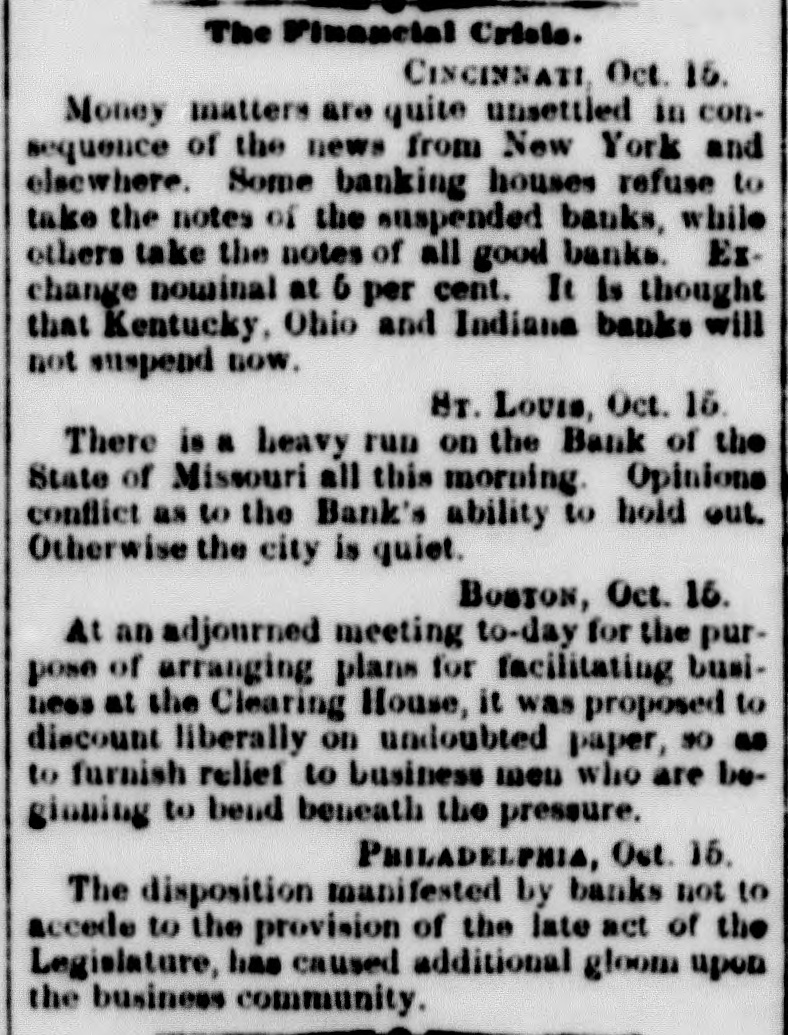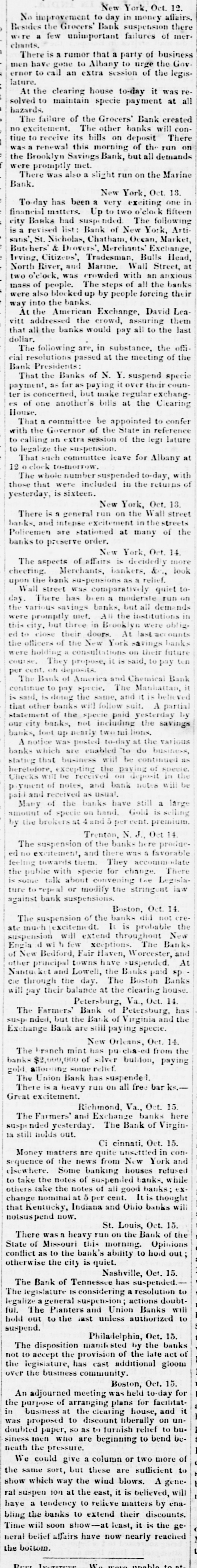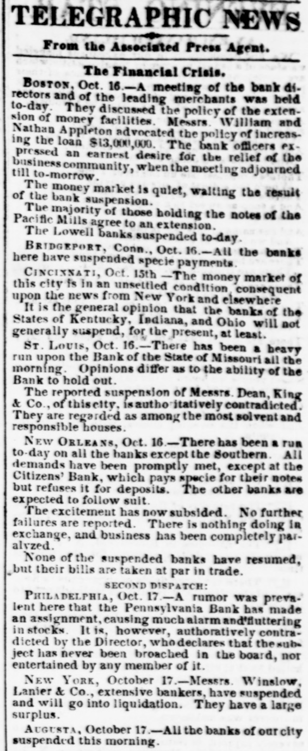 TELEGRAPHIC NEWS From the Associated Press Agent. The Financial Crisis. NEW YORK, Oct. 15.-Business affairsare look. ing more cheerful to-day. The banks are going cie. on as usual, excepting that they pay out no speIt is said that a special agent of Rothschilds came passenger in the Vanderbilt. with orders to buy securities to a large amount. Specie is now abundant and lacks buyers at 1 per eent. The clearing-bouse to-day agreed that all balances may be settled in current funds instead of specie. The banks are working harmoniously together, and things are tending greatly toward a restoration of confidence and revival of business. BOSTON, Oct. 15.-Money continues stringent here. nearly as much so as at any former period. All the mills at Fall River have suspended, and over ment. three thousand operatives are out of employAn adjourned meeting of the bank presidents was held to-day to arrange a plan for facilitating the business of the clearing-house. Their proposed course to discount undoubted paper will furnish great relief to our business men, who are beginning to bend beneath the pressure. Messrs. Little, Alden, & Co. have not suspended, but ask an extension only in behalf of several mills for which they are agents. At Concord, N. H., the banks have not suspended At Manchester, N. H., the banks have suspended. LAWRENCE, Mass., Oct. 11-The banks of this dav. city, and also those in Methuen, suspended toThe Pacific corporation was unable to pay off their hands. SYRACUSE, N. Y., Oct. 14.-A large meeting of the business men and other citizens of this city was held here this evening. Resolutions were passed approving the suspension of specie pay. ments by the banks; pledging themselves to receive and to give currency to the bills of sound State banks for the sake of the business interests of the country, and joining in the request to the Governor to convene the Legislature. All the banks in the city, with the exception of the Manufacturers payments. and Traders', have suspended specie Pratt & Co., a large hardware house, temporarily suspended to-day. BANGOR, Me., Oct. 14.-At a meeting of bank directors, held here this afternoon, it was voted to suspend specie payment during the present crisis. Resolutions were also passed expressing confidence in the Suffolk Bank system, and refusing to take bills not redeemed in Boston. NEW ORLEANS, Oct. 14.-There was considerable excitement here to-day, and three banks were compelled to suspend specie payments. The announcement of this fact increased the panie, but no material run on the other banks followed, except on the Citizens', which experi enced a heavy drain during the balance of the day, but paid everything promptly. LOUISVILLE, Oct. 15.-The Kentucky banks await the action of the New Orleans banks. If the latter suspend the Kentucky banks will do the same. cheerful. The feeling in money matters is generally quite PETERSBURG, Oct. 15.-The branches of the to-day. Virginia and Exchange Banks here suspended RICHMOND, Oct. 15.-The Bank of Virginia here suspended this morning. [SECOND DISPATCH.] NEW ORLEANS, Oct. 5 -The Union and the Mechanics' and Traders' banks, and the Bank of New Orleans, suspended yesterday. Sales of cotton at 9 % a10c. Sr. LOUIS, Oct. 16.-There has been a heavy run on the Bank of the State of Missouri. The ability of the banks to hold out is doubted by some. NASHVILLE, Oct. 16.-The Bank of Tennessee has suspended. The Legislature is considering a bill for legalizing the suspension. NORFOLK, Oct. 16.-The banks here have suspended specie payments this morning.