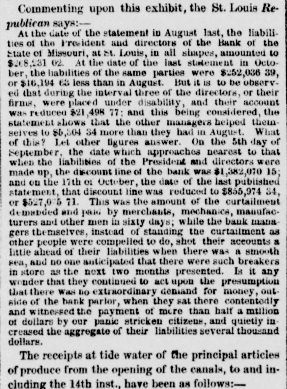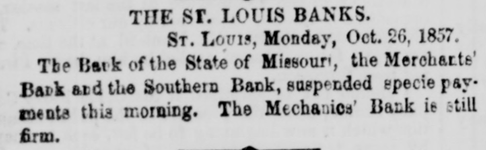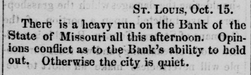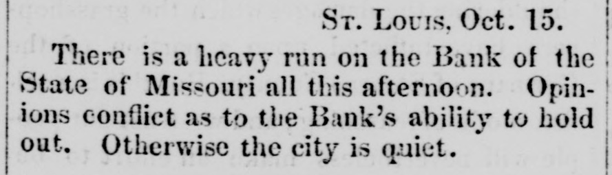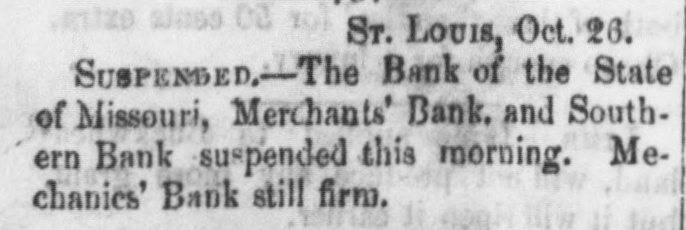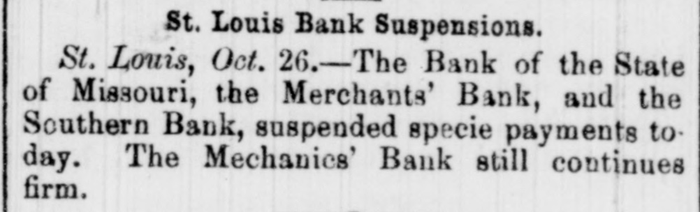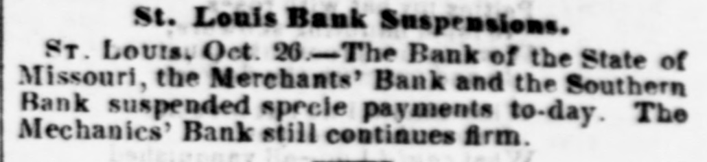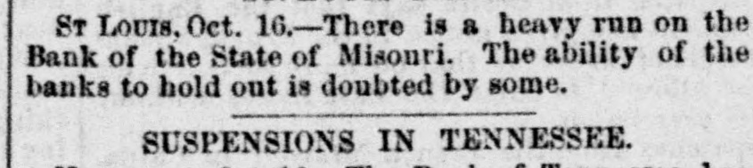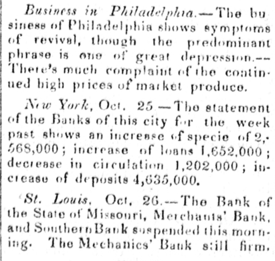 TELEGRAPHIC NEWS From the Associated Press Agent. The Financial Crisis. NEW YORK, Oct. 15.-Business affairsare look. ing more cheerful to-day. The banks are going cie. on as usual, excepting that they pay out no speIt is said that a special agent of Rothschilds came passenger in the Vanderbilt. with orders to buy securities to a large amount. Specie is now abundant and lacks buyers at 1 per eent. The clearing-bouse to-day agreed that all balances may be settled in current funds instead of specie. The banks are working harmoniously together, and things are tending greatly toward a restoration of confidence and revival of business. BOSTON, Oct. 15.-Money continues stringent here. nearly as much so as at any former period. All the mills at Fall River have suspended, and over ment. three thousand operatives are out of employAn adjourned meeting of the bank presidents was held to-day to arrange a plan for facilitating the business of the clearing-house. Their proposed course to discount undoubted paper will furnish great relief to our business men, who are beginning to bend beneath the pressure. Messrs. Little, Alden, & Co. have not suspended, but ask an extension only in behalf of several mills for which they are agents. At Concord, N. H., the banks have not suspended At Manchester, N. H., the banks have suspended. LAWRENCE, Mass., Oct. 11-The banks of this dav. city, and also those in Methuen, suspended toThe Pacific corporation was unable to pay off their hands. SYRACUSE, N. Y., Oct. 14.-A large meeting of the business men and other citizens of this city was held here this evening. Resolutions were passed approving the suspension of specie pay. ments by the banks; pledging themselves to receive and to give currency to the bills of sound State banks for the sake of the business interests of the country, and joining in the request to the Governor to convene the Legislature. All the banks in the city, with the exception of the Manufacturers payments. and Traders', have suspended specie Pratt & Co., a large hardware house, temporarily suspended to-day. BANGOR, Me., Oct. 14.-At a meeting of bank directors, held here this afternoon, it was voted to suspend specie payment during the present crisis. Resolutions were also passed expressing confidence in the Suffolk Bank system, and refusing to take bills not redeemed in Boston. NEW ORLEANS, Oct. 14.-There was considerable excitement here to-day, and three banks were compelled to suspend specie payments. The announcement of this fact increased the panie, but no material run on the other banks followed, except on the Citizens', which experi enced a heavy drain during the balance of the day, but paid everything promptly. LOUISVILLE, Oct. 15.-The Kentucky banks await the action of the New Orleans banks. If the latter suspend the Kentucky banks will do the same. cheerful. The feeling in money matters is generally quite PETERSBURG, Oct. 15.-The branches of the to-day. Virginia and Exchange Banks here suspended RICHMOND, Oct. 15.-The Bank of Virginia here suspended this morning. [SECOND DISPATCH.] NEW ORLEANS, Oct. 5 -The Union and the Mechanics' and Traders' banks, and the Bank of New Orleans, suspended yesterday. Sales of cotton at 9 % a10c. Sr. LOUIS, Oct. 16.-There has been a heavy run on the Bank of the State of Missouri. The ability of the banks to hold out is doubted by some. NASHVILLE, Oct. 16.-The Bank of Tennessee has suspended. The Legislature is considering a bill for legalizing the suspension. NORFOLK, Oct. 16.-The banks here have suspended specie payments this morning.