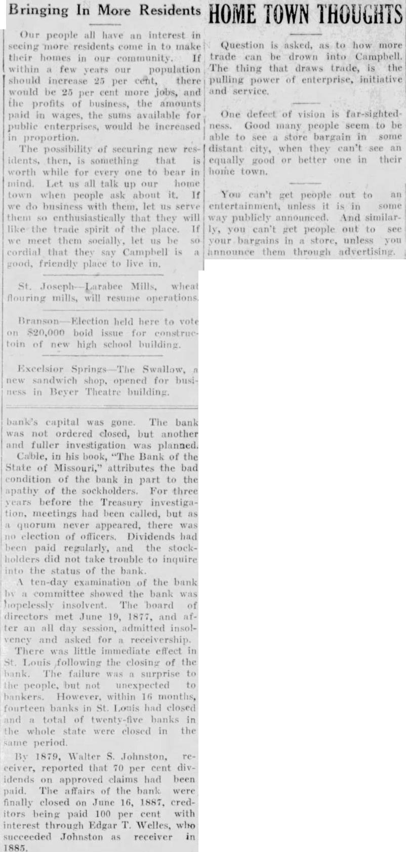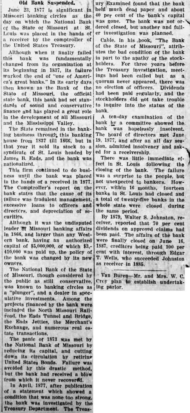 Old Bank Suspended. June 1877 significant Missouri banking circles the day which National Bank the State of Missouri Louis placed in the hands receiver the comptroller United States Treasury. Although when finally failed this bank was fundamentally changed from its organization at its beginning its failure marked the end of of Amerigreat banks. its early days known the Bank the finance and has played great role in the of all Missouri the Mississippi Valley. The State remained in the banksyndicate of Louis headed by James Eads, and the bank was This firm continued to do busiuntil the bank placed the hands received 1877. bank, having authorized known to banking circles "plunger", and dealer in spec- Examined found that the bank much dead paper and about per cent the bank's capital gone. The bank not dered closed, but another and fullinvestigation was planned. Cable. his book, Bank of the State of Missouri", attributes the bad condition of the bank part to the apathy the stockholders. For three years before the Treasury investigation, meetings had been called but quorum never appeared, there was of officers. Dividends had been paid and the stockholders did not take trouble inquire into the status of the bank. ten-day examination of the bank committee showed the bank hopelessly insolvent. The board of directors met June 1877, and after an all day admitted insolvency and for There was little immediate fect in Louis following the closing the bank. The failure surprise to the people, but unexpected to bankers. Howwithin months, fourteen banks in Louis had closed and total of twenty-five banks in the whole state were closed during same period. By 1879, Walter Johnston, ceiver, reported that 70 cent dividends approved claims had been paid. The affairs the bank finally closed on June 1887. creditors being paid 100 per with interest, through Edgar who succeeded Johnston receiver 1885. and Mrs. Croy plan establish undertakparlor