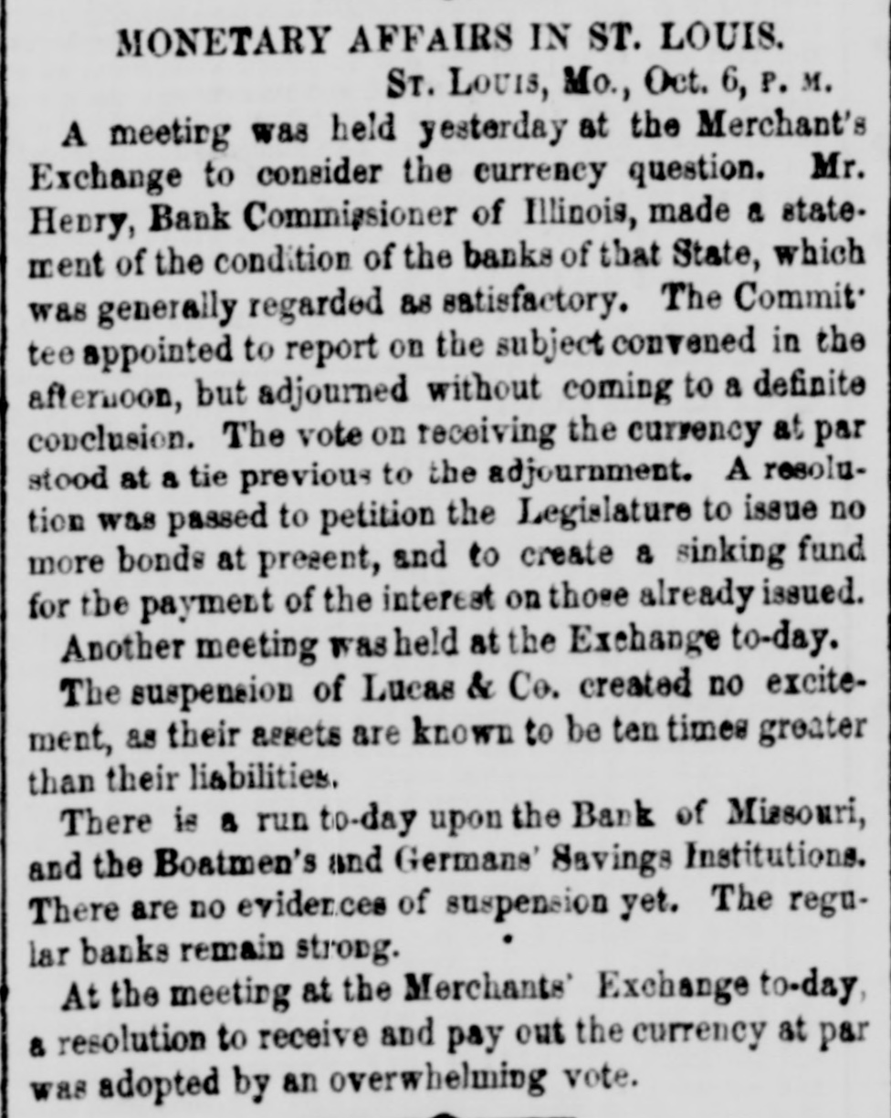 MONETARY AFFAIRS IN ST. LOUIS. Sr. LOUIS, Mo., Oct. 6, P. M. A meeting was held yesterday at the Merchant's Exchange to consider the currency question. Mr. Henry, Bank Commissioner of Illinois, made a statement of the condition of the banks of that State, which was generally regarded as satisfactory. The Commit tee appointed to report on the subject convened in the afternoon, but adjourned without coming to a definite conclusion. The vote on receiving the currency at par stood at a tie previous to the adjournment. A resolution was passed to petition the Legislature to issue no more bonds at present, and to create a sinking fund for the payment of the interest on those already issued. Another meeting was held at the Exchange to-day. The suspension of Lucas & Co. created no excitement, as their assets are known to be ten times greater than their liabilities. There is a run to-day upon the Bank of Missouri, and the Boatmen's and Germans' Savings Institutions. There are no evidences of suspension yet. The regu. lar banks remain strong. At the meeting at the Merchants' Exchange to-day, & resolution to receive and pay out the currency at par was adopted by an overwhelming vote.