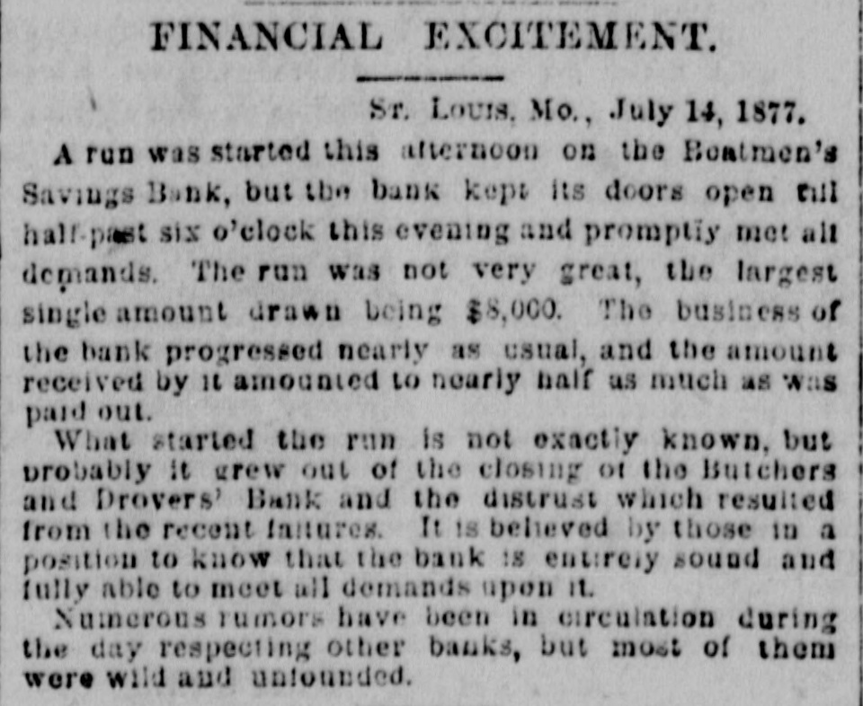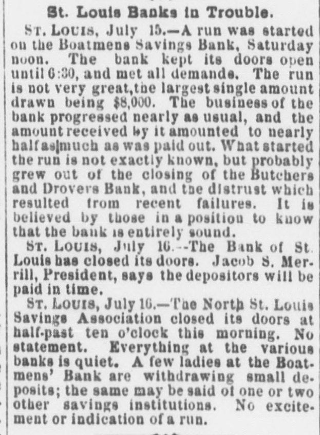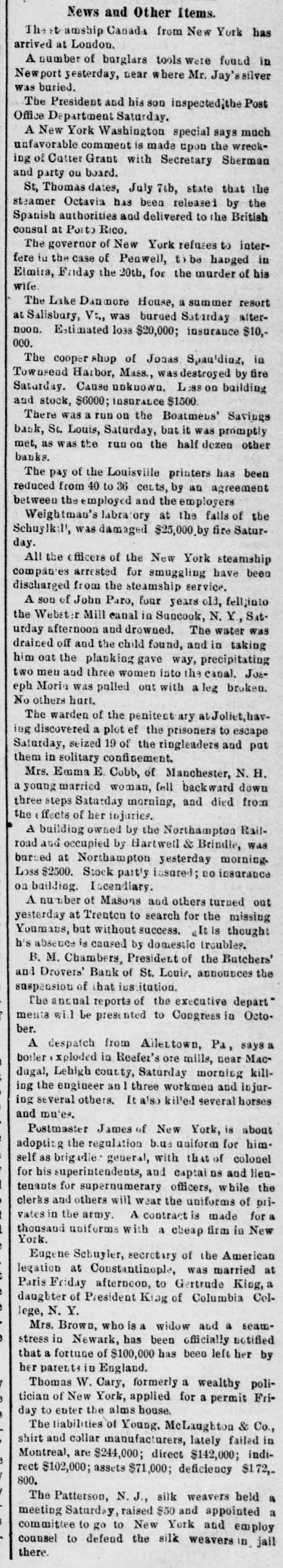 News and Other Items. Thest amship Canada from New York has arrived at London. A number of burglars tools Were found in Newport yesterday, near where Mr. Jay's silver was buried. The President and his son inspected|the Post Office Department Saturday. A New York Washington special says much unfavorable comment is made upon the wrecking of Catter Grant with Secretary Sherman and party ou board. St, Thomas dates, July 7tb, state that the steamer Octavia has been released by the Spanish authorities and delivered to the British consul at Porto Rico. The governor of New York refuses to interfere lu the case of Peawell, tobe hanged in Elmira, Friday the 20th, for the murder of his wife. The Lake Danmore House, a summer resort at Salisbury, Vt., was burned Saturday afternoon. Estimated 1038 $20,000; insurance $10,000. The cooper shop of Joaas Spau'ding, in Townsead Harbor, Mass., was destroyed by fire Saturday. Cause unknown. Less on building and stock, $6000; insurance $1500. There was a runo the Boatmeus' Savings back, St. Louis, Saturday, but it was promptly met, as was the run on the half dezen other banks. The pay of the Louisville printers has been reduced from 40 to 36 cents, by an agreement between the employed and the employers Weightman's labratory at the falls of the Schuylkil', was damaged $25,000 by fire Saturday. All the officers of the New York steamship compánies arrested for smuggling have been discharged from the steamship service. A son of John Paro, four years old, felljinto the Webster Mill canal in Suncook, N. Y, Saturday afternoon and drowned. The water was drained off and the child found, and in taking him out the planking gave way, precipitating two men and three women into the canal. Joseph Morin was pulled out with a leg broken. No others hurt. The warden of the penitent ary at Joliet,haviug discovered a plot ef the prisoners to escape Saturday, seized 19 of the ringleaders and put them in solitary confinement. Mrs. Emma E. Cobb, of Manchester, N. H. a young married woman, fell backward down three steps Saturday morning, and died from the ffects of her injuries. A building owned by the Northampton Railroad and occupied by Hartwell & Brindle, was bursed at Northampton yesterday morningLoss $2500. Stock part'y issured; DO insurance on building. Incendiary. A number of Masons and others turned out yesterday at Trenten to search for the missing Youmans, but without success. It is thought h's absence is caused by domestic troubles. B. M. Chambers, President of the Butchers' and Drovers' Bank of St. Louis, announces the suspension of that institution. The annual reports of the executive depart mental will be presented to Congress in Octo. ber. A despatch from AileLtown, Pa, says a botler xploded in Reefer's ore mills, near Macdugal, Lehigh county, Saturday morning killing the engineer an three workmen and injuring several others. It also killed several horses and mu'es. Postmaster James of New York, is about adopting the regulation b.ue uniform for him. self as brigadle. general, with that of colonel for his superintendents, and captains and lieutenants for supernumerary officers, while the clerks and others will wear the uniforms of priI vates in the army. A contract is made for a 1 thousand uniforms with a cheap firm in New York. Eugene Schuyler, secretary of the American legation at Constantinople, was married at t Paris Friday afternoon, to Gertrude King, a ) daugbter of President Kiag of Columbia Col) lege, N. Y. Mrs. Brown, who is a widow and a seam, stress in Newark, has been officially notified that a fortune of $100,000 has been left her by her parents in England. 7 Thomas W. Cary, formerly a wealthy poli) tician of New York, applied for a permit Friday to enter the alms house. , The liabilities of Young. McLaughton & Co., , shirt and collar manufacturers, lately failed in Montreal, are $244,000; direct $142,000; indie rect $102,000; assets $71,000; deficiency $172,. / 800. / The Patterson, N. J., silk weavers held a meeting Saturday, raised $50 and appointed a $ committee to go to New York and employ counsel to defend the silk weavers in jail there.