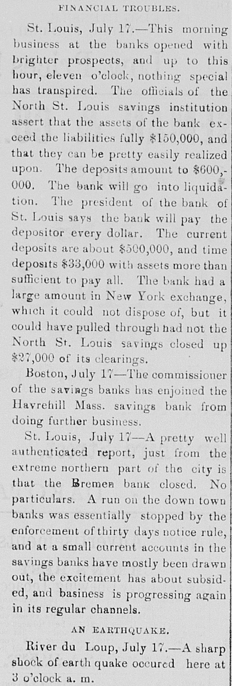 FINANCIAL TROUBLES. St. Louis, July 17.-This morning business at the banks opened with brighter prospects, and up to this hour, eleven o'clock, nothing special has transpired. The officials of the North St. Louis savings institution assert that the assets of the bank exceed the liabilities fully $150,000, and that they can be pretty easily realized upon. The deposits amount to $600,000. The bank will go into liquidation. The president of the bank of St. Louis says the bank will pay the depositor every dollar. The current deposits are about $500,000, and time deposits $33,000 with assets more than sufficient to pay all. The bank had a large amount in New York exchange, which it could not dispose of, but it could have pulled through had not the North St. Louis savings closed up $27,000 of its clearings. Boston, July 17-The commissioner of the savings banks has enjoined the Havrehill Mass. savings bank from doing further business. St. Louis, July 17-A pretty well authenticated report, just from the extreme northern part of the city is that the Bremen bank closed. No particulars. A run on the down town banks was essentially stopped by the enforcement of thirty days notice rule, and at a small current accounts in the savings banks have mostly been drawn out, the excitement has about subsided, and basiness is progressing again in its regular channels. AN EARTHQUAKE. River du Loup, July 17.-A sharp shock of earth quake occured here at 3 o'clock a. m.