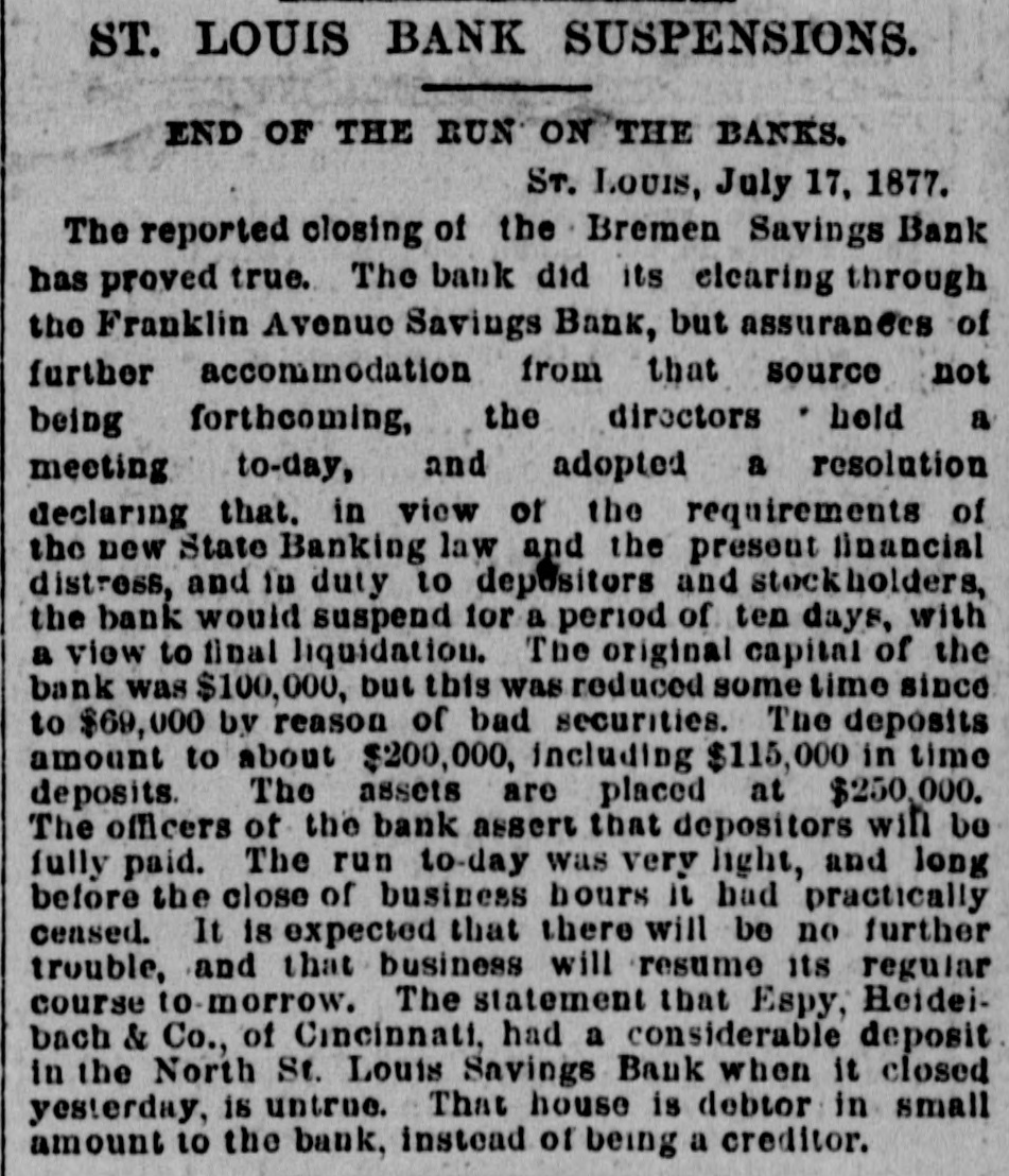ST. LOUIS BANK SUSPENSIONS. END OF THE RUN ON THE BANKS. Sr. LOUIS, July 17, 1877. The reported closing of the Bremen Savings Bank has proved true. The bank did its clearing through the Franklin Avenue Savings Bank, but assurances of further accommodation from that source not being forthcoming, the directors hold a meeting to-day, and adopted a resolution declaring that. in view or the requirements of the new State Banking law and the present financial distress, and in duty to depositors and stock holders, the bank would suspend for a period of ten days, with a view to final liquidation. The original capital of the bank was $100,000, but this was reduced some time since to $69,000 by reason of bad securities. The deposits amount to about $200,000, including $115,000 in time deposits. The assets are placed at $250,000. The officers of the bank assert that depositors will be fully paid. The run 10-day was very light, and long before the close of business hours it had practically censed. It is expected that there will be no further trouble, and that business will resume its regular course to morrow. The statement that Espy, Heideibach & Co., of Cincinnati, had a considerable deposit in the North St. Louis Savings Bank when it closed yesterday, is untrue. That house is debtor in small amount to the bank, instead of being a creditor.