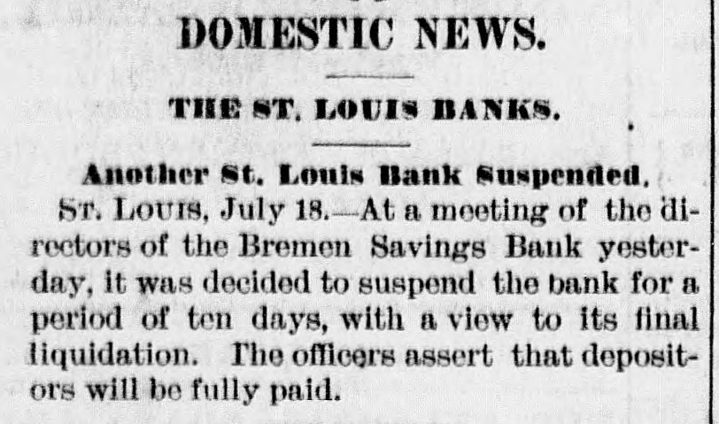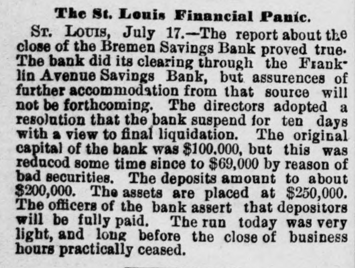 Contemporary reports (Jul 17-18, 1877) state a light run on downtown St. Louis banks, and that the Bremen Savings Bank 'closed' and the directors resolved to suspend for ten days 'with a view to final liquidation.' Assets were reported impaired (capital reduced from $100,000 to $69,000 by bad securities). Classified as run → suspension → closure (final liquidation was intended and it is listed among failed banks).