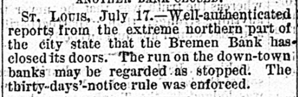 ST. Louis, July 17. - -Well-authenticated reports from the extreme northern part of the city state that the Bremen Bank has closed its doors. The run on the down-town banks may be regarded as stopped. The tbirty-days'-notice rule was enforced.