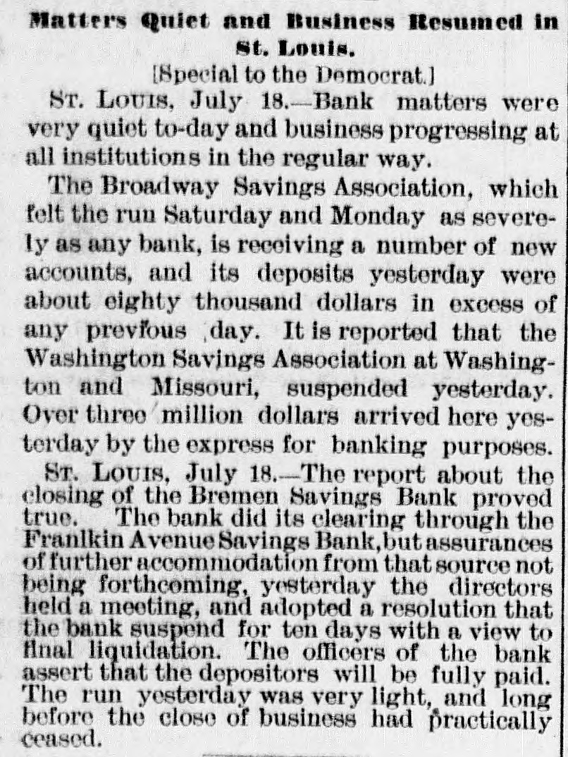 Matters Quiet and Business Resumed in St. Louis. [Special to the Democrat.] ST. LOUIS, July 18.-Bank matters were very quiet to-day and business progressing at all institutions in the regular way. The Broadway Savings Association, which felt the run Saturday and Monday as severely as any bank, is receiving a number of new accounts, and its deposits yesterday were about eighty thousand dollars in excess of any previous day. It is reported that the Washington Savings Association at Washington and Missouri, suspended yesterday. Over three million dollars arrived here yesterday by the express for banking purposes. ST. LOUIS, July 18.-The report about the closing of the Bremen Savings Bank proved true. The bank did its clearing through the Franlkin Avenue Savings Bank, but assurances of further accommodation from that source not being forthcoming, yesterday the directors held a meeting, and adopted a resolution that the bank suspend for ten days with a view to final liquidation. The officers of the bank assert that the depositors will be fully paid. The run yesterday was very light, and long before the close of business had practically ceased.