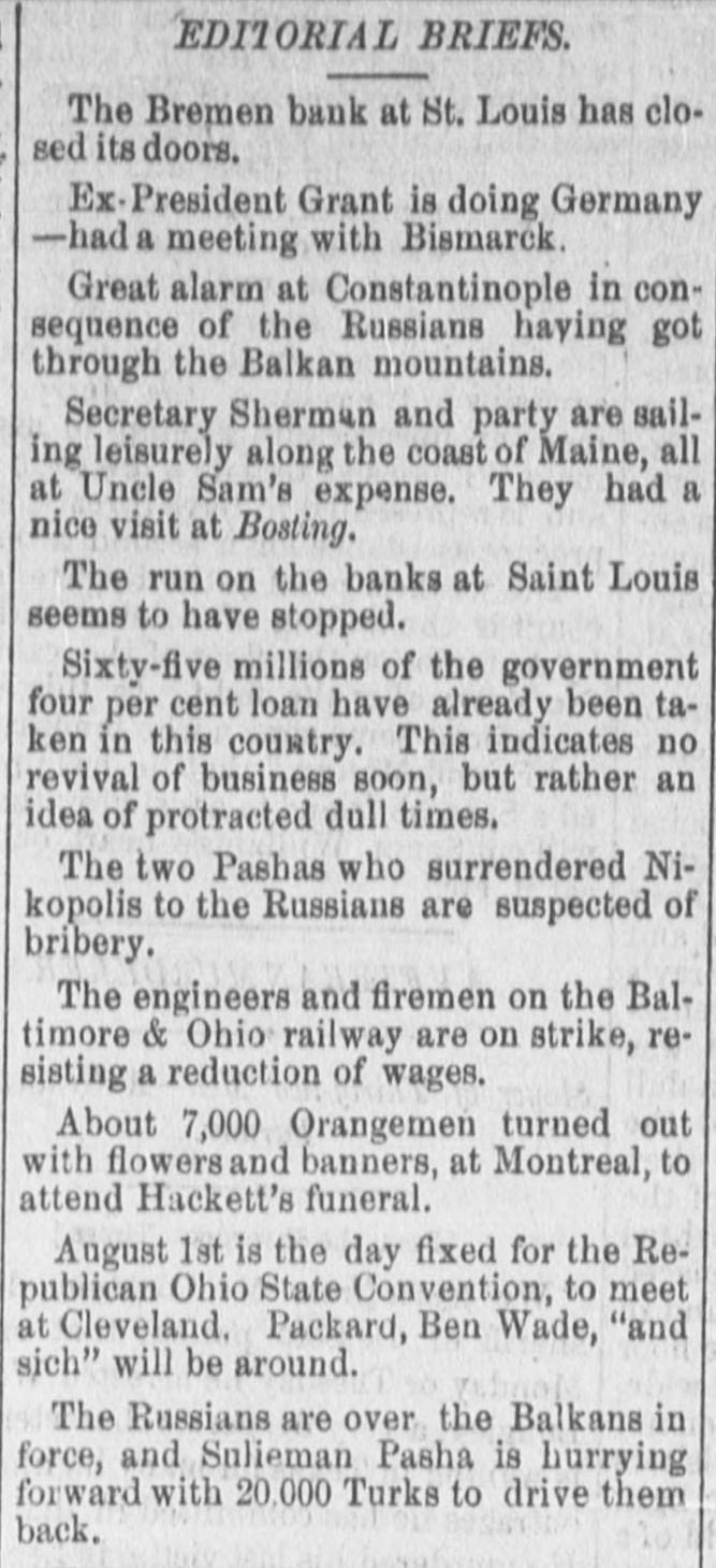 EDITORIAL BRIEFS. The Bremen bank at St. Louis has closed its doors. Ex- President Grant is doing Germany -had a meeting with Bismarck. Great alarm at Constantinople in consequence of the Russians haying got through the Balkan mountains. Secretary Sherman and party are sailing leisurely along the coast of Maine, all at Uncle Sam's expense. They had a nice visit at Bosting. The run on the banks at Saint Louis seems to have stopped. Sixty-five millions of the government four per cent loan have already been taken in this country. This indicates no revival of business soon, but rather an idea of protracted dull times. The two Pashas who surrendered Nikopolis to the Russians are suspected of bribery. The engineers and firemen on the Baltimore & Ohio railway are on strike, resisting a reduction of wages. About 7,000 Orangemen turned out with flowers and banners, at Montreal, to attend Hackett's funeral. August 1st is the day fixed for the Republican Ohio State Convention, to meet at Cleveland. Packard, Ben Wade, "and sich" will be around. The Russians are over the Balkans in force, and Sulieman Pasha is hurrying forward with 20.000 Turks to drive them back.
