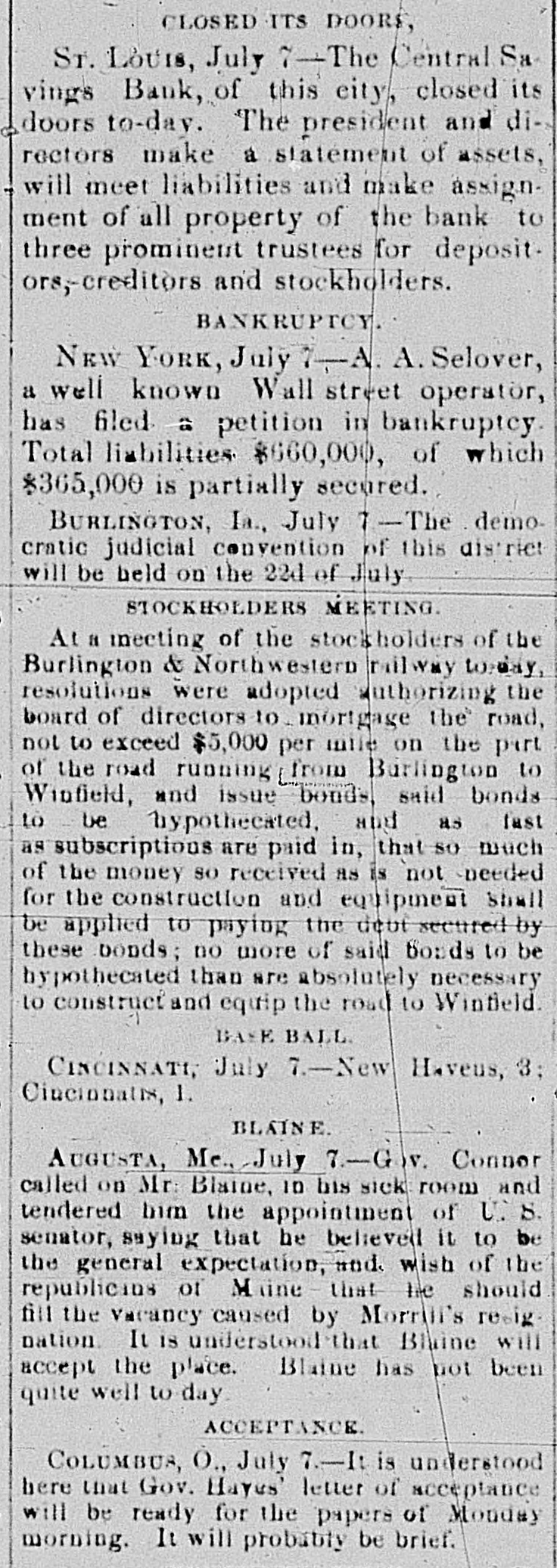 CLOSED ITS DOORS, Sr. LOUIS, July 7 - The Central Sa vings Bank, of this city, closed its doors to-day. The president and directors make a statement of assets, will meet liabilities and make assignment of all property of the bank to three prominent trustees for deposit ors,-creditors and stockholders. BANKRUPTCY. NEW YORK, July 7-A. A. Selover, a well known Wall street operator, has filed a petition in bankruptcy. Total liabilities $660,000, of which *365,000 is partially secured. BURLINGTON, Ia., July -The democratic judicial convention of this district will be held on the 22d of July STOCKHOLDERS MEETING. At a meeting of the stock holders of the Burlington & Northwestern railway today, resolutions were adopted authorizing the board of directors to mortgage the road, not to exceed $5,000 per mile on the part of the road running from Burlington to Winfield, and issue bonds said bonds to be hypothecated, and as last as subscriptious are paid in, that so much of the money so received as is not needed for the construction and equipment shall be applied to paying the deut secured by these bonds; no more of said bonds to be hypothecated than are absolutely necessary to construct and equip the road to Wintield. BASE BALL. CINCINNATI, July 7.-New Haveus, 3: Cincionalis, 1. BLAINE AUGUSTA, Me. July 7.-Gov. Connor called on Mr Blatne, 10 his sick room and tendered him the appointment of U.S. senator, saying that be believed it to be the general expectation, and wish of the republicios of Maine - that lie should fill the Vacancy caused by Morrill's re-ig nation It IS understood that Bluine will accept the place. Blaine has not been quite well to day ACCEPTANCE COLUMBUS, O., July 7.-I: is understood here that Gov. Hayus' letter of acceptance will be ready for the papers of Monday morning. It will probably be brief.