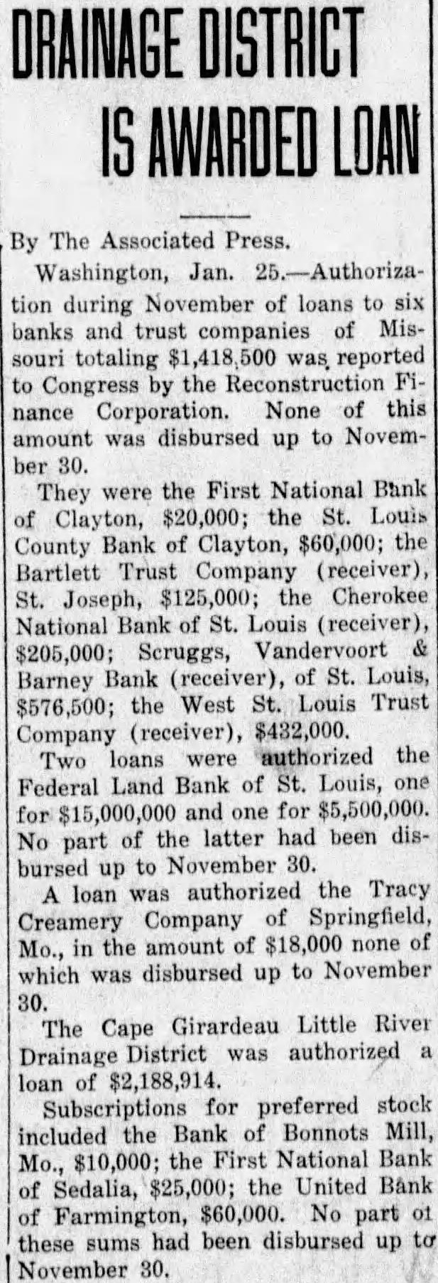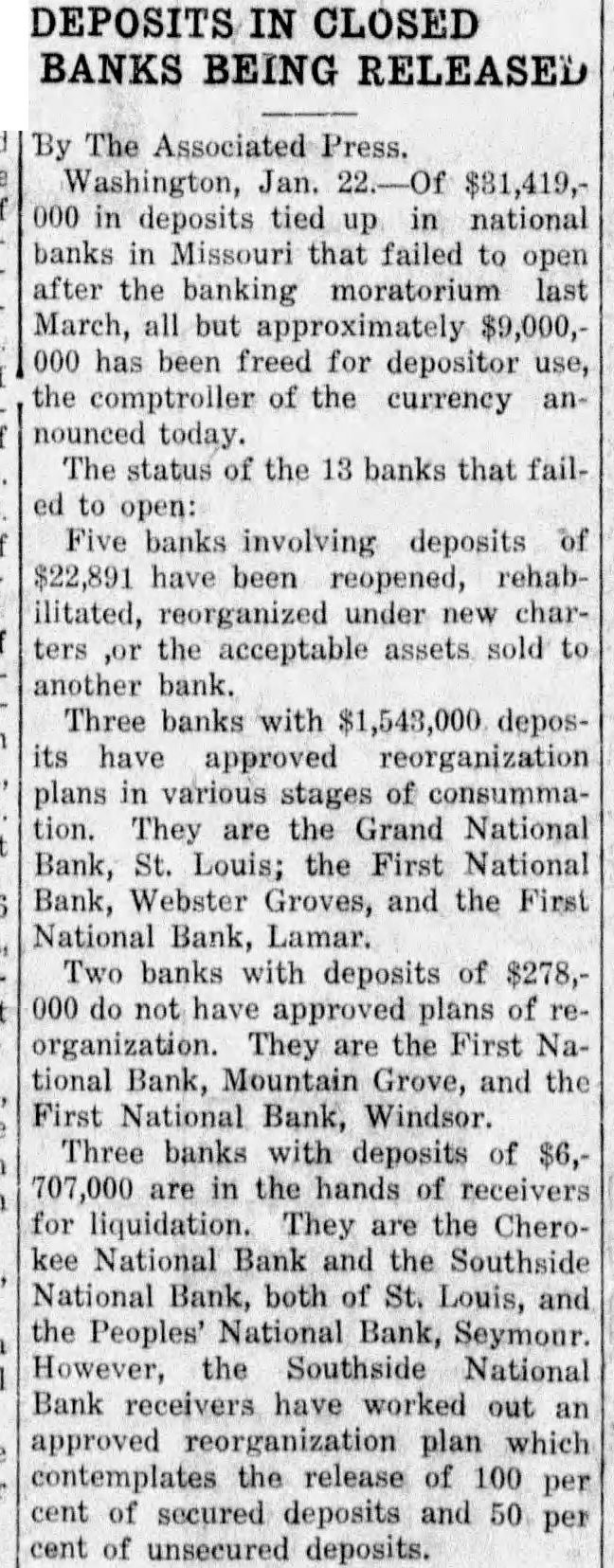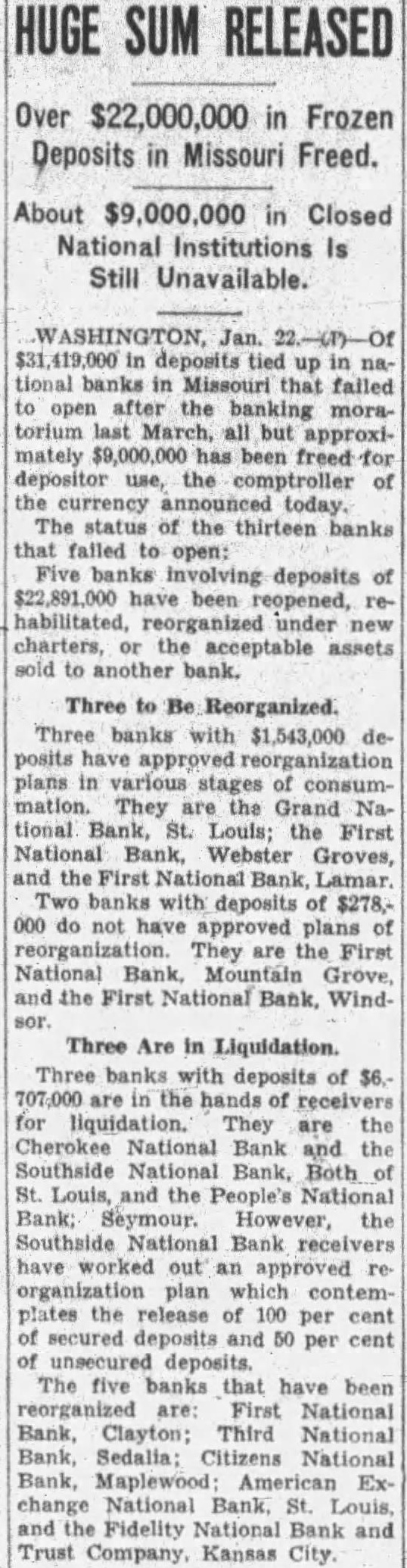HUGE SUM RELEASED Over $22,000,000 in Frozen Deposits in Missouri Freed. About $9,000,000 in Closed National Institutions Is Still Unavailable. Jan. deposits tied up tional banks Missouri failed open after the banking moratorium but approximately $9,000,000 has been for depositor the comptroller currency today. The status of the thirteen banks failed open: Five banks involving deposits of have been reopened, habilitated, reorganized under charters, the acceptable assets sold to another bank. Three to Be Reorganized. Three banks with $1,543,000 deposits plans stages consumThey are the Grand National Bank, Louis; the National Bank, Webster the Bank, Lamar. banks deposits of $278,000 not They the First National Bank, Grove, and the First National Bank, Wind- Three Are in Liquidation Three banks with deposits of 707,000 in the for They are the Cherokee National Bank and the Southside National Bank, Both St. Louis, the People's National Bank; the National out organization plan plates the release of 100 per cent secured deposits 50 per unsecured deposits. The five banks have been reorganized First National Bank, Third National Bank, National Bank, Exchange National Bank, Louis, and the Fidelity National Trust Company, Kansas City.