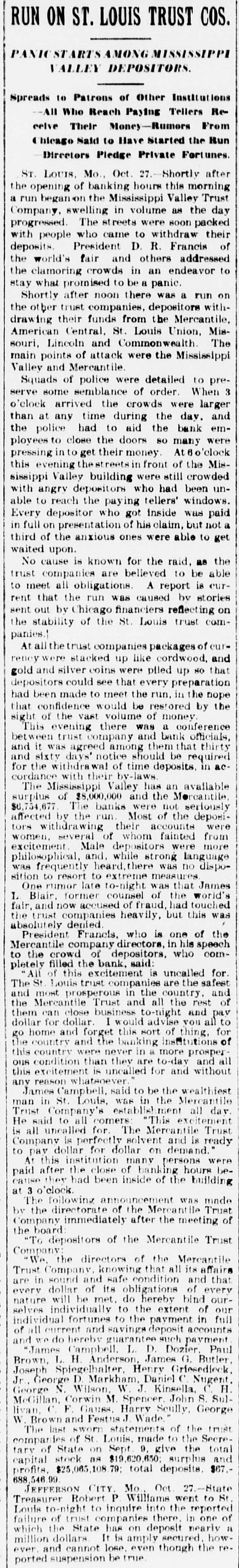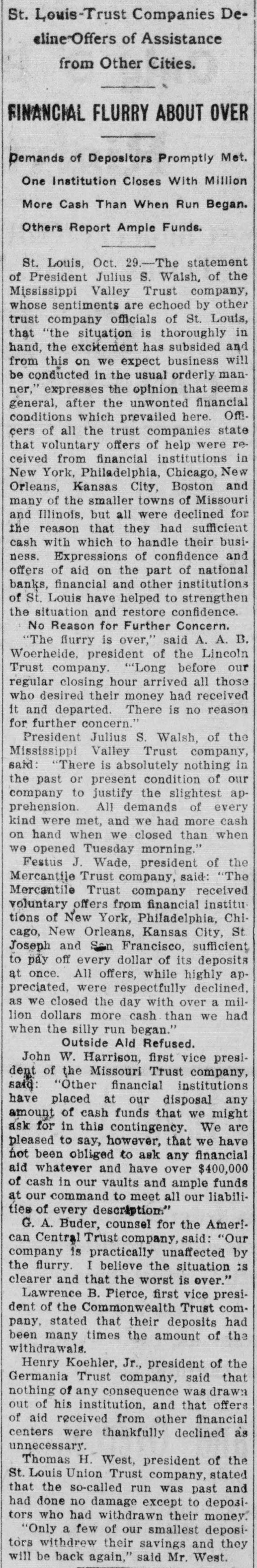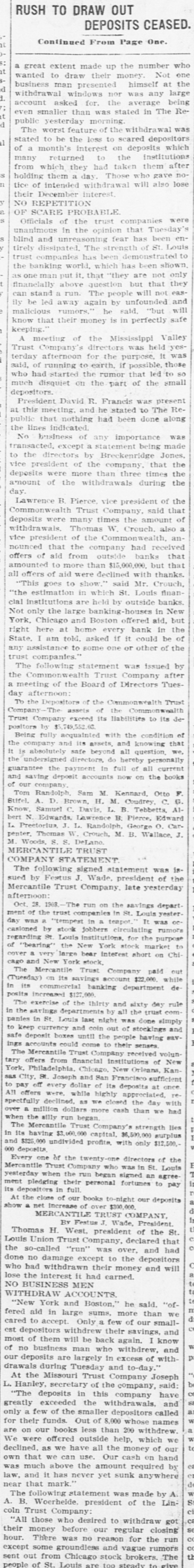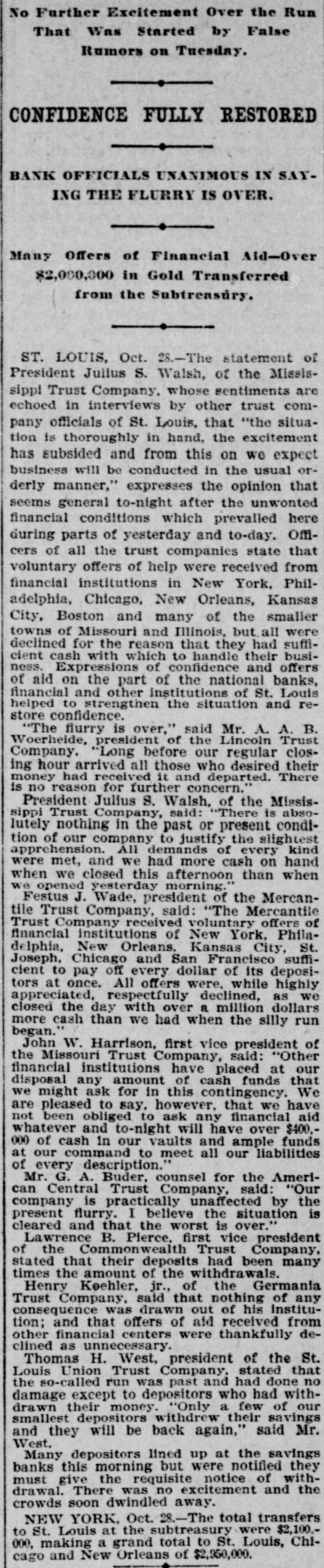 MALICIOUS CHICAGO RUMORS CAUSED WITHDRAWALS. Continued From Page One. started as the preliminary to a bear raid on the stock market. Mr. Buder said: "For ten days we have been receiving queries from Chicago asking the general financial con Ition of the St. Louis trust companies. None of these queries were from banks or trust companies. "It is significant that all the queries, both of phone and wire, were entirely from brokers, while our correspondents among the banks have not troubled us for information. "There is little doubt that the rumors are maliclously intended to create a feeling of distrust, and that they are designed to further the plans of stock dealers who have sold the market short. "This stock market is on the rise, and the 'shorts' have started this rumor to enable themselves to cover their shortages. "There is not a word of truth in the rumors, and I am cofident that there will be no repetition of the scenes of this afternoon, to-morrow, as the folly of their action in withdrawing their funds and losing the interest will be soon seen by those who withdrew to-day." KOEHLER MAKES STATEMENT. Henry Koehler, Jr., president of the Germania Trust Company, made the following statement to The Republic of his understanding of the start of the run on St. Louis trust companies: "All this trouble was caused by a rumor sent out from the Chicago stock market. There are many who have sold the market short in Chicago, and as stocks have reached their absolutely lowest legitimate level for some time. a way to break the rising market and enable the "shorts" to cover was sought. "The flurry cannot last over to-morrow, as there never was a time when our banks and trust companies were in better condition than to-day. The mere fact that they were able to supply the money for moving the cotton crop should allay all fears as to the stability of the institutions. "We have had no run here: in fact. our deposits of savings have been greater today than they have been for some time. "The rumor sent out from Chicago was absolutely without foundation and was malicious in the extreme. It did not. I understand. specify any particular institution. but spoke of the largest. This absence of definiteness is proof of the falsity of the rumor." NO LARGE WITHDRAWALS. At the Commonwealth Trust Company officials stated that, while their business for the day had been larger than usual, no large depositors had presented their pass books to the savings department with a check to close account. All of the withdrawals were of small accounts. A crowd gathered in front of the Missouri Trust Company for a short time late in the afternoon, and some depositors withdrew small accounts. Officials of the company made the statement that the company was absolutely solvent and would pay depositors accounts as fast as they could be verified and the money counted out. At a meeting of the officers of all the trust companies last night, it was agreed that in the withdrawal of savings accounts, hereafter, thirty days' notice would be required from depositors of less than $100 and sixty days' notice from those who wished to withdraw more than that amount. This action covers not only the present, but will be invariably required from all depositors In the savings department. This is in accordance with the rules of the institutions. although It has not been recently enforced. Demand certificates will be paid as they matgre, while current accounts will be subject to check as usual.