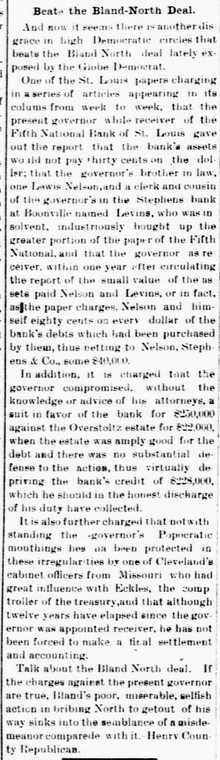 # Beate the Bland-North Deal. And now it seems there is another disgrace in high Democratic circles that beats the Bland North deal lately exposed by the Globe Democrat. One of the St. Louis papers charging in a series of articles appearing in its colums from week to week, that the present governor while receiver of the Fifth National Bank of St. Louis gave out the report that the bank's assets would not pay thirty cents on the dol-Isr; that the governor's brother in law, one Lewis Nelson, and a clerk and cousin of the governor's in the Stephens bank at Boonville named Levins, who was in solvent, industriously bought up the greater portion of the paper of the Fifth National, and that the governor as receiver, within one year after circulating the report of the small value of the assets paid Nelson and Levins, or in fact, as the paper charges, Nelson and himself eighty cents on every dollar of the bank's debts which had been purchased by them, thus netting to Nelson, Stephens & Co., some $40,000. In addition, it is charged that the governor compromised, without the knowledge or advice of his attorneys, a suit in favor of the bank for $250,000 against the Overstoltz estate for $22,000, when the estate was amply good for the debt and there was no substantial defense to the action, thus virtually depriving the bank's credit of $228,000, which he should in the honest discharge of his duty have collected. It is also further charged that notwithstanding the governor's Popocratie mouthings hes na been protected in these irregularities by one of Cleveland's cabinet officers from Missouri who had great influence with Eckles, the comptroller of the treasury, and that although twelve years have elapsed since the governor was appointed receiver, he has not been forced to make a final settlement and accounting. Talk about the Bland North deal. If the charges against the present governor are true, Bland's poor, miserable, selfish action in bribing North to getout of his way sinks into the semblance of a misdemeanor comparede with it.-Henry County Republican.