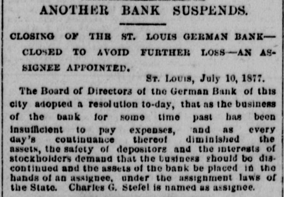 ANOTHER BANK SUSPENDS. CLOSING OF THE ST. LOUIS GERMAN BANKCLOSED TO AVOID FURTHER LOSS-AN ASSIGNEE APPOINTED. ST. Louis, July 10, 1877. The Board of Directors of the German Bank of this city adopted a resolution to-day, that as the business of the bank for some time past has been insufficient to pay expenses, and as every day's continuance thereof diminished the assets, the safety of depositors and the interests of stockholders demand that the business should be diacontinued and the assets of the bank be placed in the hands of an assignee, under the assignment laws of the State. Charles G. Stefel is named as assignee.
