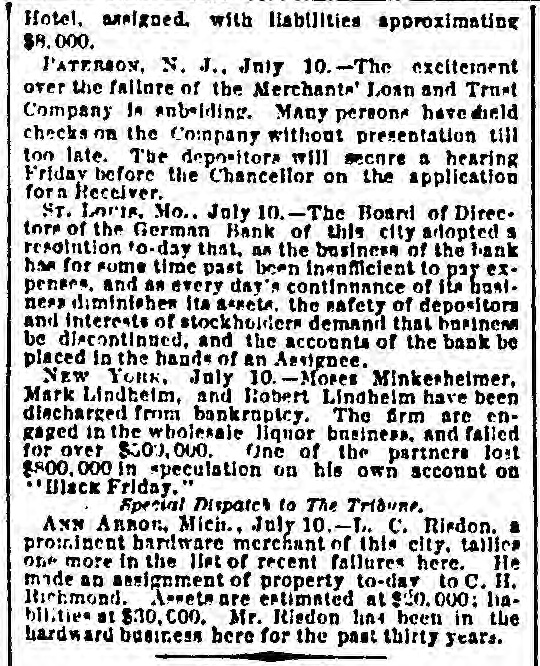 Hotel, assigned. with liabilities approximation $8.000. l'ATERION. N. J., July -The excitement over the failure of the Merchants' Loan and Trust Company in emboliding. Many persons have dield checks on the Company without presentation till too late. The depositors will secore a hearing Friday before the Chancellor on the application for a Receiver. ST. Loris, Mo., July 10.-The Board of Direc. tore of the German Bank of this city adopted $ resolution to -day that, an the business of the bank has for some time past been inenficient to pay expeners, and as every day's continnance of its basi. ness diminisher its assets. the safety of depositors and interests of stockholders demand that business be discontinued, and the accounts of the bank be placed in the hands of an Assignee. NEW YORK, July 10. Moses Minkerheimer, Mark Lindhelm, and Robert Lindheim have been discharged from bankraptcy. The firm are engaged in the wholesale liquor business. and failed for over $300,000. One of the partners lost $800, 000 in speculation on his own account on 'Black Friday." Special Dispatch to The Tridune. ANN ARROR, Mich., July 10.- c. Risdon. a prominent handware merchant of this city. tallics one more in the Net of recent failures here. He mode an assignment of property to-day to C. II. Richmond. A--eta are estimated at sdo. 000: liabilities at $30,000. Mr. Riedon line been in the hardward business here for the past thirty years.